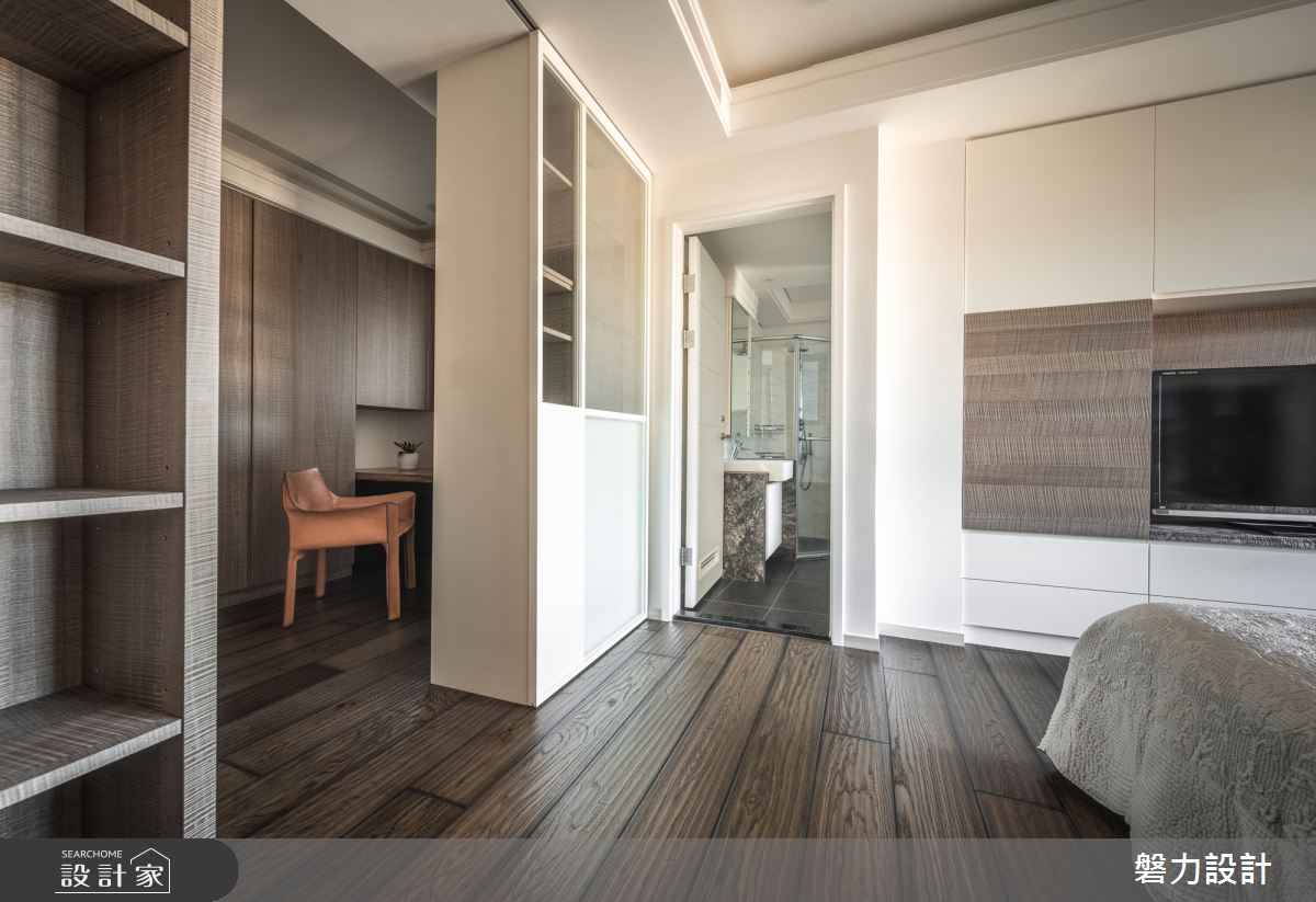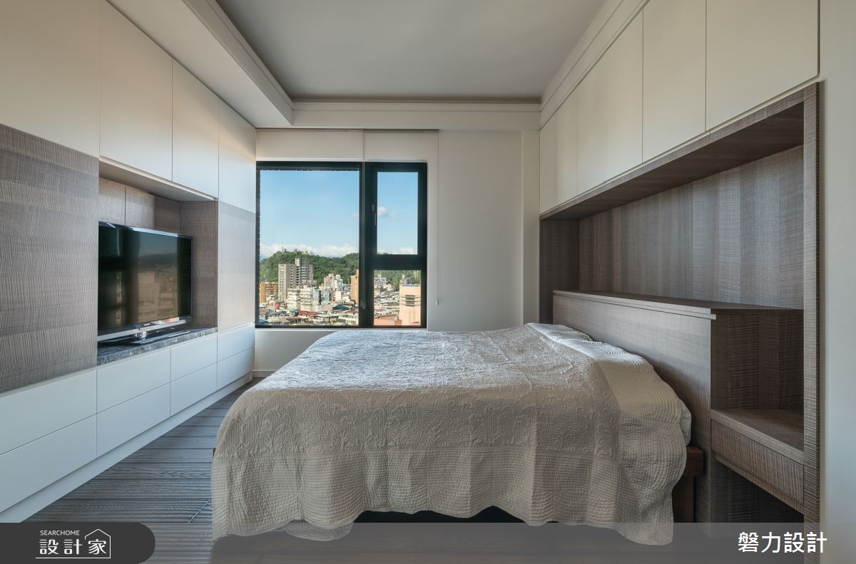 主臥室裡,結合大量的木紋肌理,以及收納設計,且引入最美的戶外景緻,與空間裡簡約的木紋相互呼應,創造溫潤的休憩環境。