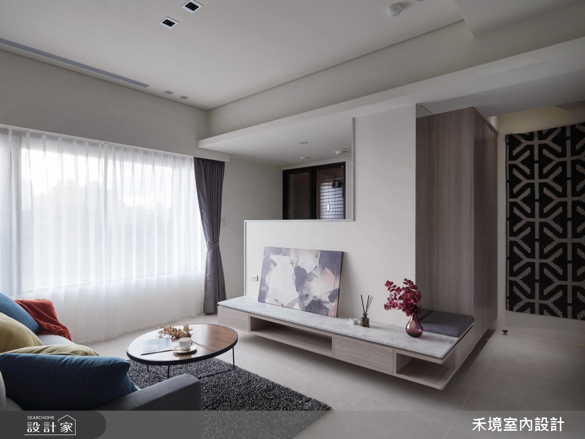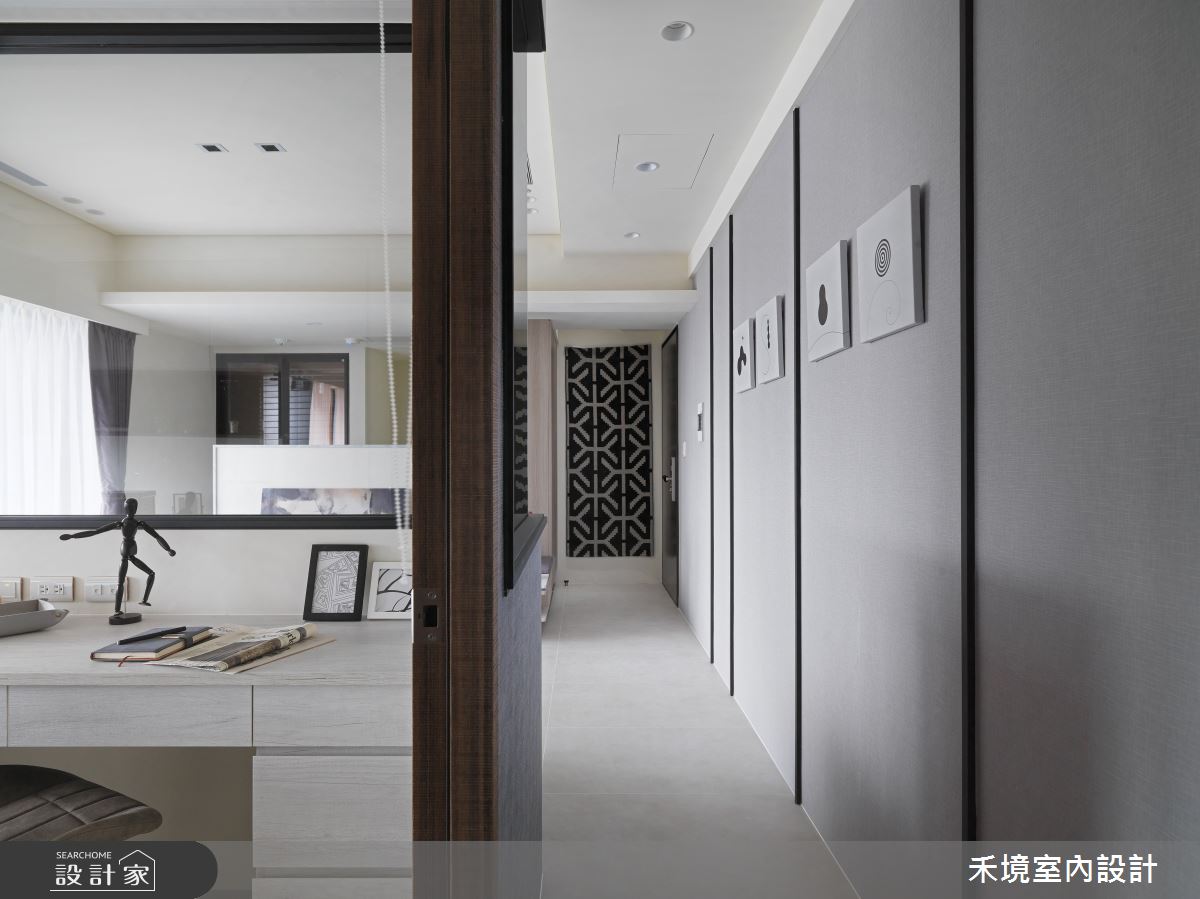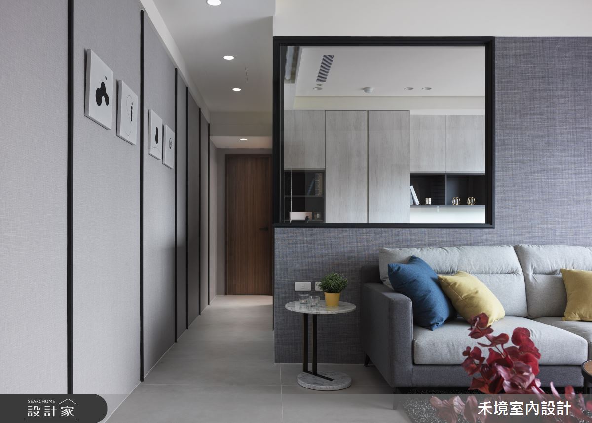 礙於空間有限,巧妙將玄關櫃結合電視牆,以多功能共享櫃體界定玄關領域,轉角處更配置展檯面與穿鞋椅,形成流暢的動線轉場,讓視覺有所緩衝;公領域整體採以純凈的空間基底,以溫和牆色與黑色框架線條做妝點,圍塑出乾凈清爽的休閒視野,並破除既有實牆隔間,利用玻璃保留視覺穿透性,串起書房、客廳的關係,讓公領域享有更開闊的視覺體驗,也讓光亮得以盈滿室內;而廊道則裝飾掛畫點綴立面,為素雅的牆面瞬間增色,創造不一樣的居家風景!