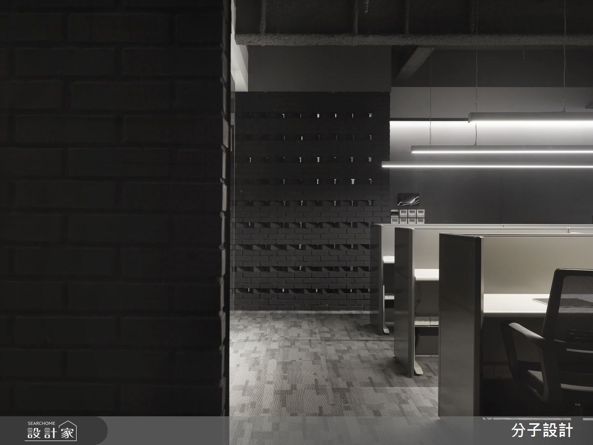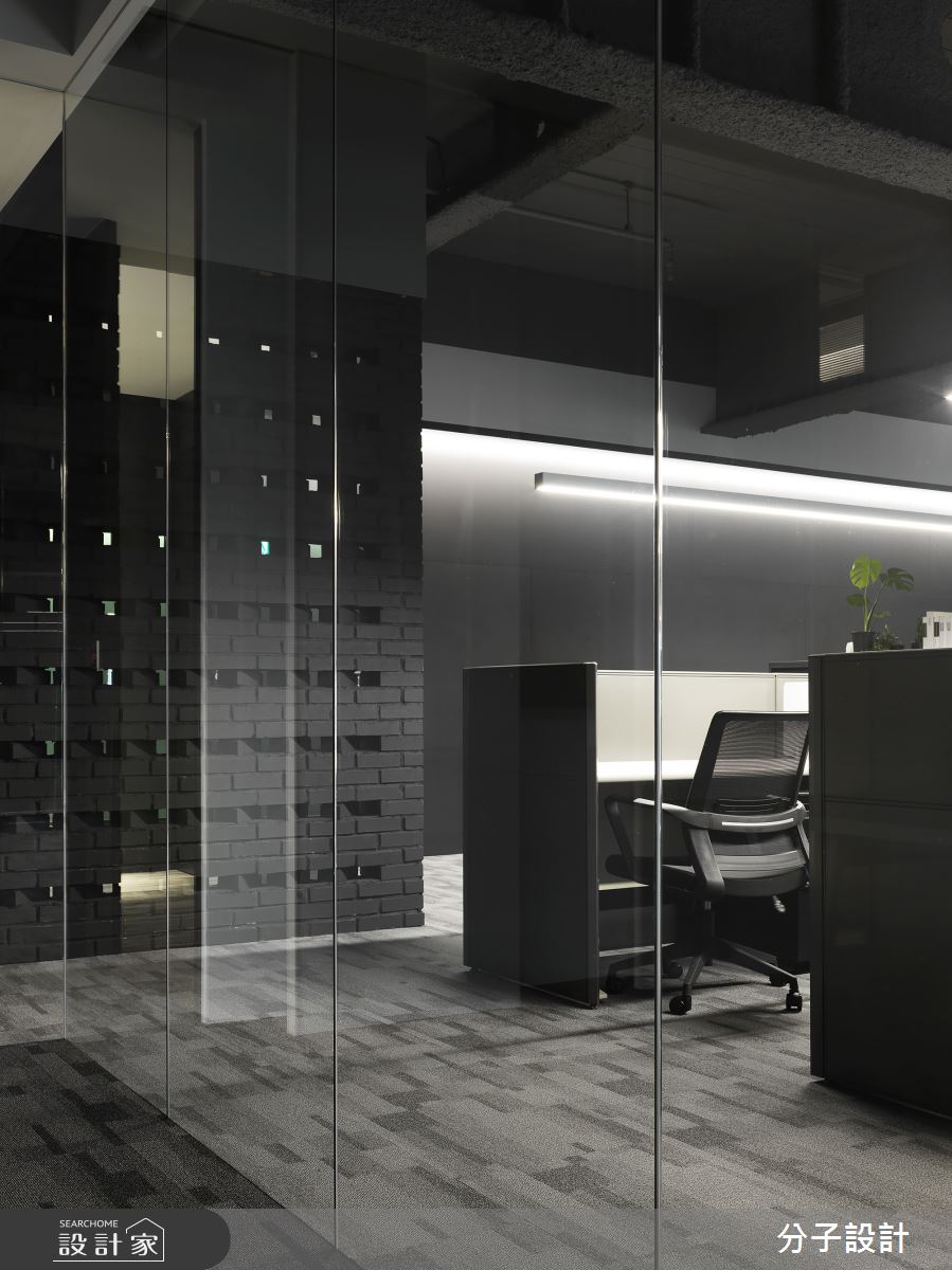 這間擁有58坪的辦公室,位於高樓層獨享窗外美景,但因為空間深度過深,光線較不易進入內部,因此設計師反其道而行,採用神秘的黑色為主色調,並以燈光賦予特別的工作氛圍。入口處特殊形式的磚牆為空間開啟序幕。開放式的座位區,即使使用深色也不顯得狹窄;會議室以玻璃隔間,令採光得以通透,懸吊式圓形吊燈為空間增加一絲設計感,而壁面採用可書寫的黑板漆方便會議溝通,最特別的是落地窗利用高低錯落的黑色遮版帶來律動與層次。