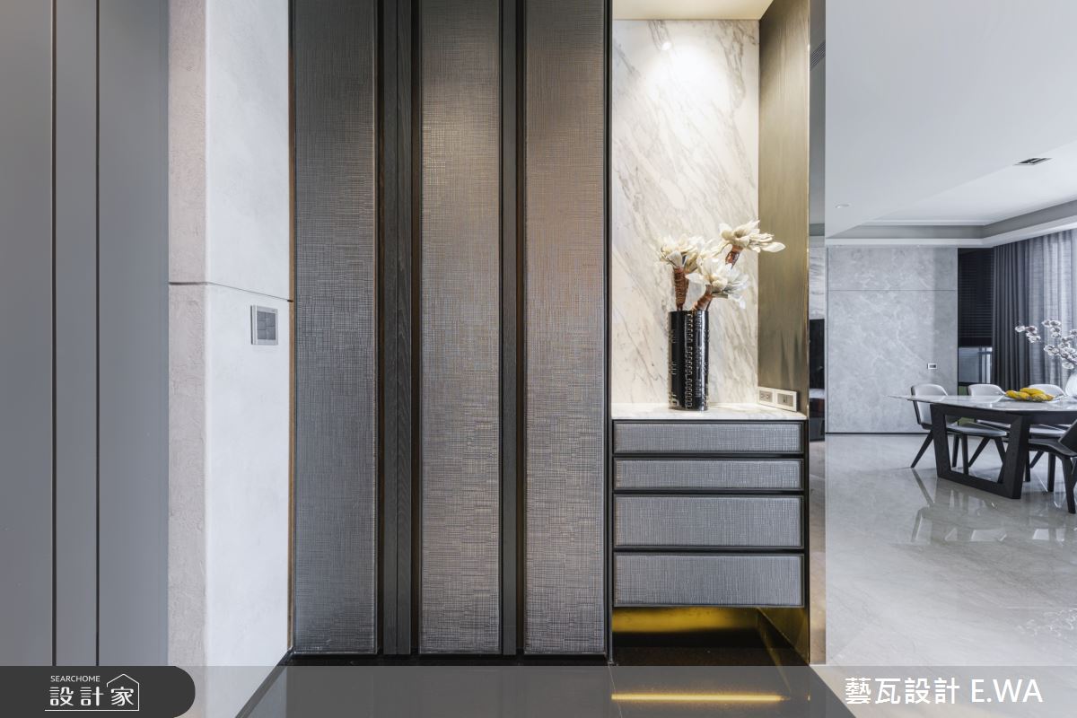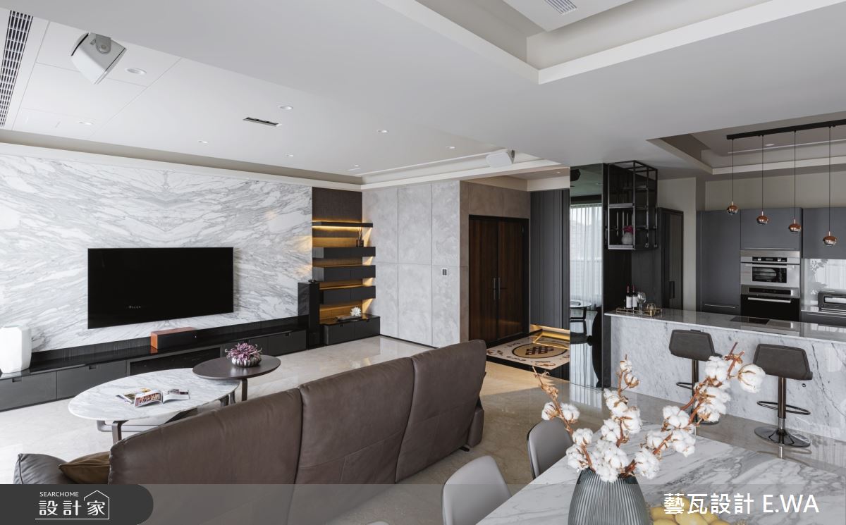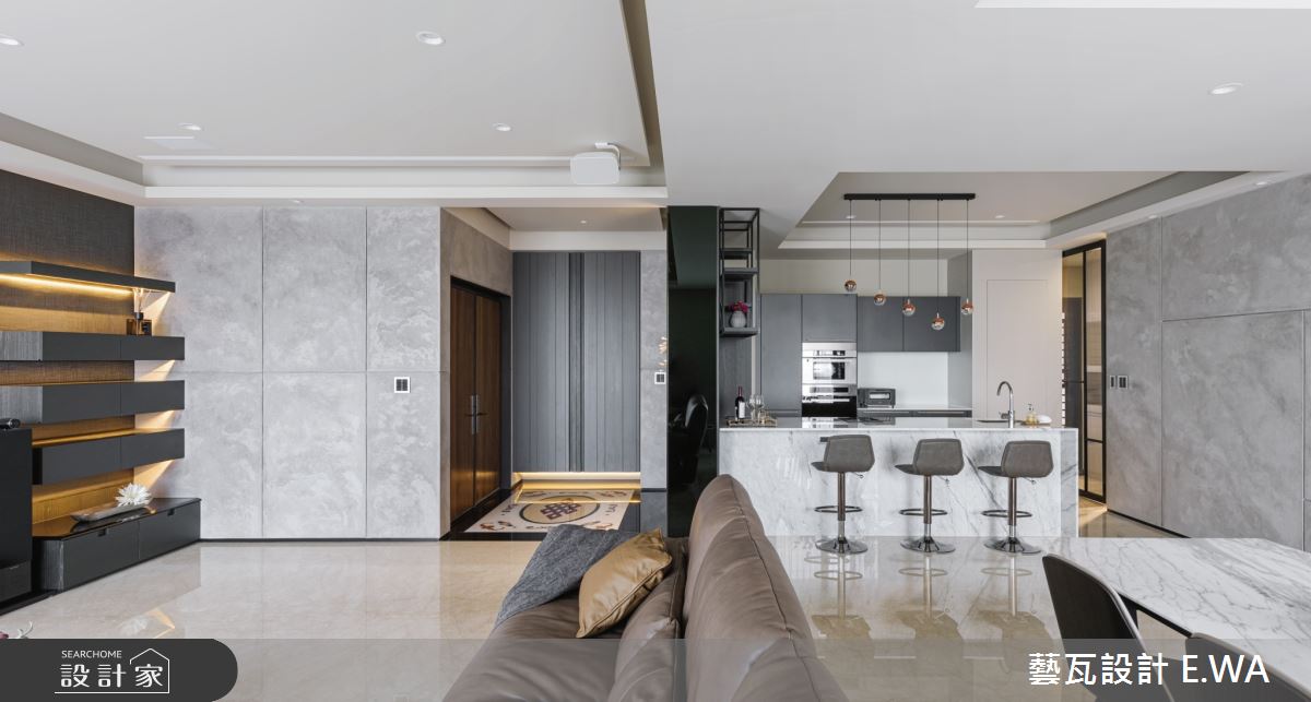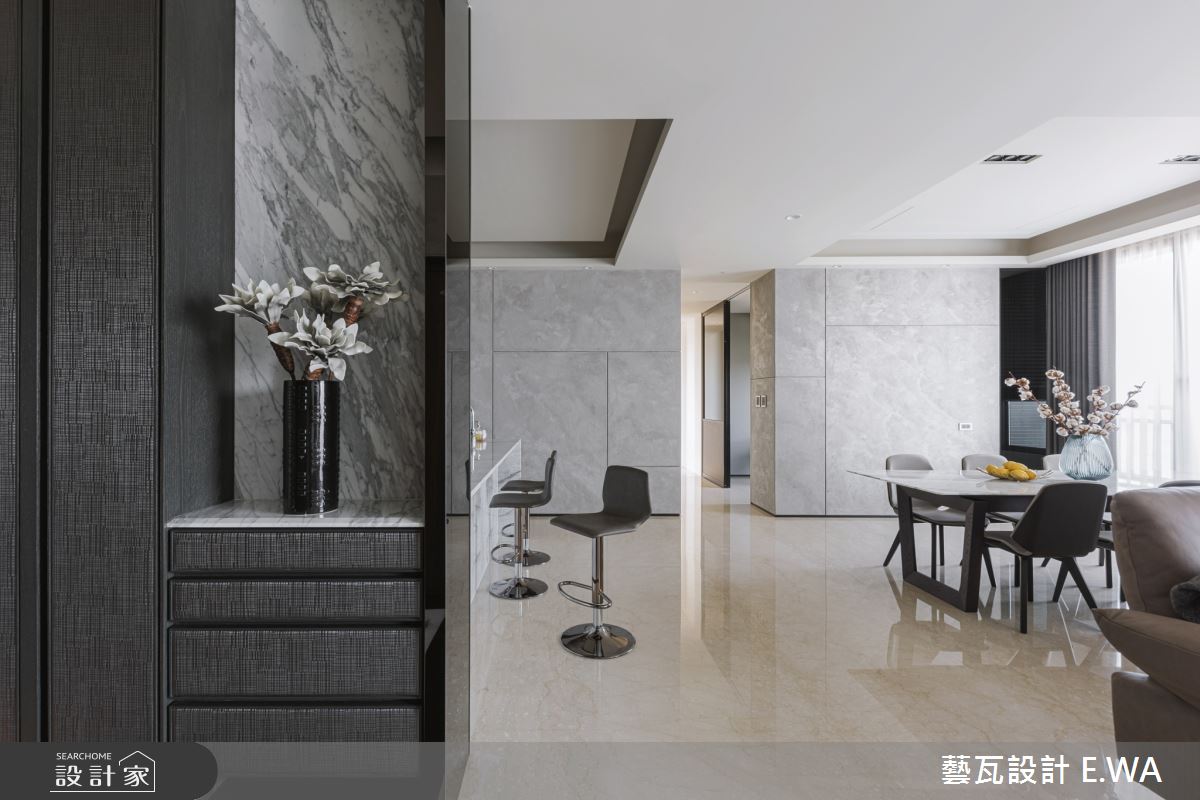 玄關於地面鋪敘拼花圖騰大理石,並巧妙融合質感燈光及自然元素,透過花藝端景、間接光源,精緻皮革櫃面等妝點,使入口區域展現藝術性,展現個性化專屬格調;客廳則打造灰白相間的大理石電視牆,以淺灰石材呼應地坪與壁材,天花板捨棄了常見的白色天花,改選用駝色帶灰的米色調,使居家更顯輕盈溫馨;廚房規劃開放吧檯,搭配流暢的格局擘劃,成為客廳與餐廳之間的銜接空間,搭配鋼琴烤漆廚具門板閃耀著高雅光澤,替用餐區域帶來絕佳品味;臥房,選用軟身材質打造繃皮床頭,彰顯主題牆面的尊貴感,且挹注空間安定感,再簡化櫃體把手,維持牆面視覺的簡單俐落!
