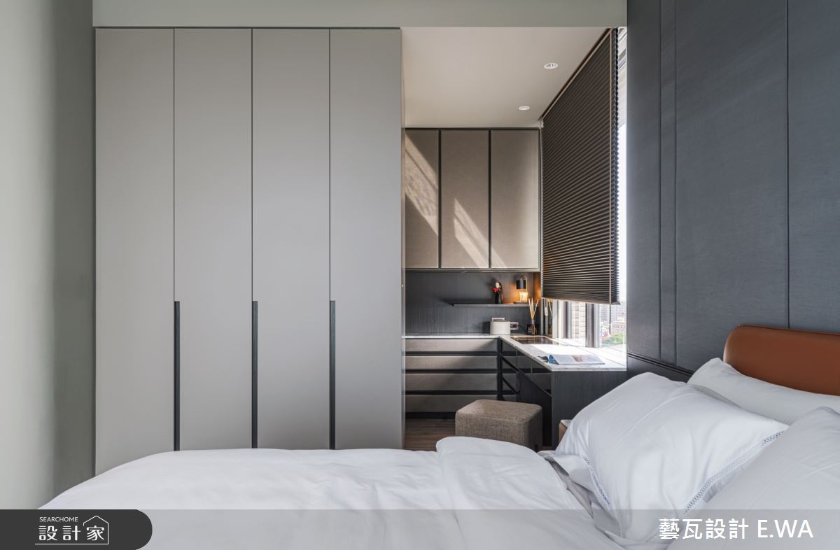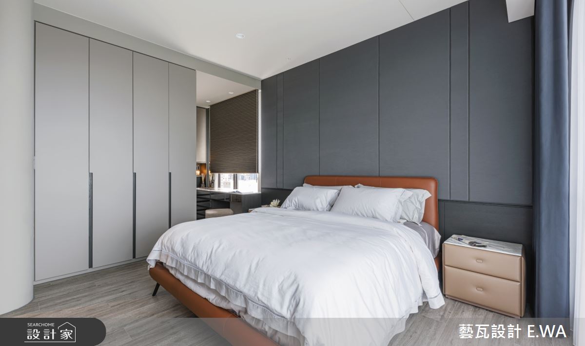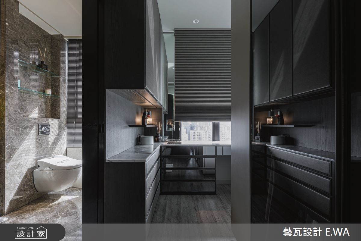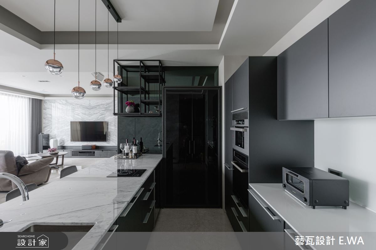 玄關於地面鋪敘拼花圖騰大理石,並巧妙融合質感燈光及自然元素,透過花藝端景、間接光源,精緻皮革櫃面等妝點,使入口區域展現藝術性,展現個性化專屬格調;客廳則打造灰白相間的大理石電視牆,以淺灰石材呼應地坪與壁材,天花板捨棄了常見的白色天花,改選用駝色帶灰的米色調,使居家更顯輕盈溫馨;廚房規劃開放吧檯,搭配流暢的格局擘劃,成為客廳與餐廳之間的銜接空間,搭配鋼琴烤漆廚具門板閃耀著高雅光澤,替用餐區域帶來絕佳品味;臥房,選用軟身材質打造繃皮床頭,彰顯主題牆面的尊貴感,且挹注空間安定感,再簡化櫃體把手,維持牆面視覺的簡單俐落!