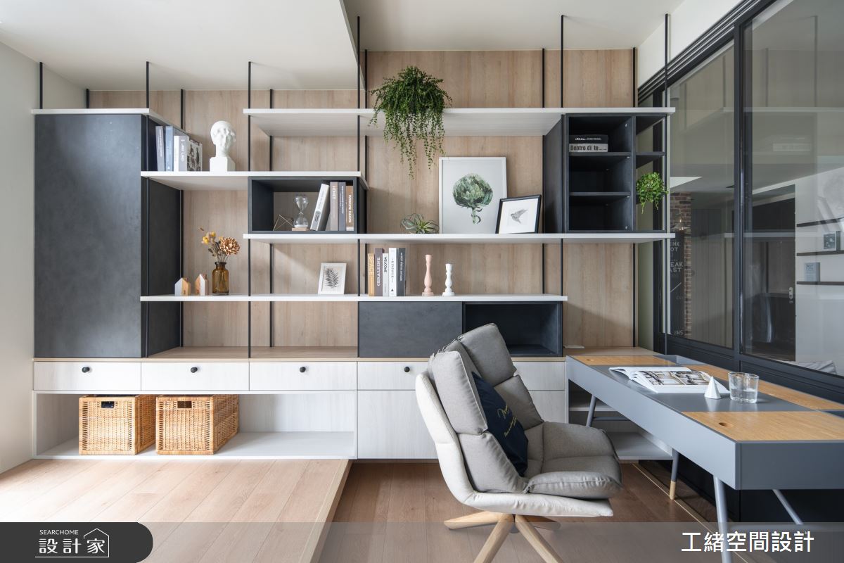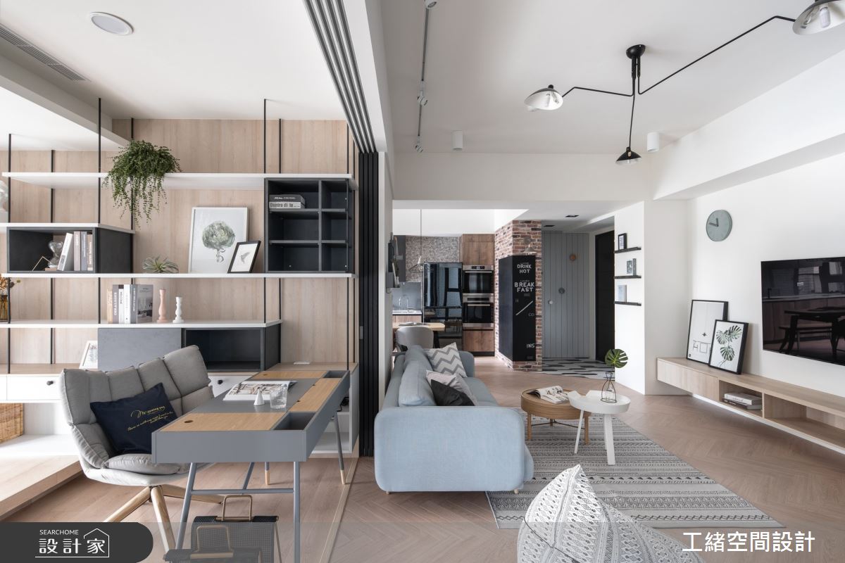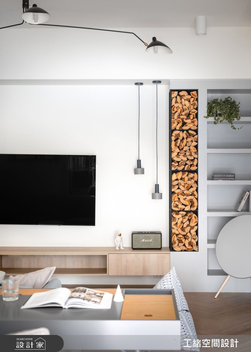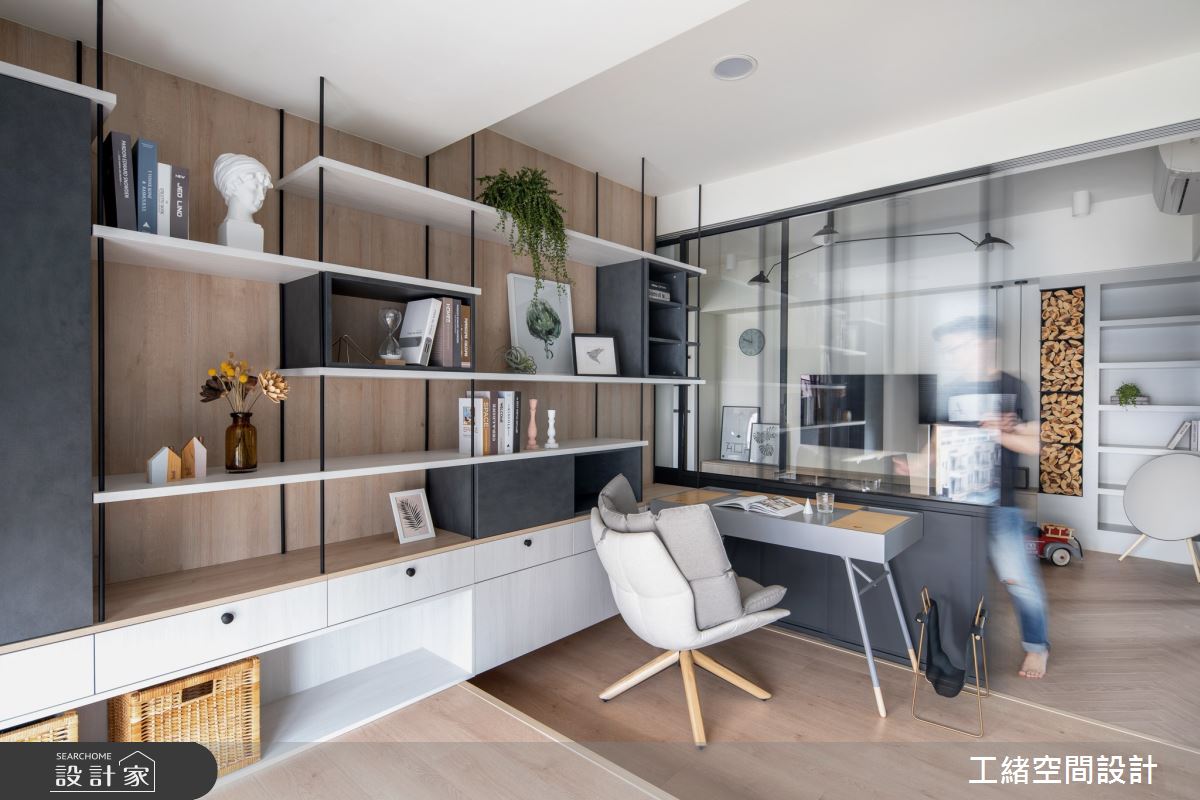 入口處玄關,利用花磚鋪設出落塵區,灰條紋壁面的內部則為儲藏室,作為屋主生活的大量收納空間。以大量白色飾底的公領域裡,利用木紋鋪設地坪,挹注溫潤氣息,電視牆也還原最簡約的壁面風貌,一旁的展示櫃結合木頭造型的堆疊、高低燈飾的安排以及隨意擺設的畫作,增添簡約設計質感;沙發後方為書房區,拆掉隔間牆後,部份光源走進客廳,提升整體視覺亮度,且以拉門界定領域,可隨需求拉開門扇,讓空間保有彈性與變通;書房壁面上以鐵件與層架搭出一整面展示櫃,可隨書籍、風格物件與植栽的擺設,妝點出多元風貌。