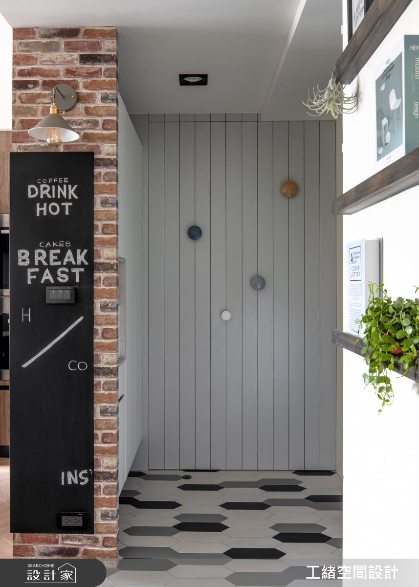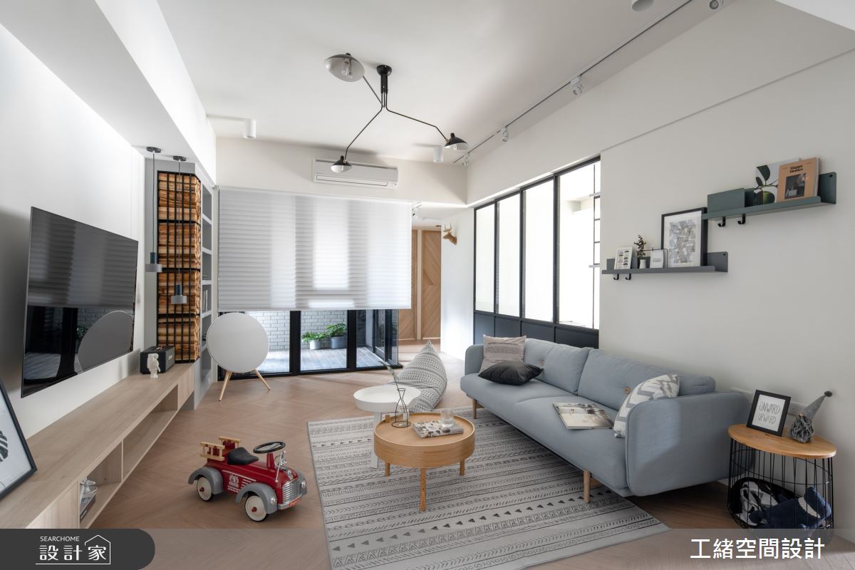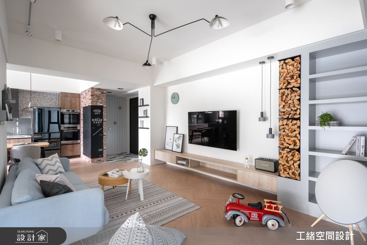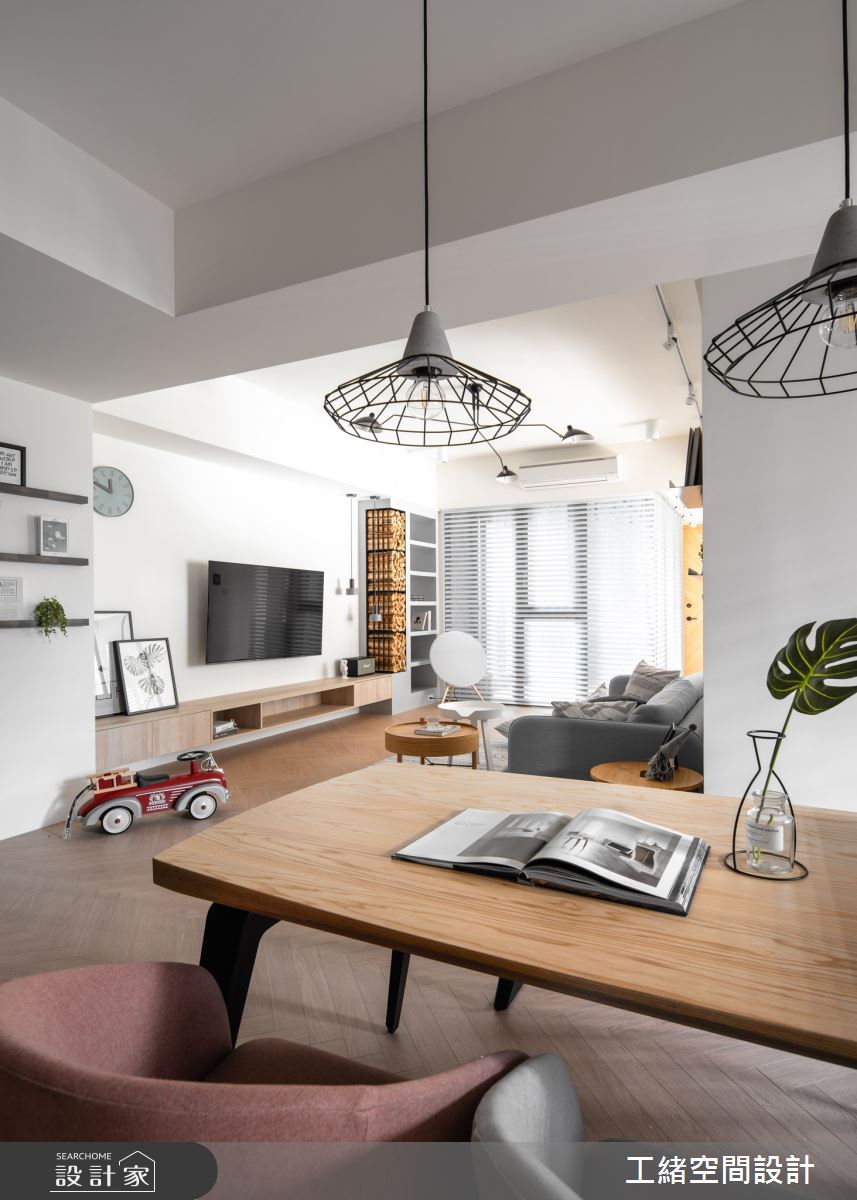 入口處玄關,利用花磚鋪設出落塵區,灰條紋壁面的內部則為儲藏室,作為屋主生活的大量收納空間。以大量白色飾底的公領域裡,利用木紋鋪設地坪,挹注溫潤氣息,電視牆也還原最簡約的壁面風貌,一旁的展示櫃結合木頭造型的堆疊、高低燈飾的安排以及隨意擺設的畫作,增添簡約設計質感;沙發後方為書房區,拆掉隔間牆後,部份光源走進客廳,提升整體視覺亮度,且以拉門界定領域,可隨需求拉開門扇,讓空間保有彈性與變通;書房壁面上以鐵件與層架搭出一整面展示櫃,可隨書籍、風格物件與植栽的擺設,妝點出多元風貌。