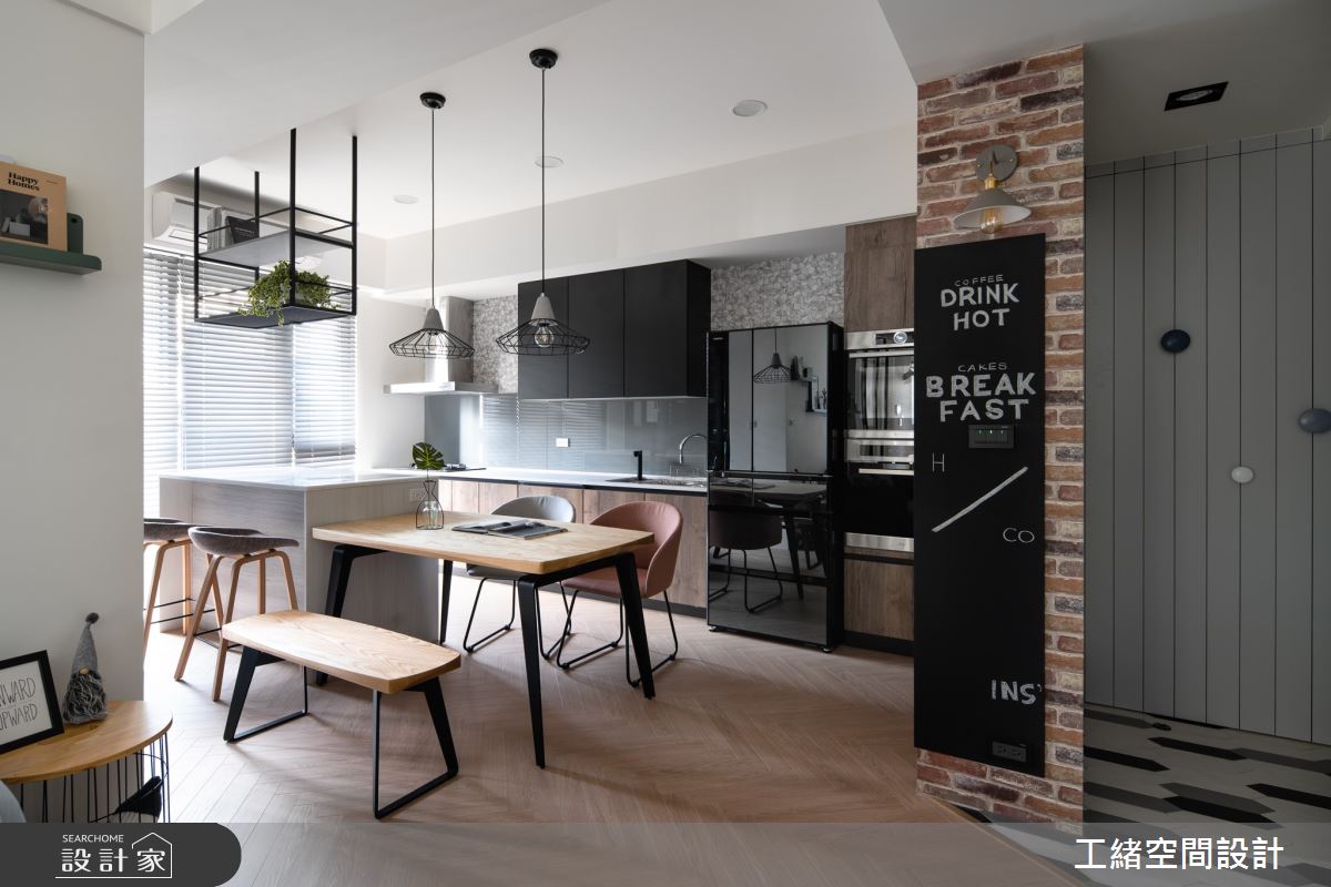 餐廚空間整併,鐵件懸掛收納與燈飾的妝點,挹注一抹個性味道;木紋的地板鋪設與原木餐桌椅的安排,替用餐空間增添自然溫度;而中島與餐桌整併,拉出通道,領域顯得開闊舒心。
