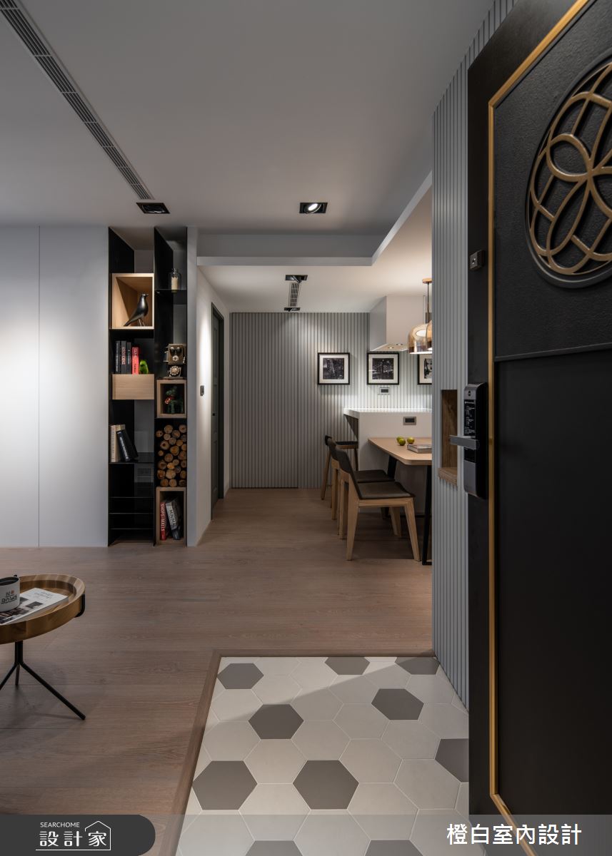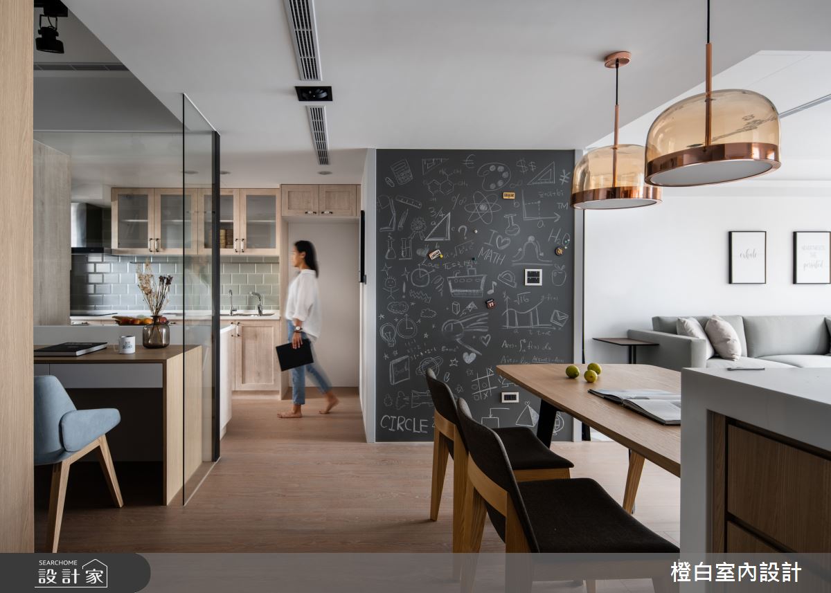 甫入玄關,以六角形的幾何地磚界定落塵區,並巧妙將儲藏室隱身於牆面背後,滿足充裕的收納機能。客廳區域,捕捉落地窗帶入的自然光源,並藉由長型沙發延伸空間尺度,透過牆面結合展示櫃體,形塑清爽而無壓的視野。將黑板牆作為過渡地帶,描繪互動性十足的生活樣貌,餐桌一旁則設置暗藏收納功能的端景檯面,和攝影作品勾勒人文品味。書房區域以玻璃隔間和廚房相鄰,讓視線能夠不受阻礙,無形放大了整室的空間感。