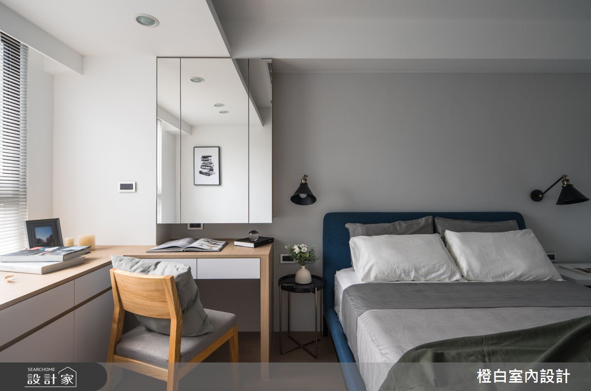 走入臥房,有別於公領域的多樣材質,透過簡約而純粹的配色、建材,讓人回歸放鬆而療癒的休憩狀態。
