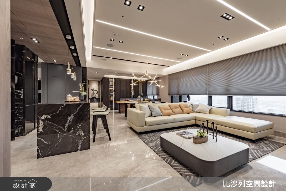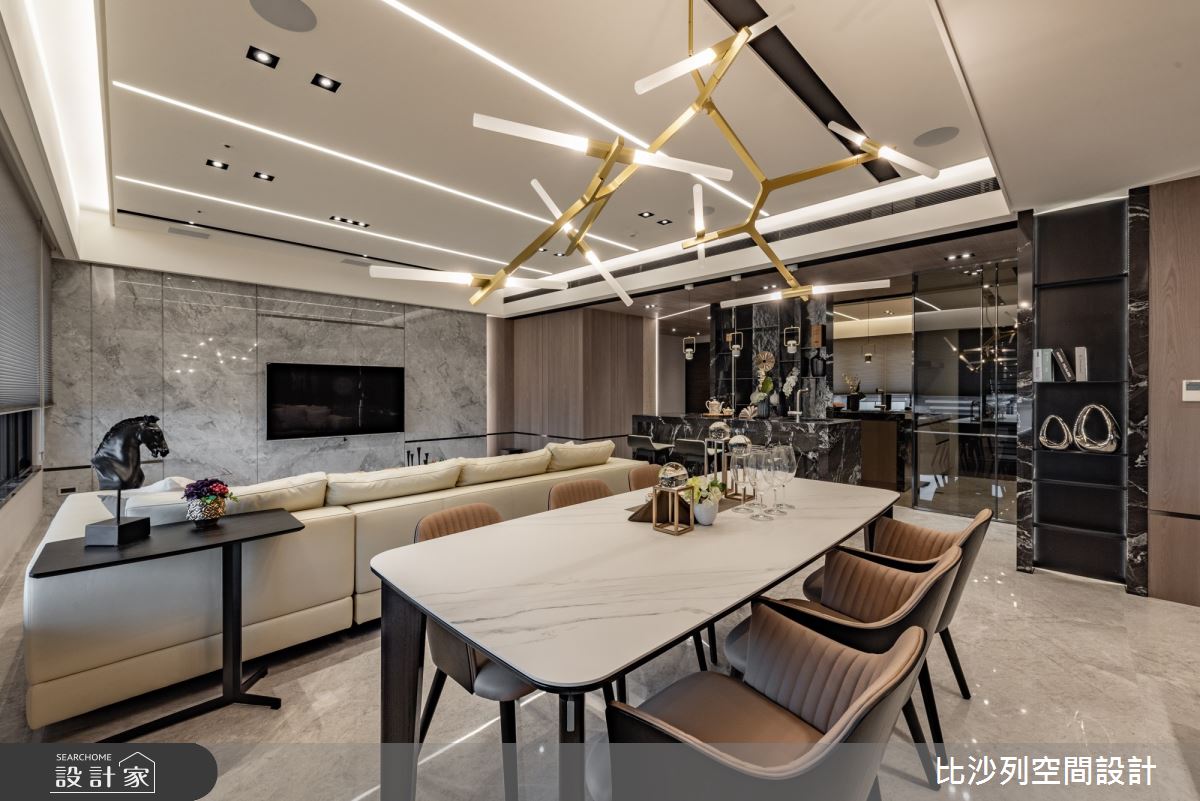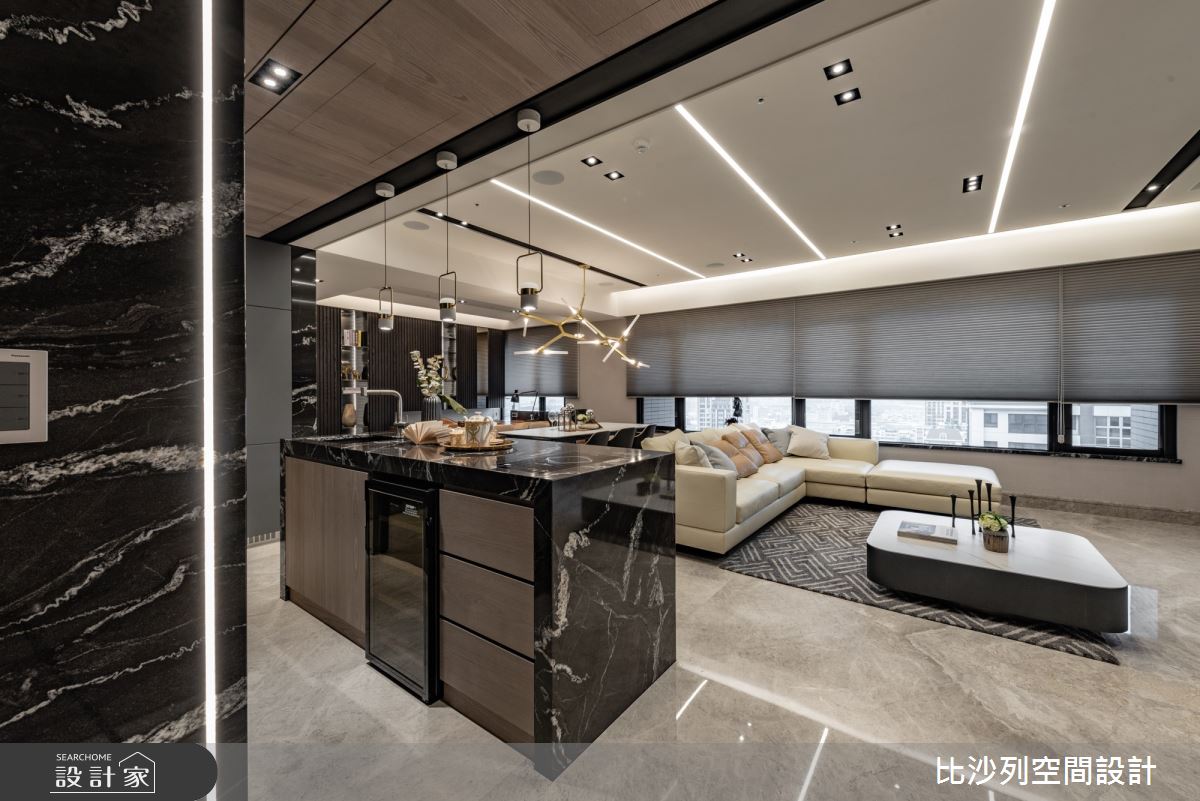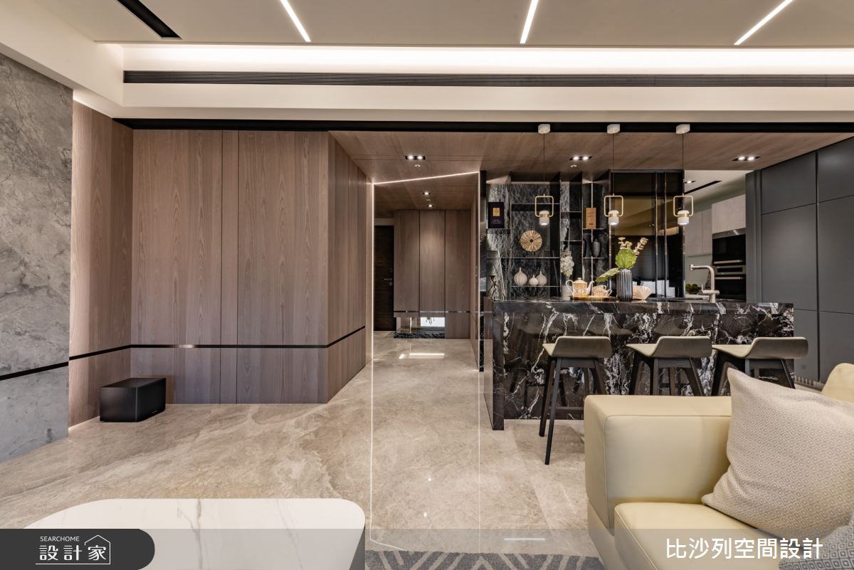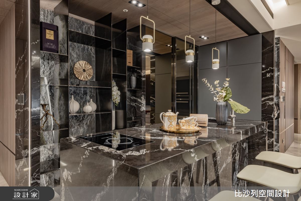 入口處利用收納櫃體圍塑出內玄關區,進入公領域前在壁面上則透過燈條巧妙界定,創造出循序漸進的動線導引,讓每一位進入空間的人們心更加安定。開放的公領域裡,整排開窗的延伸與設計下,納入客、餐廳與書房領域,視野隨之開闊,提升互動性;而隨著天花板的高度不同,不同材質的描繪以及照明的安排,整合整體視覺且劃分出領域機能。大理石鋪設地坪與電視牆,烘托潔淨、明亮之感,一旁的中島檯則透過潑墨山水意象的黑色石材打造,對比出視覺衝擊,蘊含深邃的東方藝術,後方展示層櫃上同樣以石材襯底,鍍鈦鐵件切割比例,陳列出風格物件,強化人文美學藝氣息。透過一道玻璃拉門區隔出廚房空間,除了料理時可杜絕惱人油煙,玻璃材質做為隔間手法,讓視覺上更顯通透、開闊。