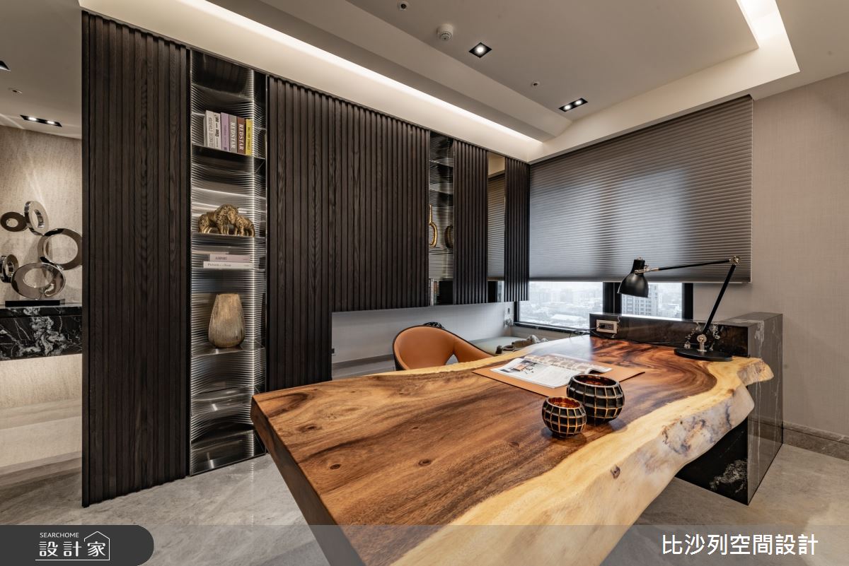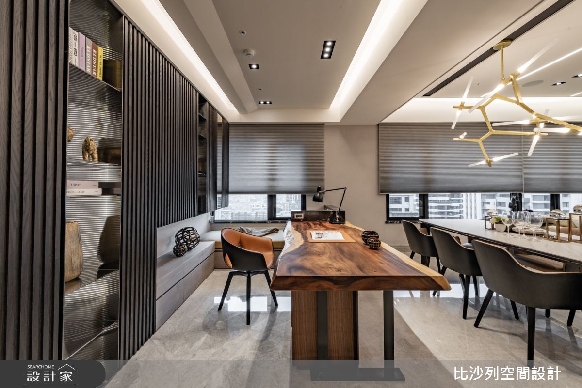 沙發後方規劃開放餐廳與書房為主,書桌以自然無華的原木書桌為主,後方壁面結合格柵櫃體,創造出些許東方禪意的人文空間氣息。