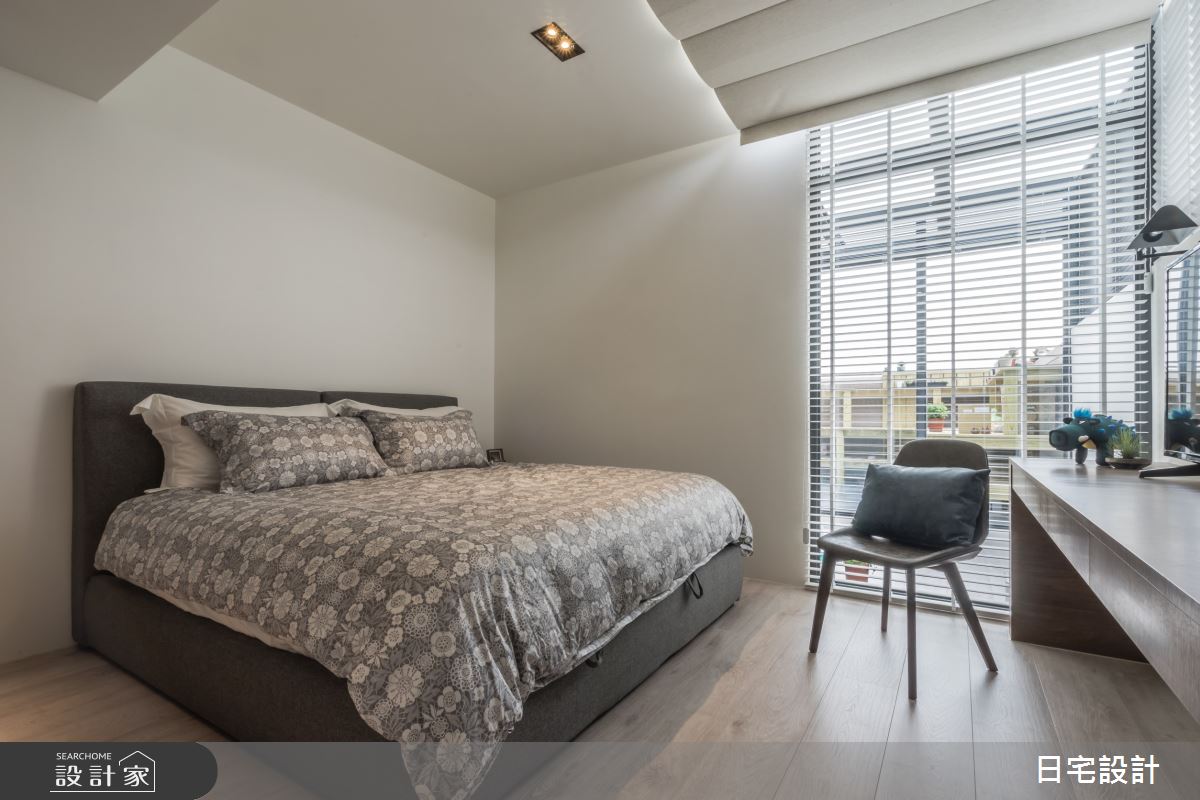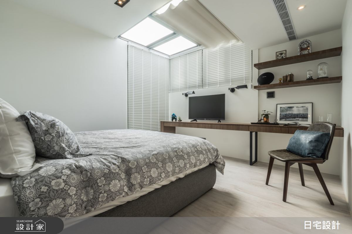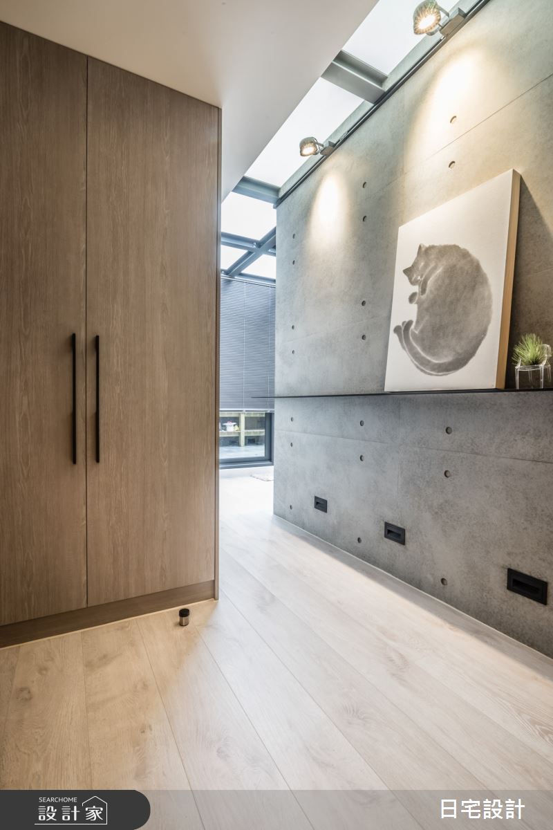 公領域鋪設淺色的超耐磨木地板,一方面是呼應空間的自然主軸,另一方面也是考量家中貓狗眾多的關係,配合從客廳延伸至露臺的大片清水模漆牆面,賦予居家質樸不造作的視覺氛圍。寢臥則展現設計師的客製化巧思,主臥的移動式電視牆,增強了臥房的收納機能;次臥的天窗與百葉窗,在白天能隨心情調整光線,夜晚又有星空相伴入眠,使心境得以沉澱。