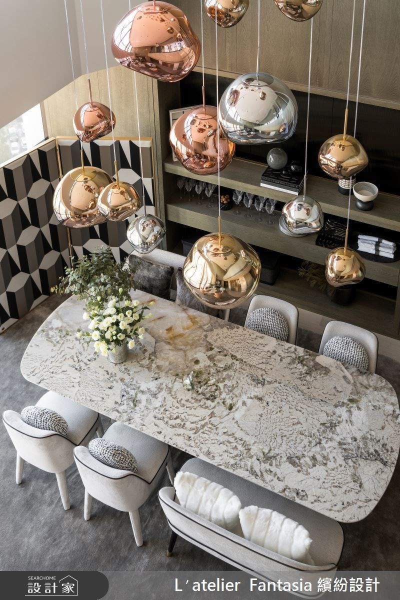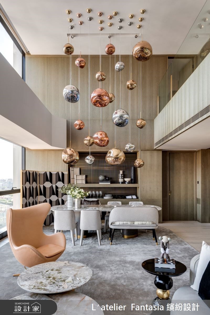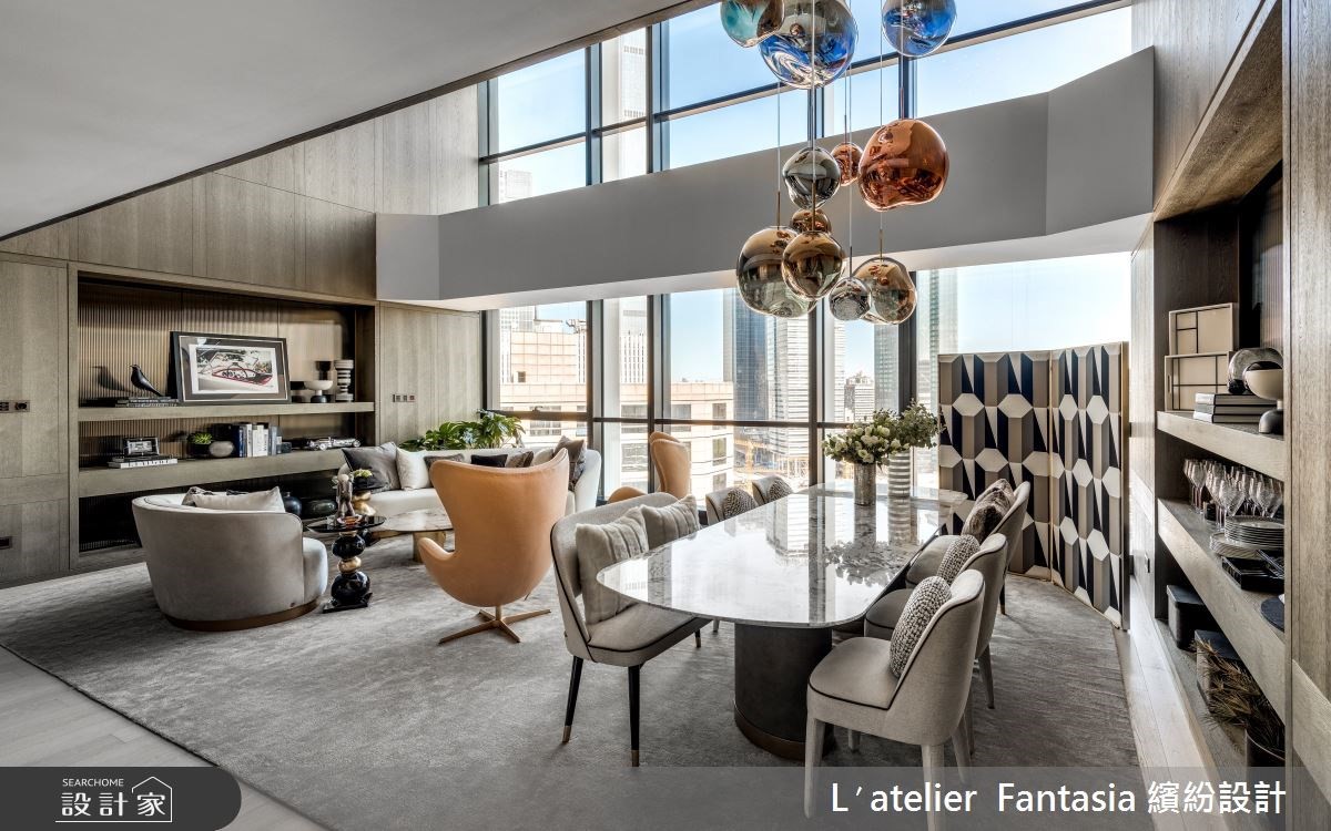 入口玄關區,以金箔屏風搭佐精緻的金屬工藝雕塑品,伴隨花藝與奢華感穿鞋椅的搭襯下,交織出奢華且大器的迎賓丰采。客廳擁有樓中樓挑高優勢,大面窗景設計將城市建築與遼闊天空延攬入室,讓內外皆景;且利用「圓」形的意象,軟化空間裡剛硬的稜角線條,從家具到環狀的家具造型配置,串連起場域間的對話與邏輯,也營造出凝聚情感的社交型生活空間。餐廳空間裡,餐桌特別挑選皇室御用寶石的綠碧璽打造而成,隨著自然光的洗禮下,閃耀動人光芒,彰顯皇室般的高貴氣息;6.8米高的天花板懸掛高低錯落的金屬吊燈,三種金屬光澤擦亮視覺新意,同時傳遞視覺層次的驚喜。書房領域的牆面,掛上藝術家何政宏創作的「水月空花」繪畫圓鏡,與玄關的圓形地毯相互呼應,描繪圓融圓滿的人生境界,並以白色祥雲的意象烘托雲端住宅的優雅尊榮。