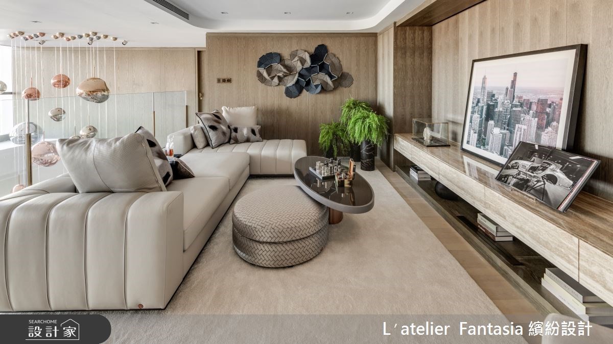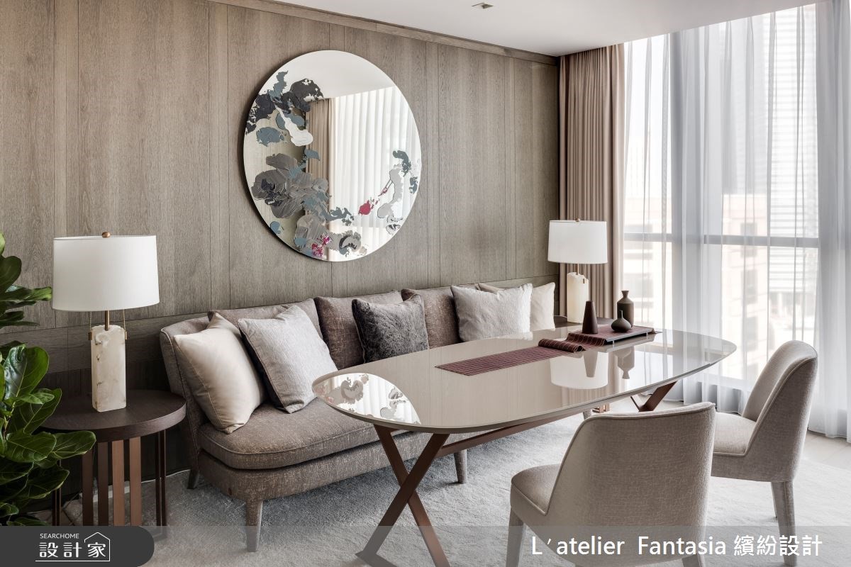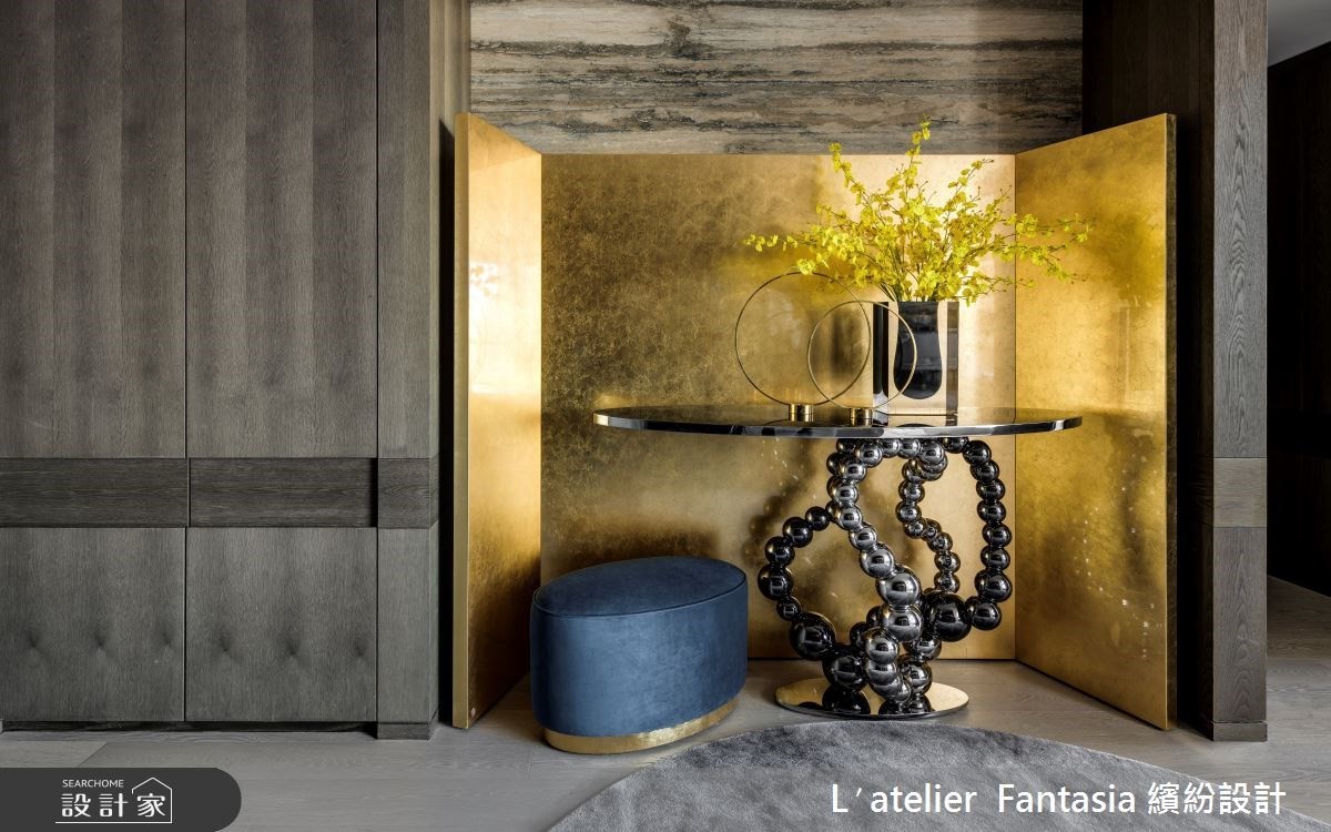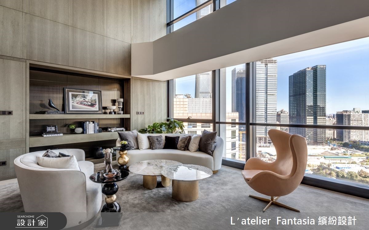 入口玄關區,以金箔屏風搭佐精緻的金屬工藝雕塑品,伴隨花藝與奢華感穿鞋椅的搭襯下,交織出奢華且大器的迎賓丰采。客廳擁有樓中樓挑高優勢,大面窗景設計將城市建築與遼闊天空延攬入室,讓內外皆景;且利用「圓」形的意象,軟化空間裡剛硬的稜角線條,從家具到環狀的家具造型配置,串連起場域間的對話與邏輯,也營造出凝聚情感的社交型生活空間。餐廳空間裡,餐桌特別挑選皇室御用寶石的綠碧璽打造而成,隨著自然光的洗禮下,閃耀動人光芒,彰顯皇室般的高貴氣息;6.8米高的天花板懸掛高低錯落的金屬吊燈,三種金屬光澤擦亮視覺新意,同時傳遞視覺層次的驚喜。書房領域的牆面,掛上藝術家何政宏創作的「水月空花」繪畫圓鏡,與玄關的圓形地毯相互呼應,描繪圓融圓滿的人生境界,並以白色祥雲的意象烘托雲端住宅的優雅尊榮。