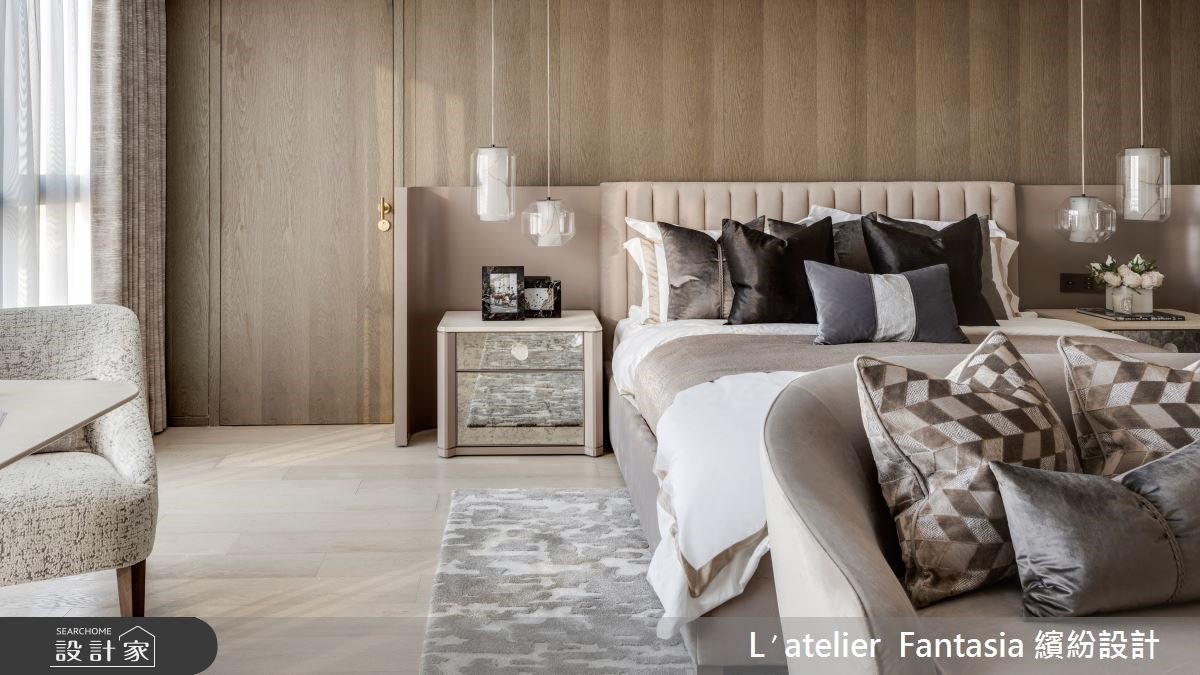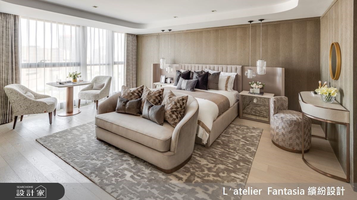 樓上起居交誼廳透過方型的家具擺設,體現愜意自在的生活感受自在感受;主臥室裡,則以大地色木紋鋪設出溫潤、安定的休憩氛圍;並融入休憩聊天、造型梳妝等空間機能,刻劃出美感與機能兼備的起居生活。