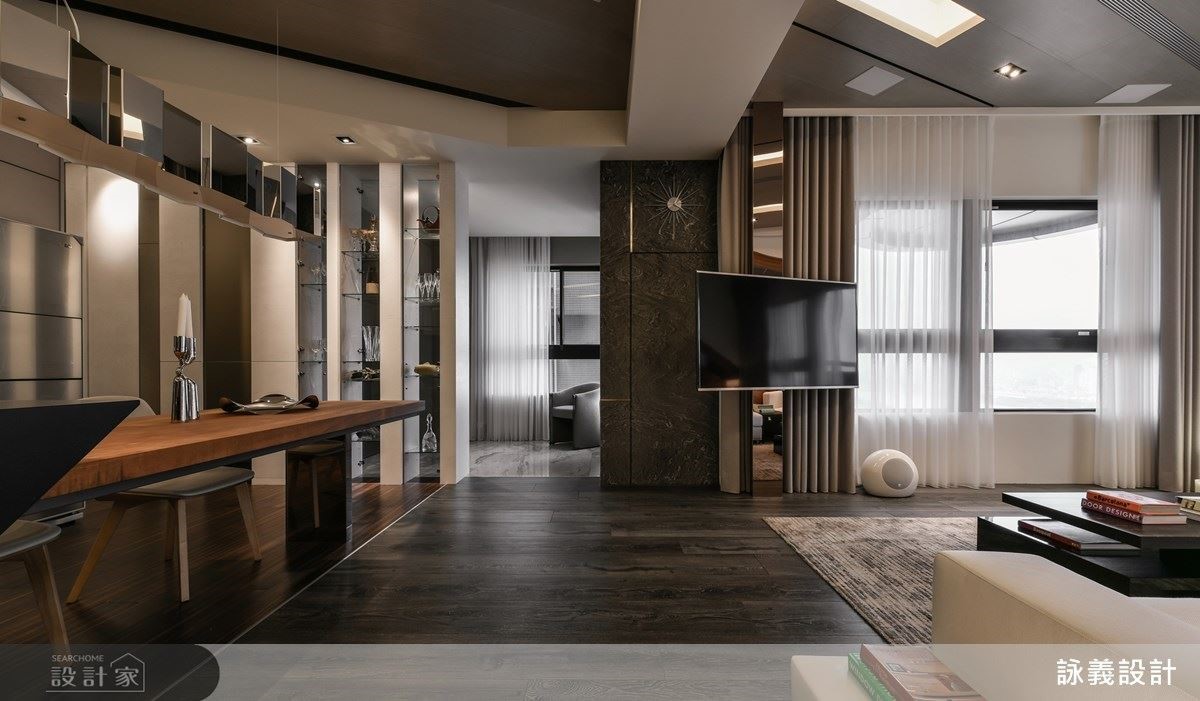 原始屋況擁有極佳的河岸風光,但格局卻不理想,客廳窄小顯得壓縮,而且規畫不當,沙發依窗擺放,不但難以彰顯空間氣勢,也無法欣賞到窗外的美好景觀。超美學事業體創辦人/詠義設計劉榮祿老師打破慣性思維,依空間尺度結合美學佈局,為屋主客製化沙發,並且斜向擺放,重新調整坐向與視覺,面對窗景一攬無遺,將優點擴大至極致。而電視則懸空飄浮於特殊扁平造型結構柱上,並鑲嵌鏡面,以多元材質豐富牆面層次,融為一體,消弭存在感。