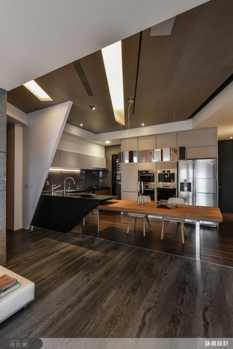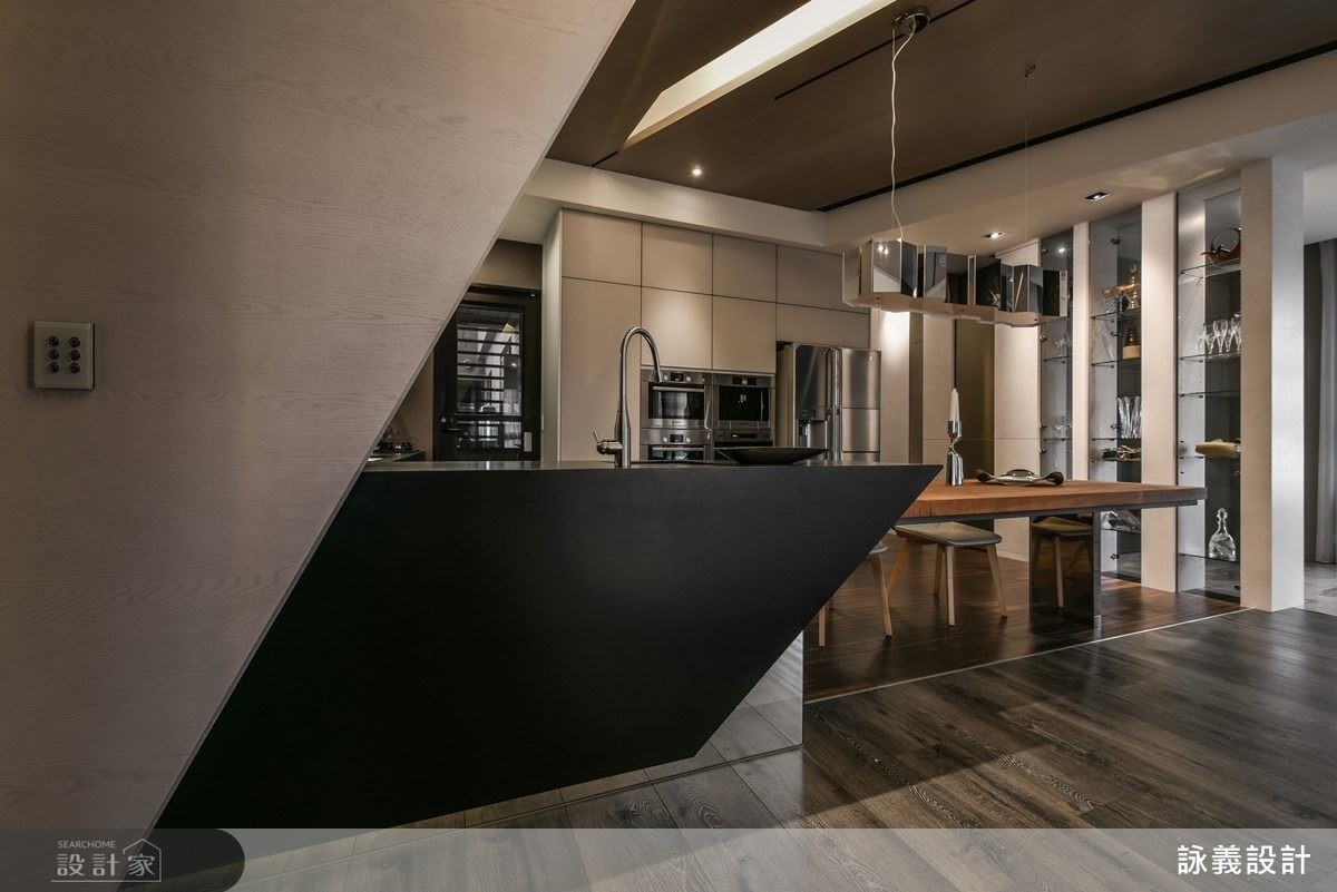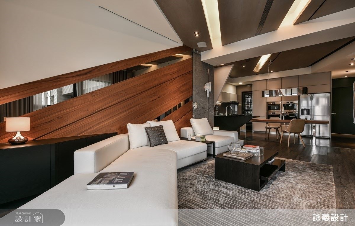 一般設計手法,往往將天地壁各自單獨規劃,雖具美感卻欠缺整體一致性。劉老師以內化建築的視角,讓平面與立面延續連續性的設計概念,產生極強的關連性。公領域充滿斜線語彙,穿梭在各個區塊與空間產生對話,客廳主牆、廚房斜屋頂流明天花、中島的底座與隔屏,每一條斜線都有著存在意義,充滿細膩美學的平衡,更能聯繫各個空間形成完美整體;而放射狀的視覺引導,強烈的透視感受與速度感,無形中也讓空間更為放大,湧現生動的活力。