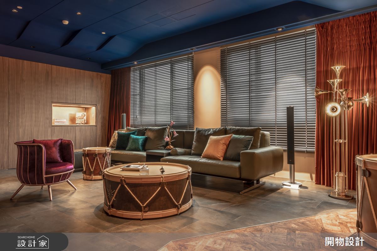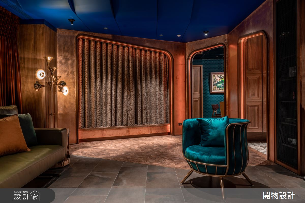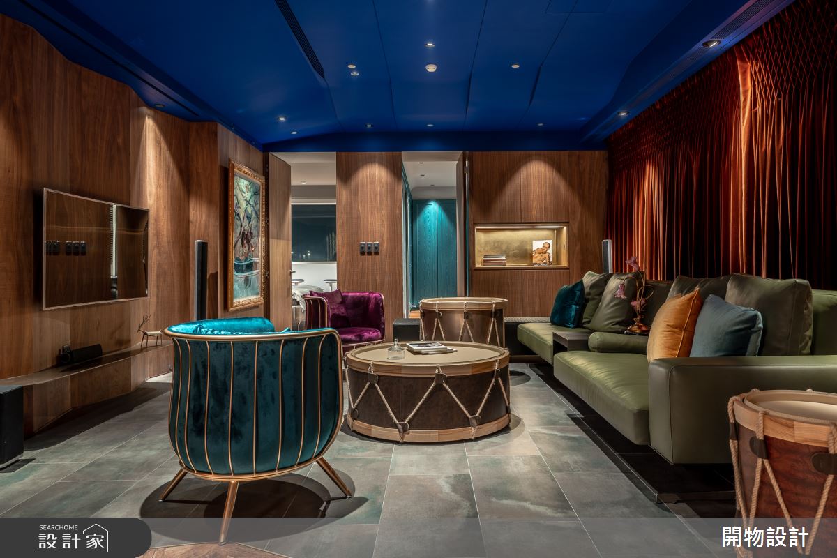 採半開放式格局,以紅銅拱門和絨布布幔界定三大場域:客廳、餐廳和休憩空間,使視線流通,卻又各自獨立,增添空間的彈性運用,更展開一場魔幻的視覺遊戲。客廳區域,湛藍色的斜面天花,鋪陳豐富層次感,使屋高上下延伸,更和紅色布幔形塑強烈對比,創造趣味性十足的衝突感。餐廳區域,天花板藉由鏡面效果,映照出挑高的大方氣勢,藉由多樣材質拼貼,與水晶吊燈、不規則木作展示架的相輔相成,流露精緻不俗的迷人品味。
