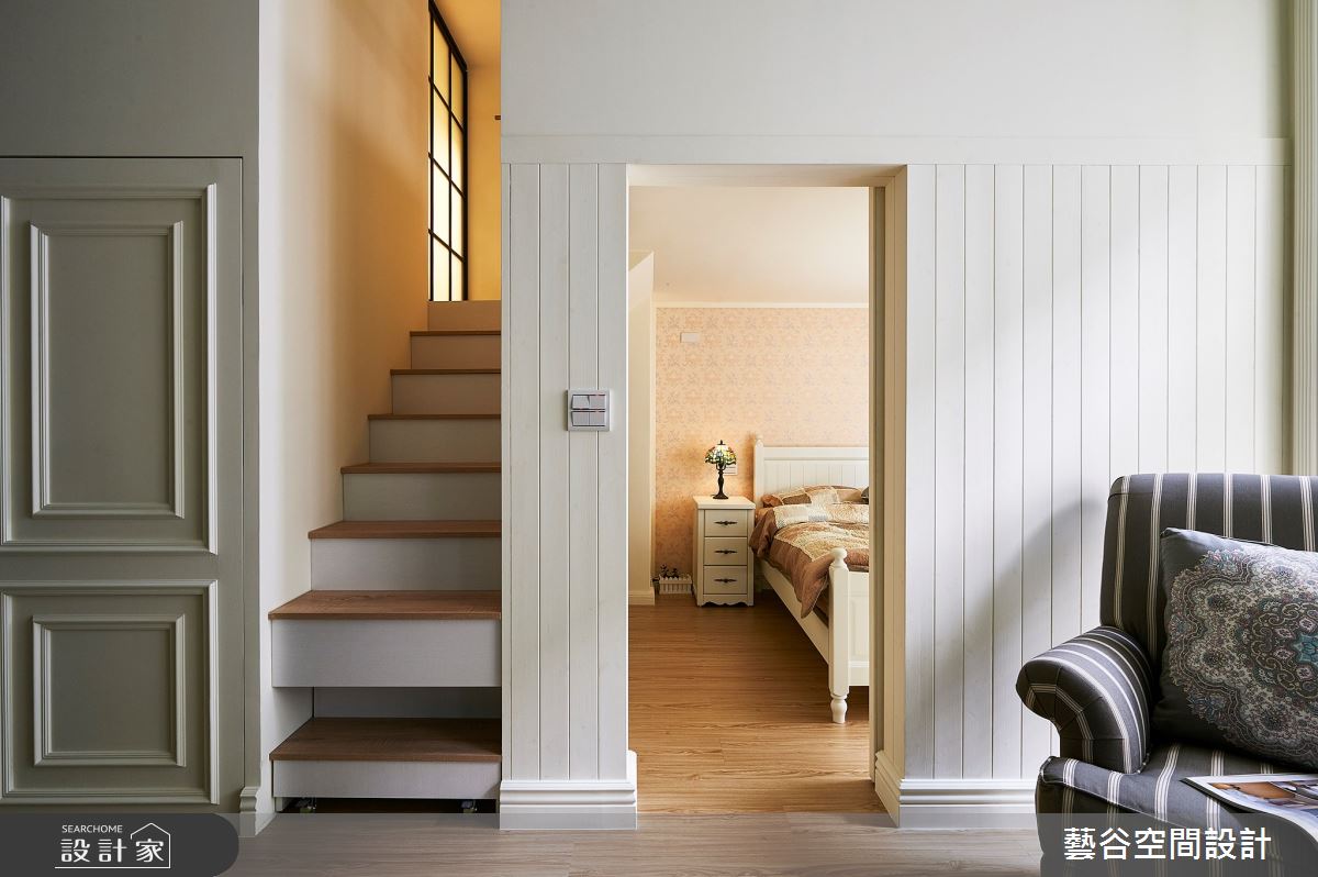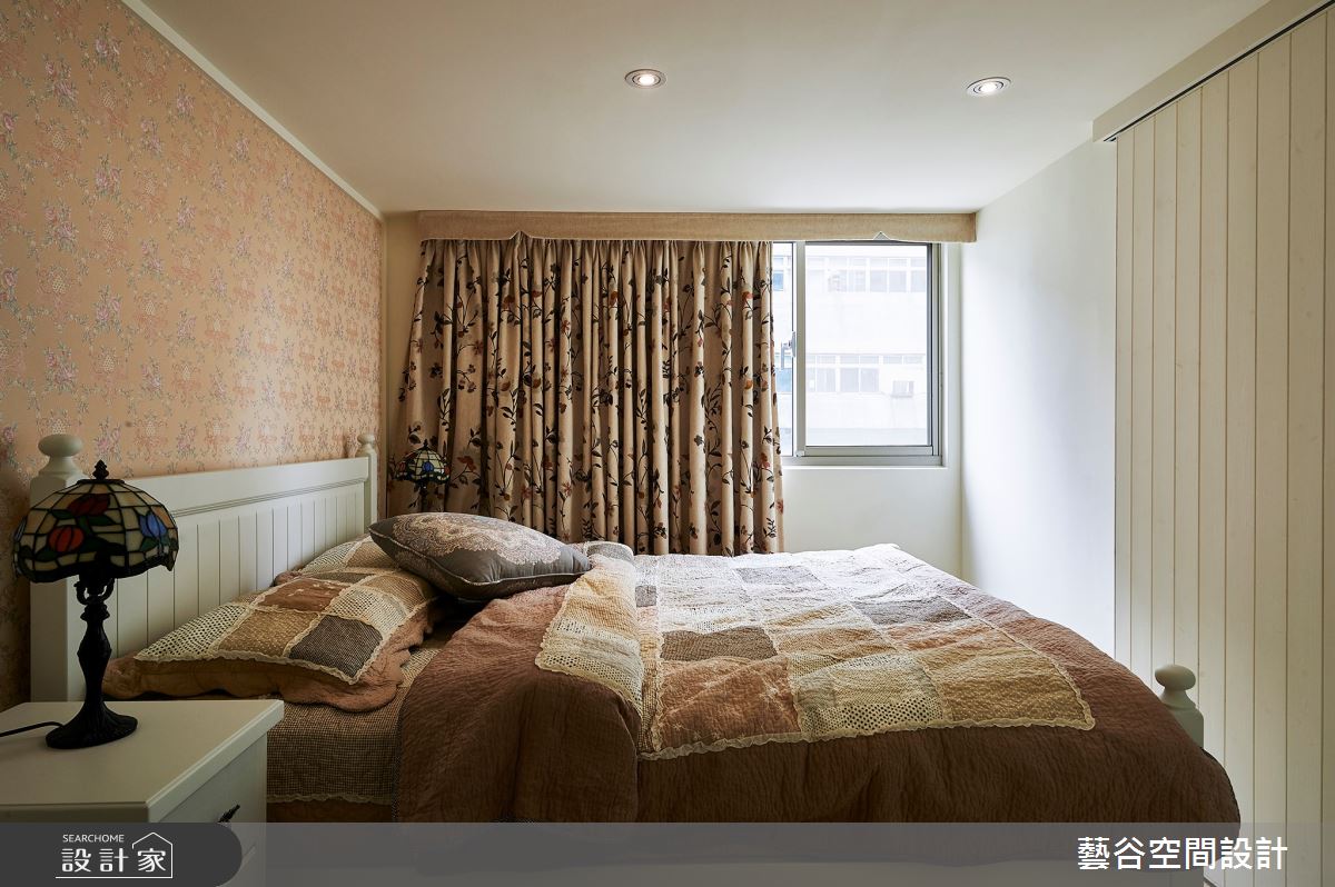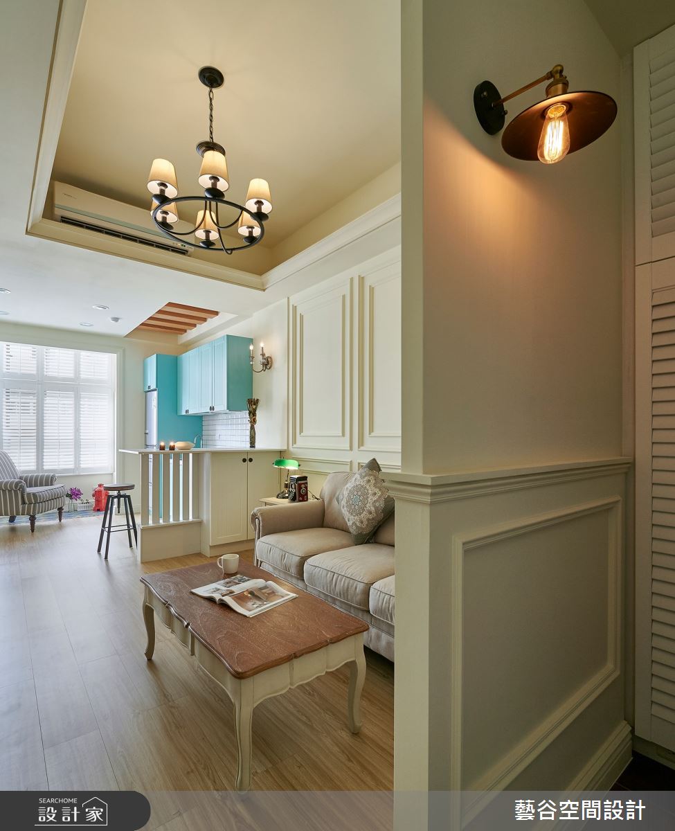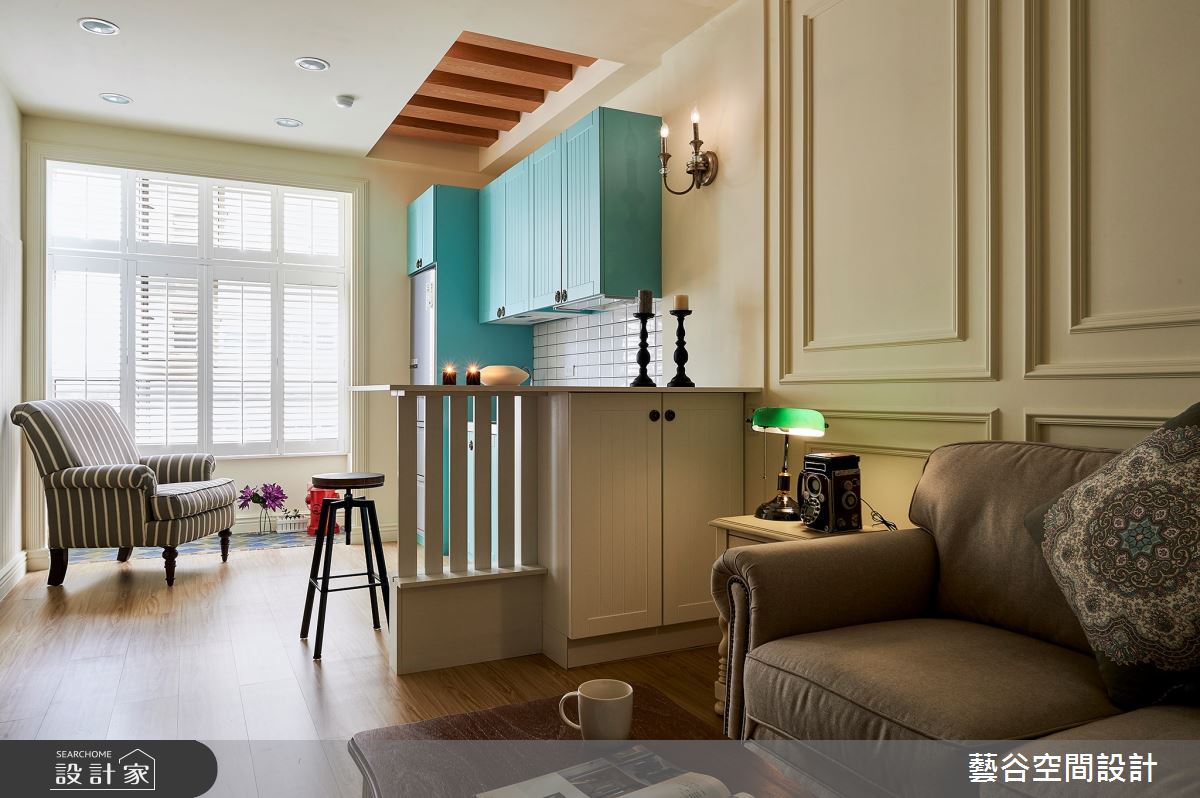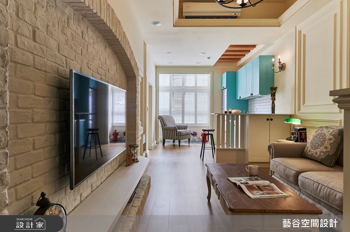 玄關區域,藉由經典百葉窗門片,增添充裕的收納空間,並以假牆化解開門見窗的風水疑慮。步入客廳,粗獷又富含溫度的文化石電視牆,旋即擄獲眾人視線,並以美式線版勾勒沙發背牆,在親切情懷中,無形透露著高雅的迷人質感。餐廚區域,伴隨窗外流洩而下的明朗日光,注入夢幻感十足的Tiffany色調,旁側櫃體結合邊桌功能,可彈性運用於愜意的用餐時光。私領域隱身於牆面之後,臥室運用碎花壁紙鋪陳,透過粉嫩的色彩渲染,輔以琉璃燈飾、窗簾等細節巧思,滿足屋主對私宅的美麗想像。