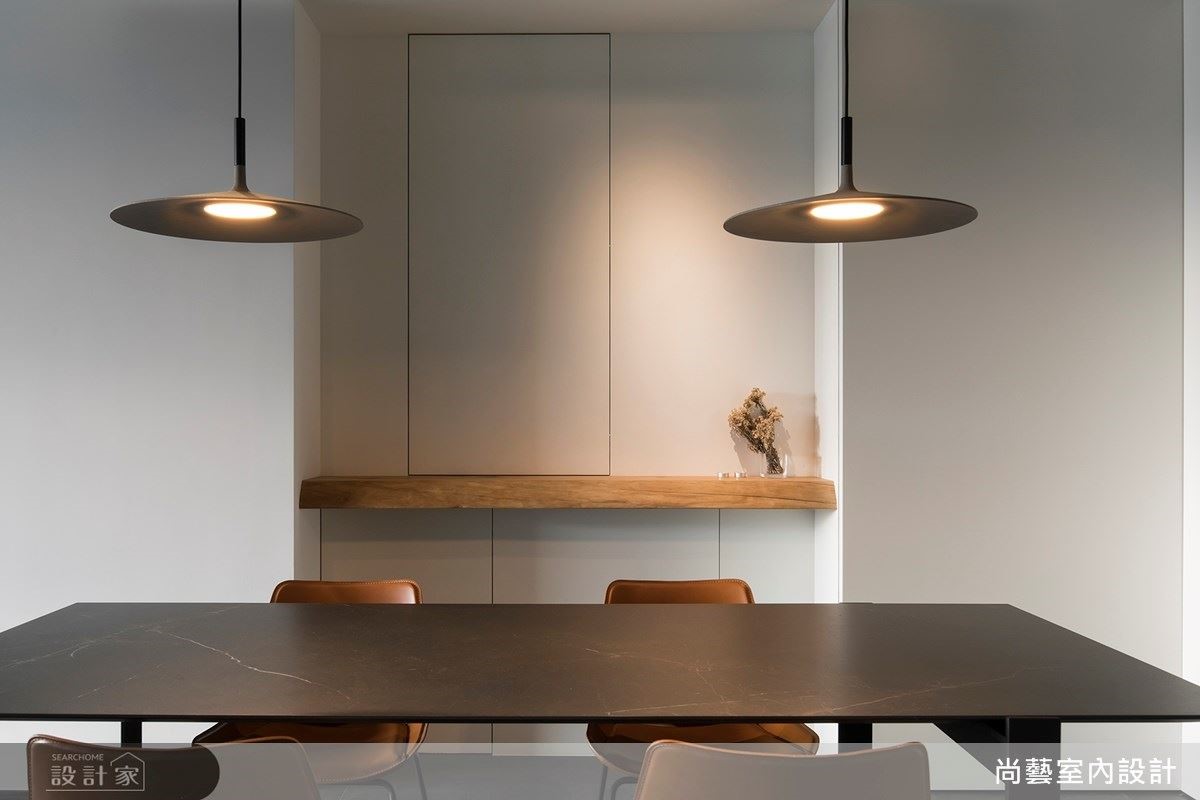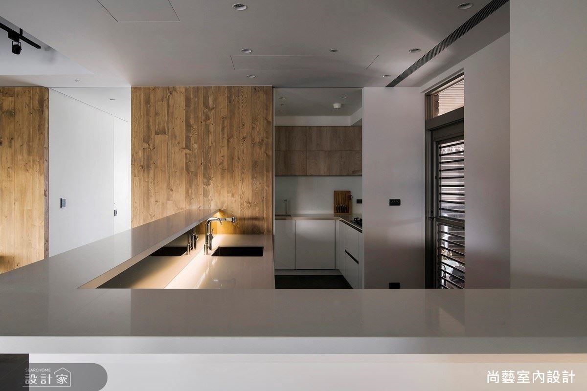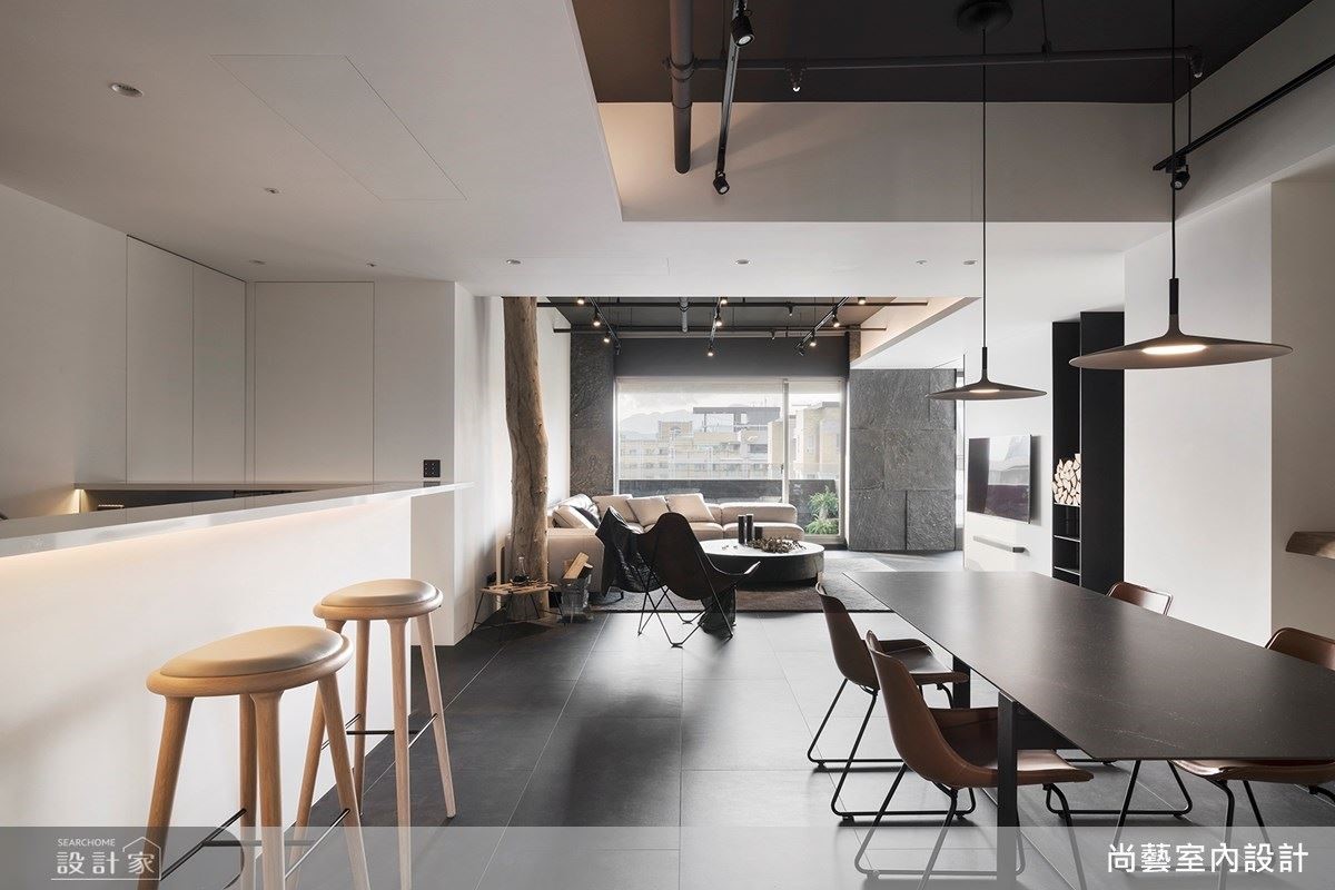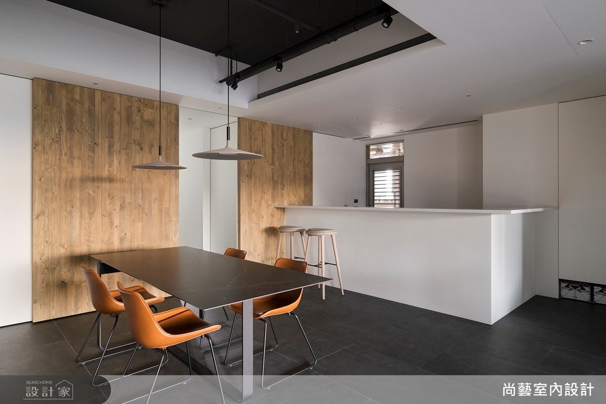 餐廚場域以開放式格局串聯情感,高檯面的中島吧檯保有隱私性並能容納完善機能,設計師掌握材質表現,將材料與家飾精心匹配,使木皮、石皮、板岩達到完美共融性,創造舒適自然的藝術美學。