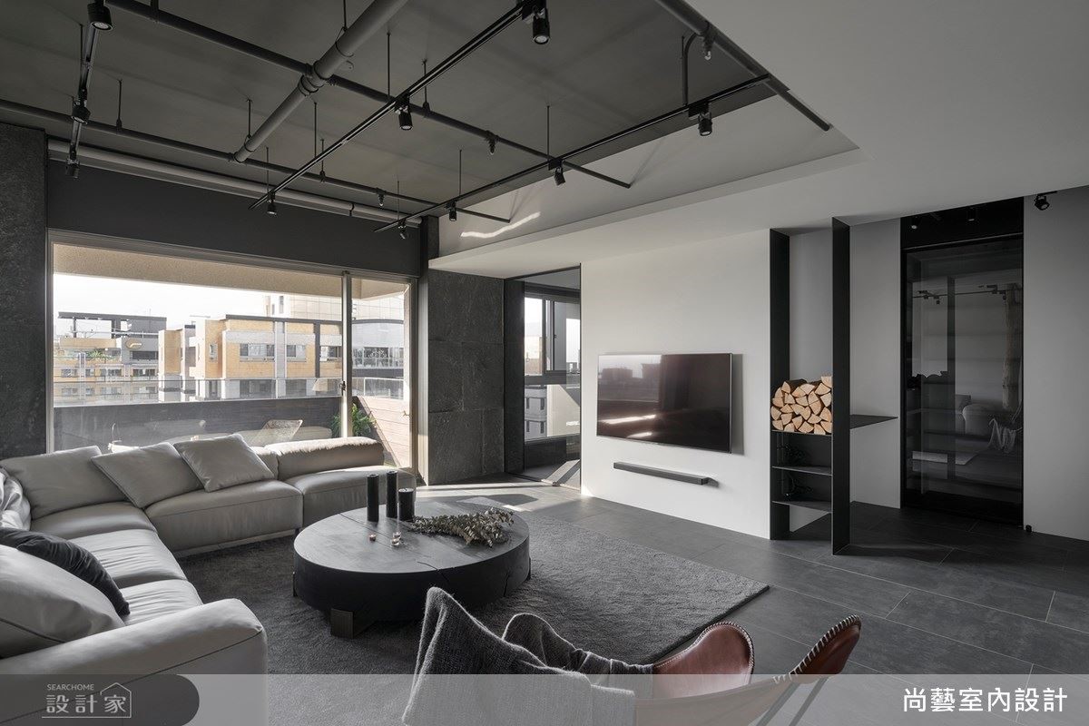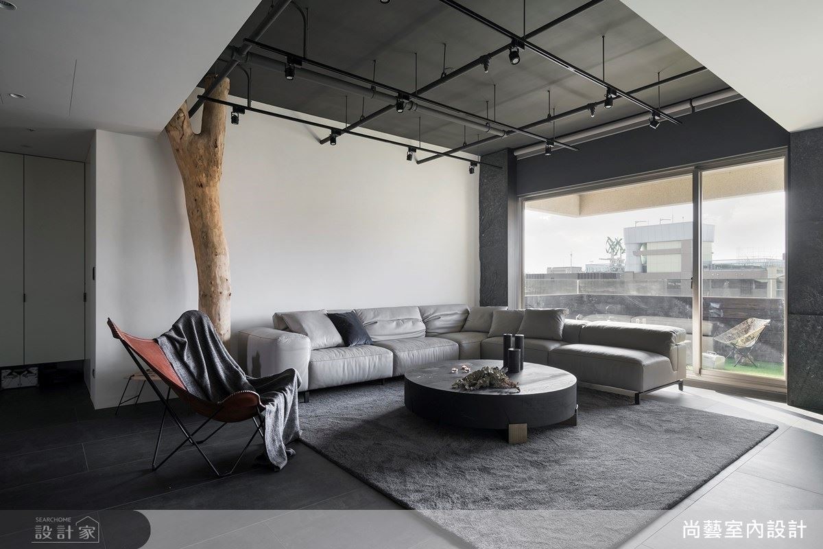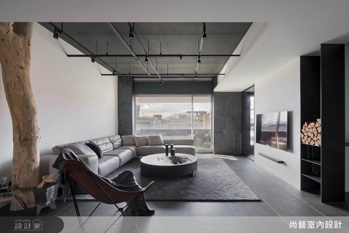 俞佳宏設計師認為人生於自然,最好的生活就是自然的延伸,運用「森林」的概念,在開放式客廳中運用樟木樹幹做為空間靈魂,地坪選用深色板岩磚烘托自然生成的生命力;搭配天然裂縫的茶几,使空間充滿想像;落地窗兩旁壁面選用天然石皮,營造岩壁洞穴般窗景,成功圍塑出自然度假的空間氛圍。