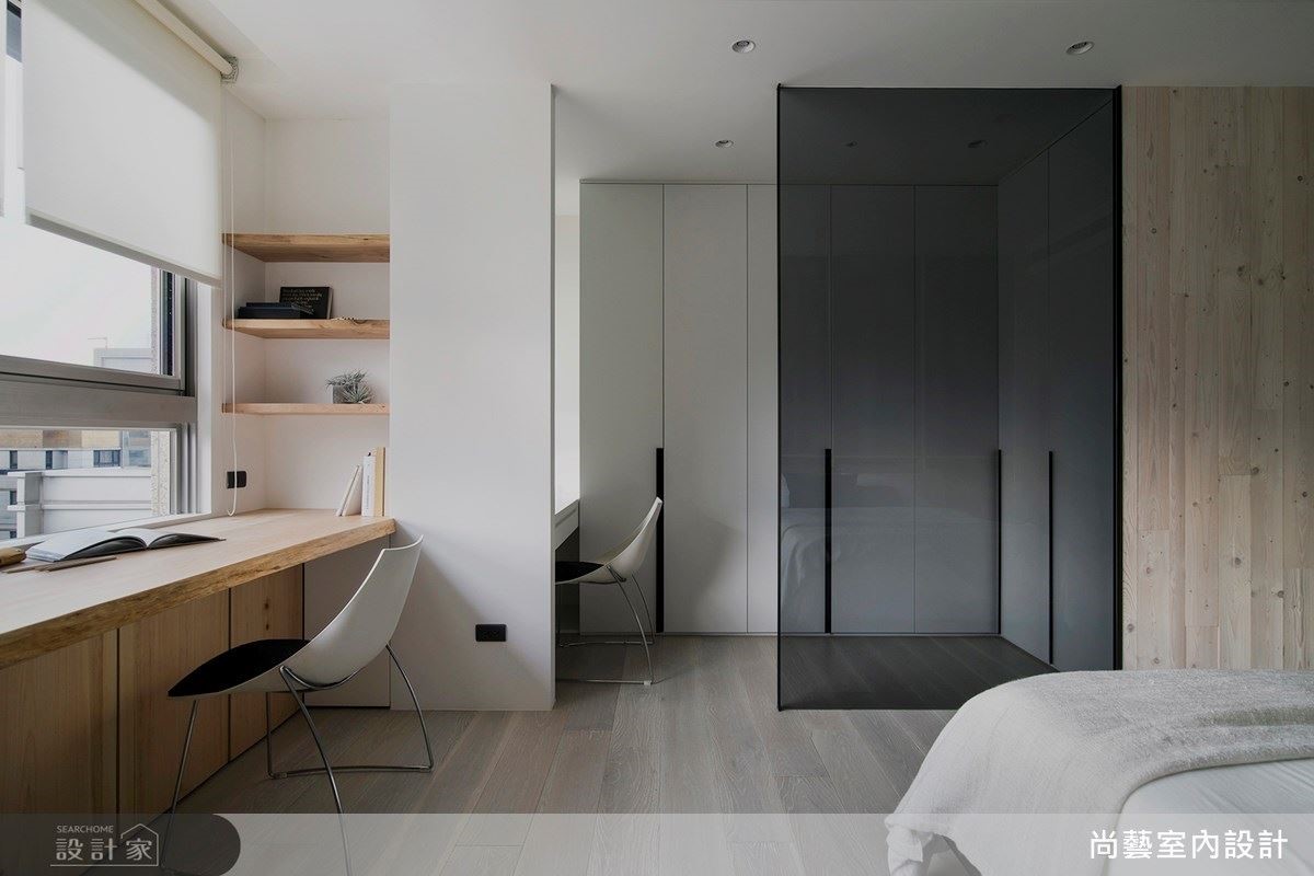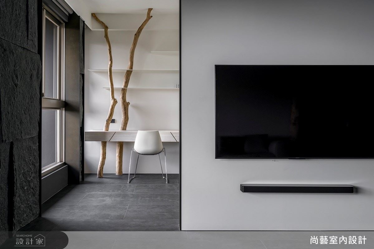 設計師重整格局,開放部分書房做為電視牆端景,延續樹幹概念做為書桌支撐結構,散發安定氛圍。電視牆運用薄鐵件搭配白牆,彰顯空間純粹單純的感受。