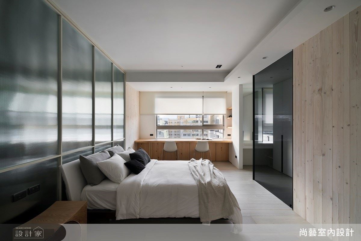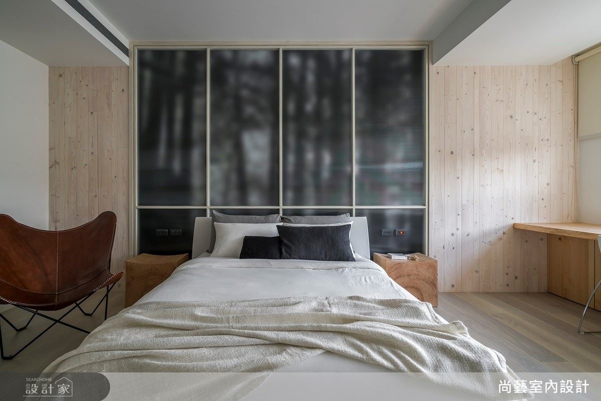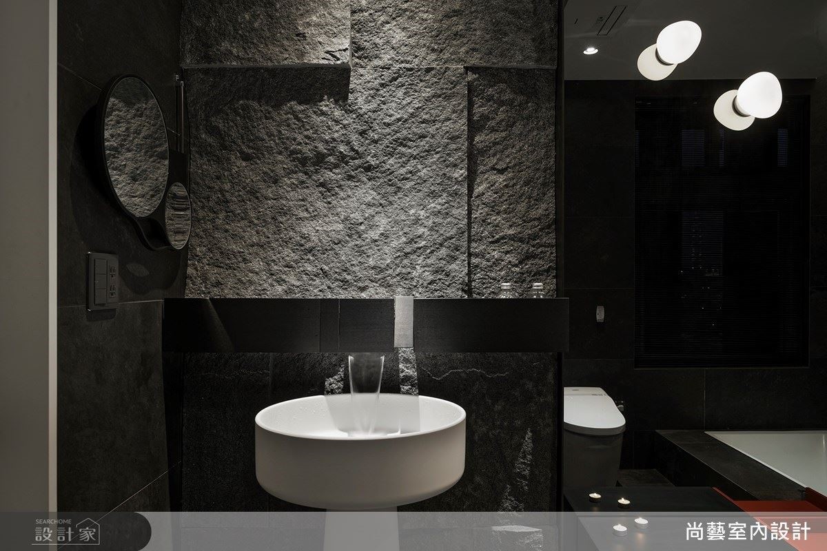 主臥納入簡約自然的設計語彙,結合機能與美感,完美掌握空間調性;主浴如此私密空間中,設計師運用石皮牆搭配造型衛浴,形成自然岩壁瀑布,讓屋主擁有夢想森林度假般的生活感受。