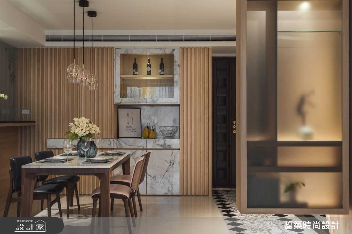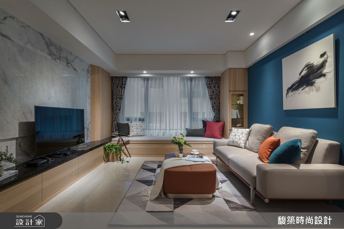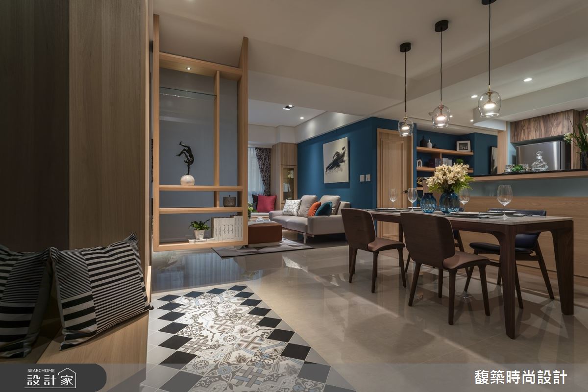 開放式的公共空間,玄關處透過地坪圖樣的轉換、便利的穿鞋椅,輕盈界定出獨立落塵區;兼具風水及展示收藏的霧面屏風,則帶給室內使用者隱私感。餐廳及廚房之間串接吧檯規劃,提供一家四口多元使用機能並帶來便利使用動線。坐擁大面積大理石電視牆的客廳區,則安排了窗邊臥榻,擴增坐位數並成為家庭成員回家放鬆的愜意小天堂。客廳沙發牆一路漫延至廊道的高飽和度藍色系牆面,不僅替生活裝點了活潑色彩,也帶來聚焦及延伸視覺效果。