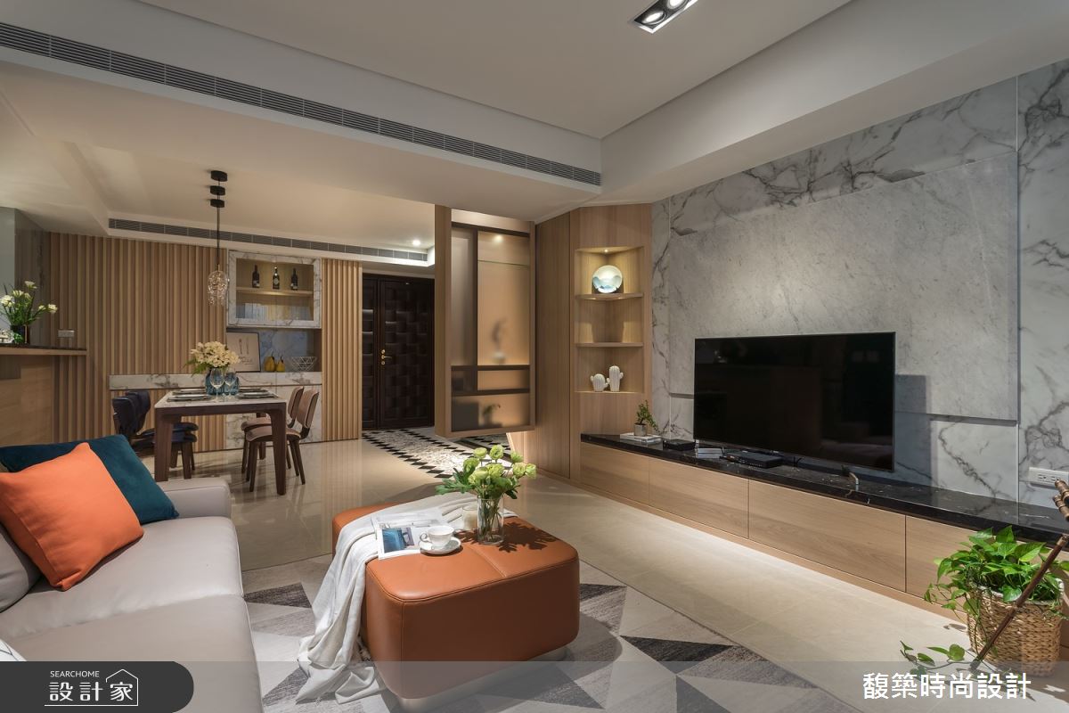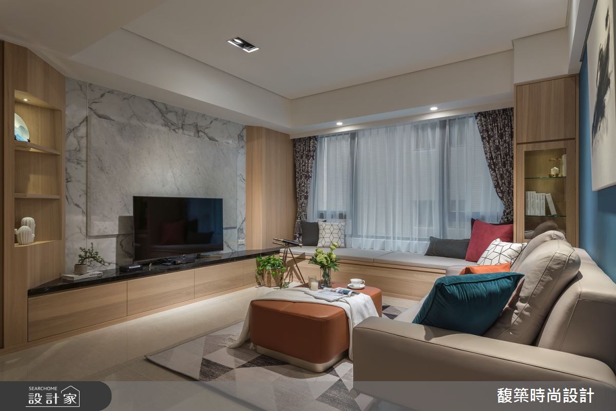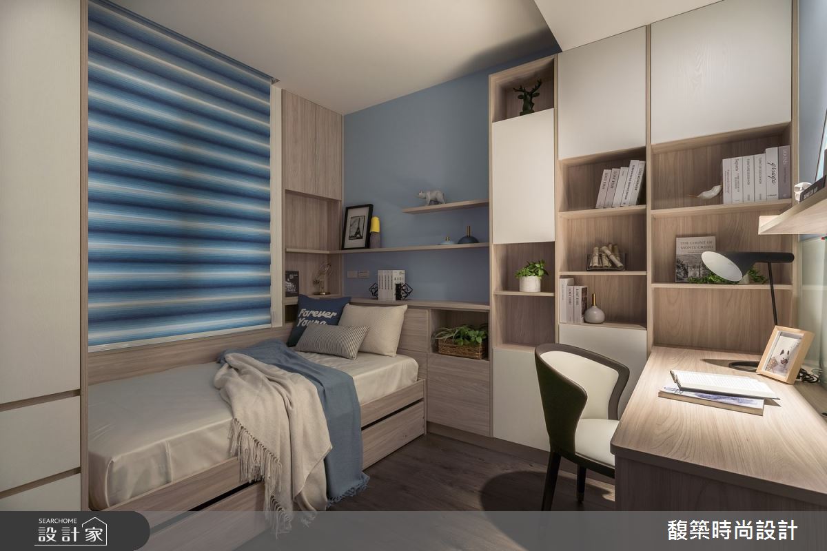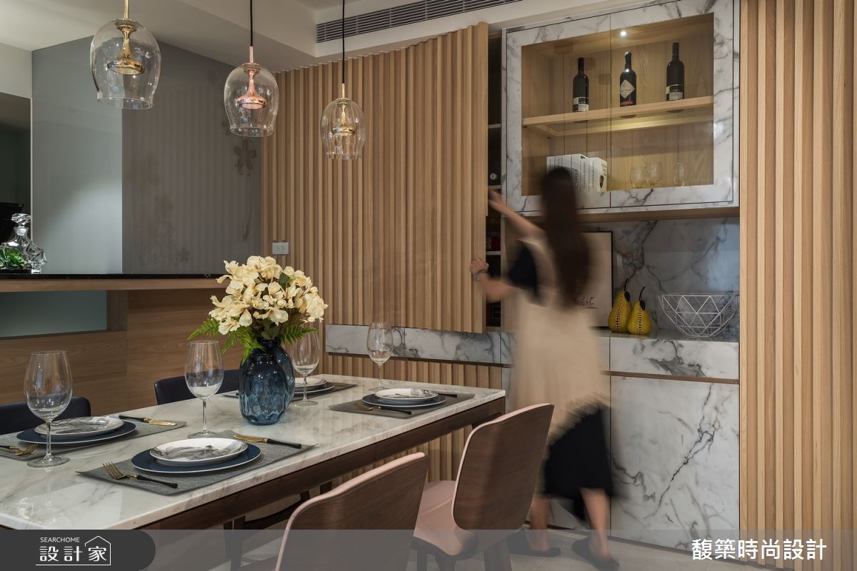 開放式的公共空間,玄關處透過地坪圖樣的轉換、便利的穿鞋椅,輕盈界定出獨立落塵區;兼具風水及展示收藏的霧面屏風,則帶給室內使用者隱私感。餐廳及廚房之間串接吧檯規劃,提供一家四口多元使用機能並帶來便利使用動線。坐擁大面積大理石電視牆的客廳區,則安排了窗邊臥榻,擴增坐位數並成為家庭成員回家放鬆的愜意小天堂。客廳沙發牆一路漫延至廊道的高飽和度藍色系牆面,不僅替生活裝點了活潑色彩,也帶來聚焦及延伸視覺效果。