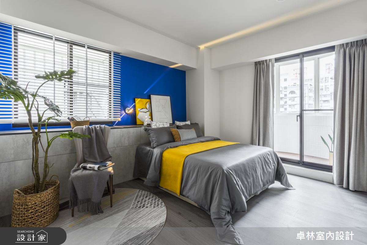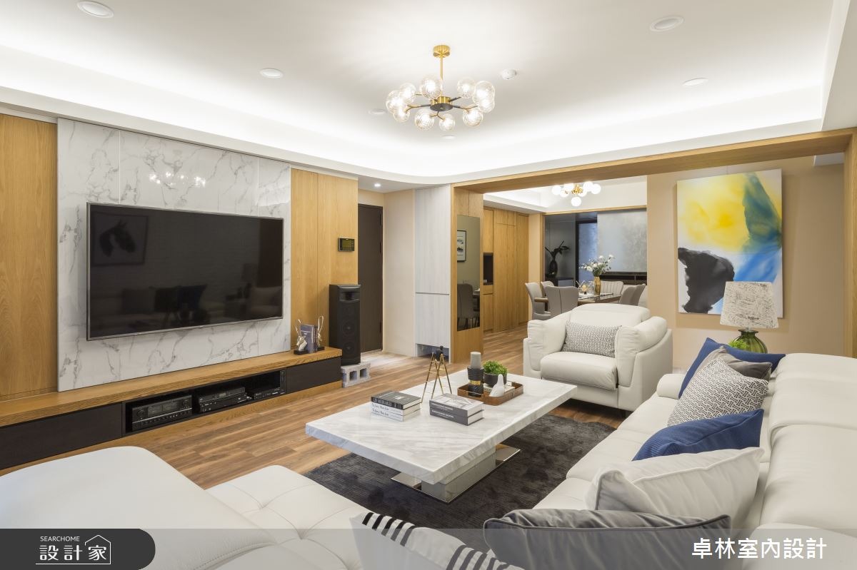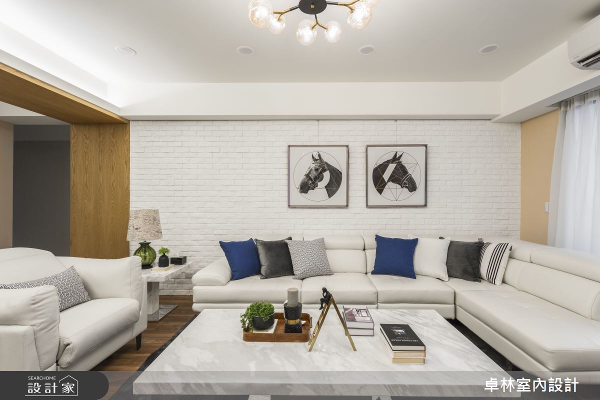 以白色文化石所鋪陳的沙發背牆為視覺焦點,匹配風格獨特的藝術掛畫,在斑駁質地中勾勒搶眼的個性樣貌,並以木質調和純白色系加以調和,建立舒適又迷人的生活場域;大理石替代材質的電視牆可左右橫移,其後有大量的收納空間,滿足全家大小的居家物品收納需求。天花板則以圓弧造型,化解樑柱帶來的壓迫感,隱含間接光源,為室內補足明亮採光。走入餐廚區域,和客廳相互開放,擘劃一氣呵成的使用動線,同時運用樑下空間配置系統木櫃,滿足一家五口的收納需求,創造彈性且充裕的生活機能。臥室內,以搶眼的湛藍色系描繪明朗氣息,呼應亮黃色的軟性家飾,在充沛的和煦日光下,營造舒適而愉悅的休憩空間。