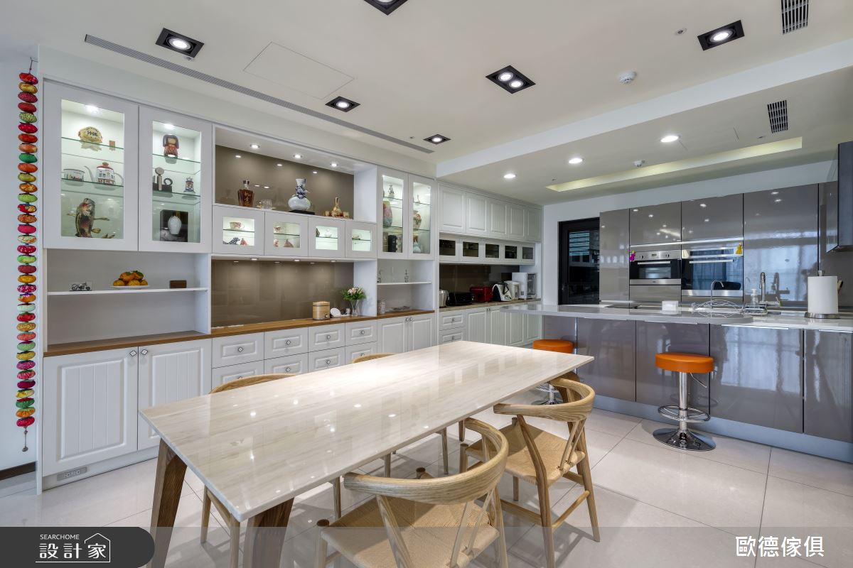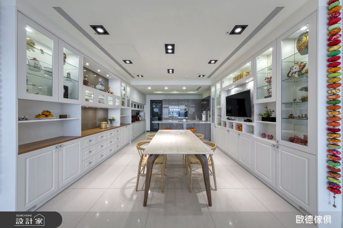 屋主家透過大量的白色線板結合木紋系統家具,譜出明亮、素雅的玄關風尚;左側以刷白的鋼刷木皮做為門扇,隱藏大量的收納機能,強化生活實用度。客廳電視牆襯以淡雅紋理的石材,結合立體感線板框出視覺焦點,兩側以壁紙、古典玻璃壁燈點綴,調和現代與鄉村風氣息;餐廚領域合併,餐桌兩側以白色系統櫃串連展示與收納機能,穿透感的玻璃材質更營造輕盈視感,有效放大空間。兒子家的入口玄關,則透過自然木紋的妝點,挹注溫潤質感;寬敞的公領域裡,電視牆以帝諾大理石打造,引入俐落、非凡器度;沙發背牆以鋼刷柚木皮板結合不規則間距的鍍鈦壓條,且延伸至餐廳領域,轉化為小孩與傭人房的門片,營造出視覺層次與變化;餐廳空間裡,讓淺色木紋的櫃體創造出收納兼具展示的大型櫃體,黑色線條則描繪出深度與美感層次,令人驚豔。