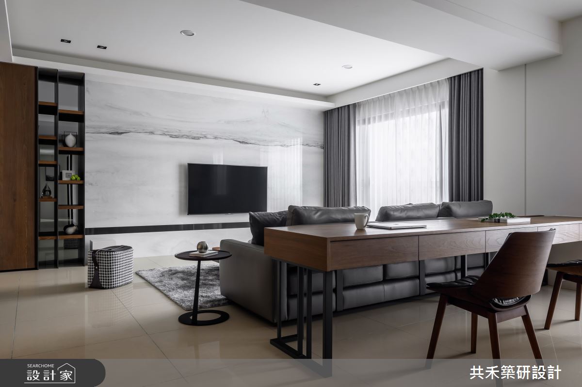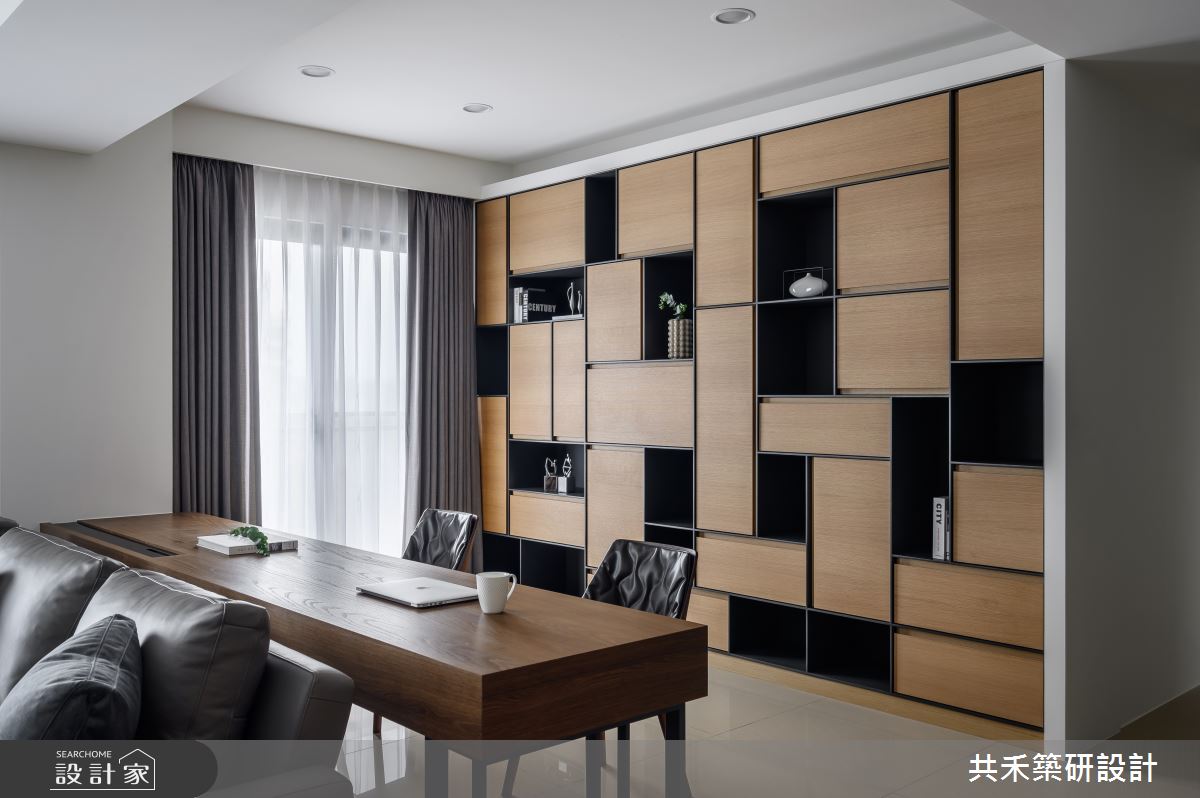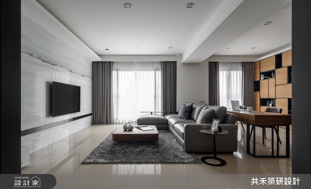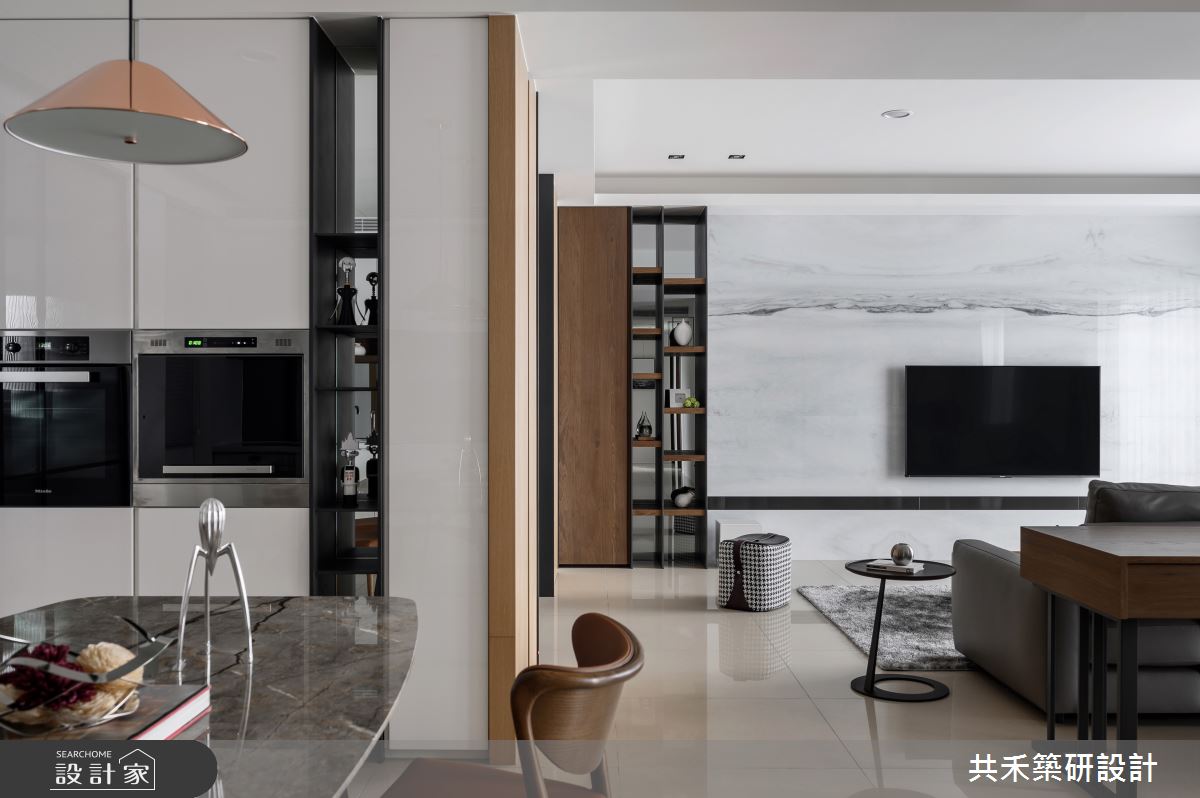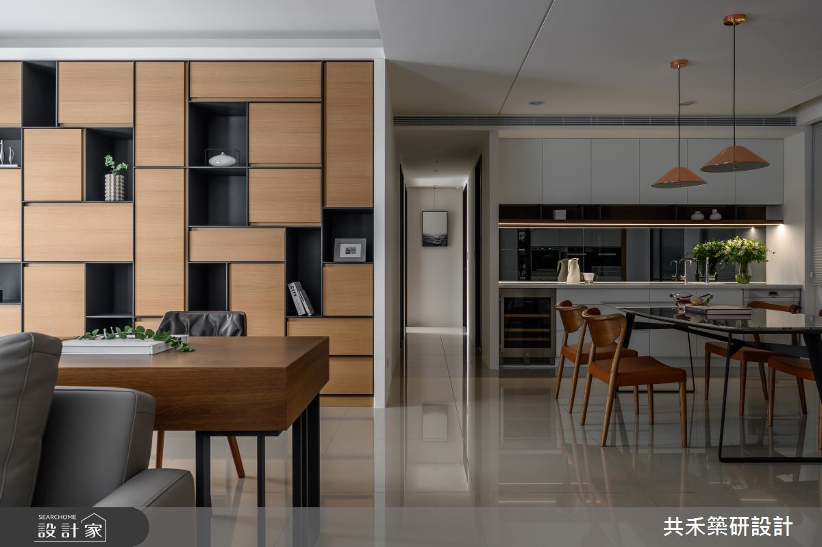 甫入玄關,一道莫蘭迪藍印入眼簾,系統櫃體與藝術品的陳列,恰恰形成迎賓處的端景牆面,更和大理石紋界定出落塵區。開放式的公領域,串起客廳、書房和餐廚區域,營造寬敞通透的視野,並藉由山水石紋的電視主牆,鋪排大方的非凡氣勢。書房區域,則以直橫錯落的格狀設計,結合展示和收納功能,形塑獨一無二的空間輪廓,伴隨藝術品的襯托,展現出雅緻的人文風情。餐廚區域,設置電動玻璃門,區分熱炒區和輕食吧台,屏除熱氣和油煙進入,創造彈性而多變的生活場域。