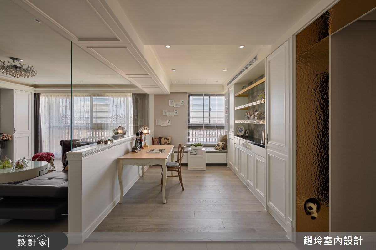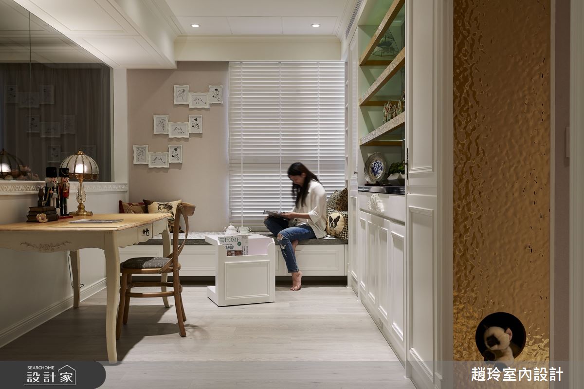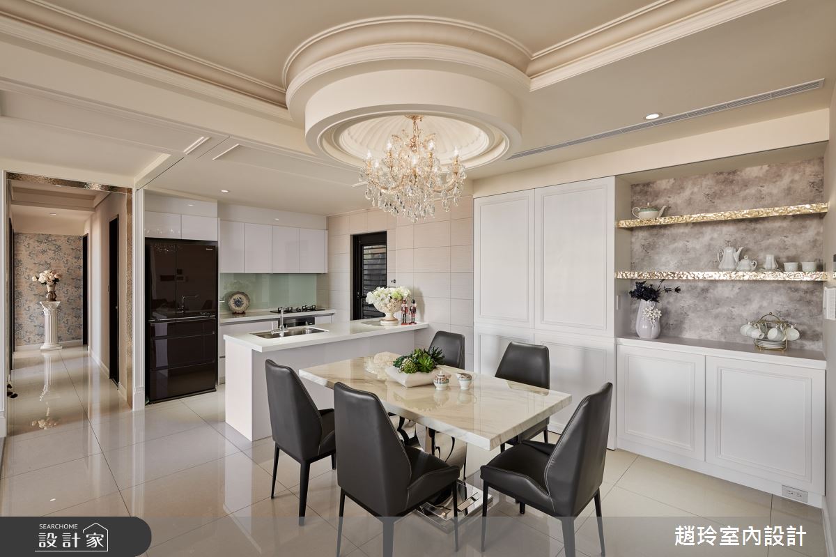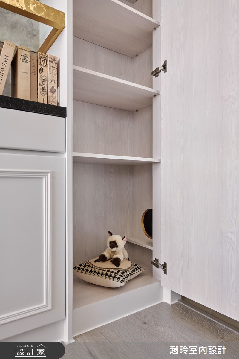 公領域以純白色系為基底,運用大理石、金色元素妝點其中,增添精緻華美的居家表情。格局擘劃上,一氣呵成串連起客廳、書房和餐廚區域,適度加入透明玻璃的輕隔間,營造寬敞開闊的樣貌,並藉由天花板的層次鋪排,以線版化解大樑的突兀感,將視覺焦點落於圓型穹頂內的水晶吊燈,孕育細緻與古典的和諧之美。通往私領域的金色拱門,暗藏著和書櫃相通的貓洞,內裡擺放碗盆和貓砂,讓陪伴全家的喵星人也能擁有專屬天地。