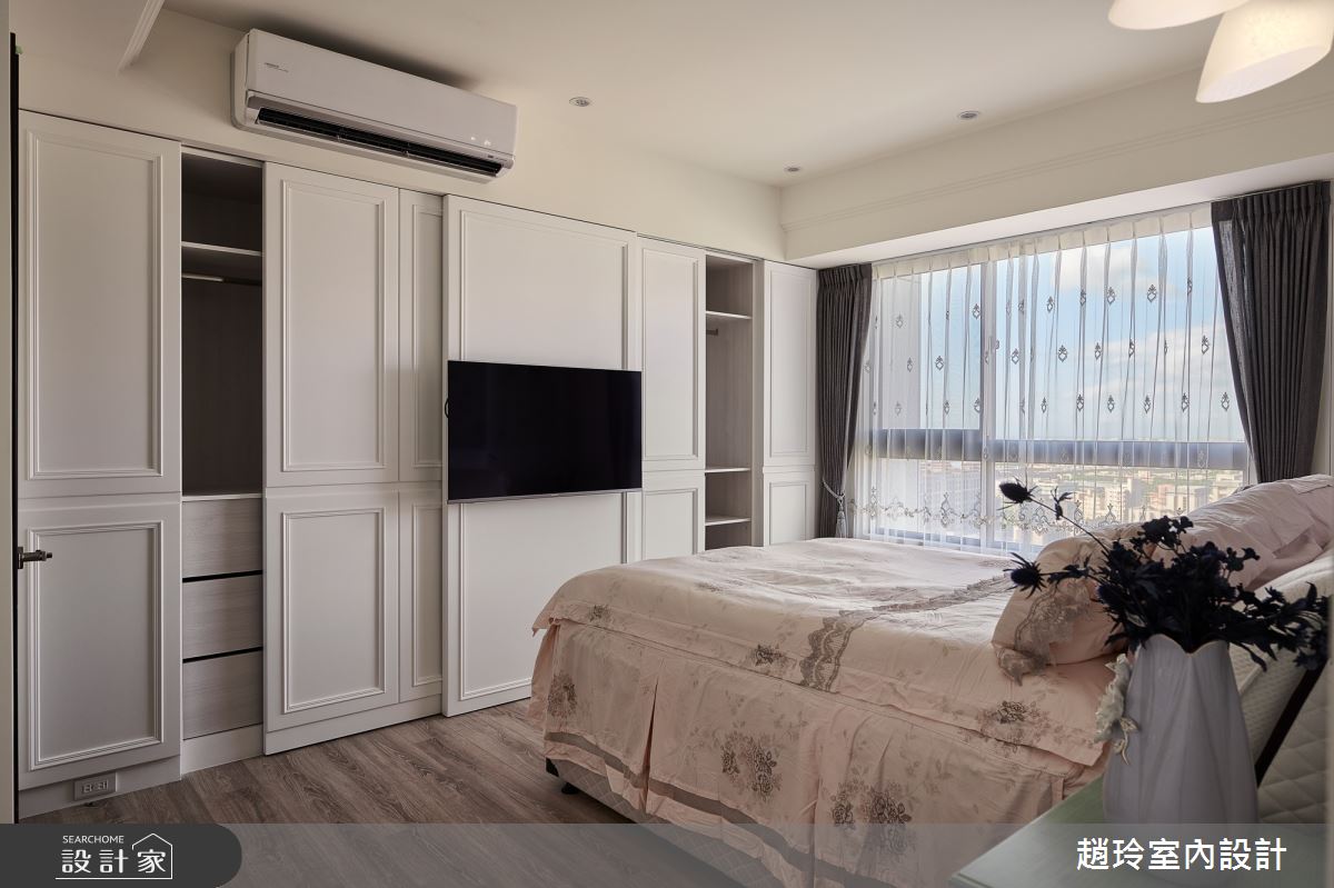 主臥內,鋪陳淡雅溫馨的碎花壁紙,勾勒放鬆與舒適的空間感,並以隱藏式設計,藉由衣櫃和儲藏室滿足屋主的收納需求,兼具美觀和生活機能。