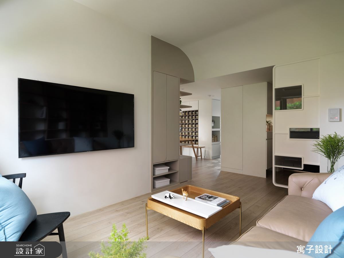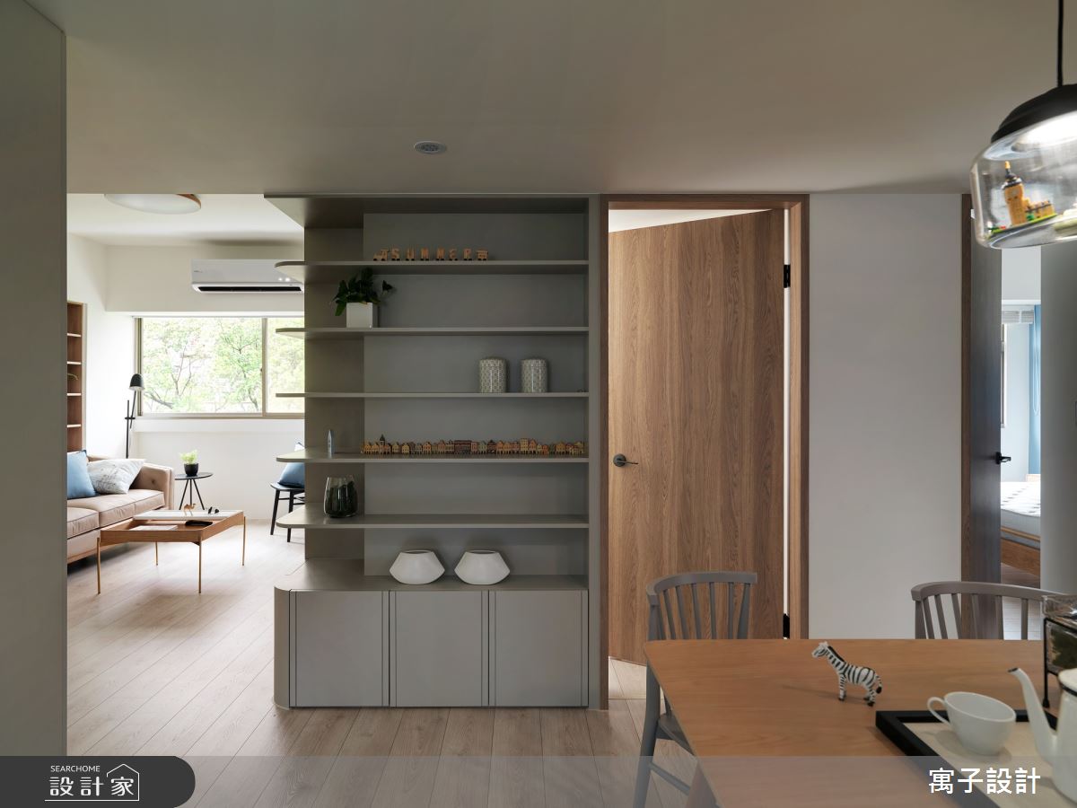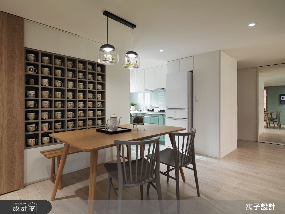 喜歡旅行的屋主夫妻,平常喜歡帶領孩子去發掘探險,體驗更多的人、事、物,因此寓子設計透過設計手法讓旅行的意義也帶進生活之中。從大門入內,玄關使用白色收納櫃並透過鏡面放大廊道尺度,並透過造型格柵調整開門見窗的風水問題。客廳焦糖色的沙發與後方木作展示櫃相互呼應,在這裡可以擺放旅行的紀念品,休閒時能時刻記憶,而從電視牆面延伸至餐廳的雙面櫃,則以暖灰色及特殊弧形線條對應沙發背牆。屋主平時有蒐藏星巴克馬克杯的習慣,設計師在餐廳特別設計一道杯牆,既是展示取用也十分方便。主臥則跳脫公領域的淡雅,牆面以水藍幾何展現空間活力。