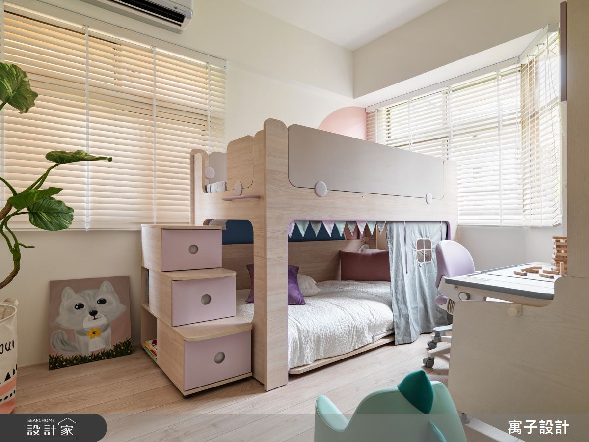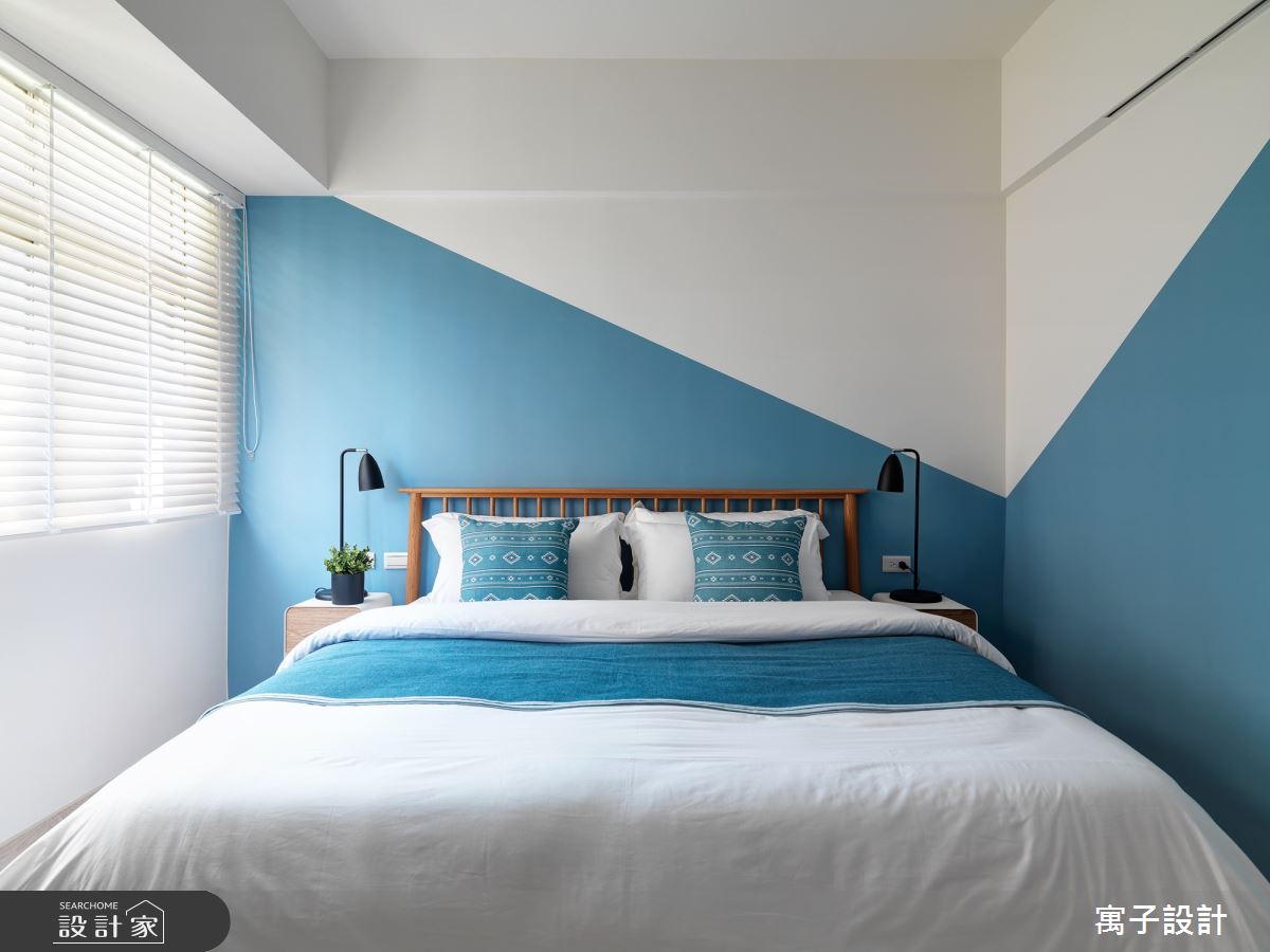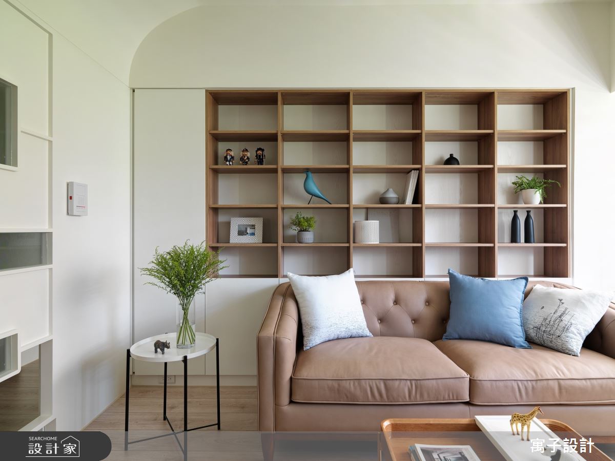 喜歡旅行的屋主夫妻,平常喜歡帶領孩子去發掘探險,體驗更多的人、事、物,因此寓子設計透過設計手法讓旅行的意義也帶進生活之中。從大門入內,玄關使用白色收納櫃並透過鏡面放大廊道尺度,並透過造型格柵調整開門見窗的風水問題。客廳焦糖色的沙發與後方木作展示櫃相互呼應,在這裡可以擺放旅行的紀念品,休閒時能時刻記憶,而從電視牆面延伸至餐廳的雙面櫃,則以暖灰色及特殊弧形線條對應沙發背牆。屋主平時有蒐藏星巴克馬克杯的習慣,設計師在餐廳特別設計一道杯牆,既是展示取用也十分方便。主臥則跳脫公領域的淡雅,牆面以水藍幾何展現空間活力。