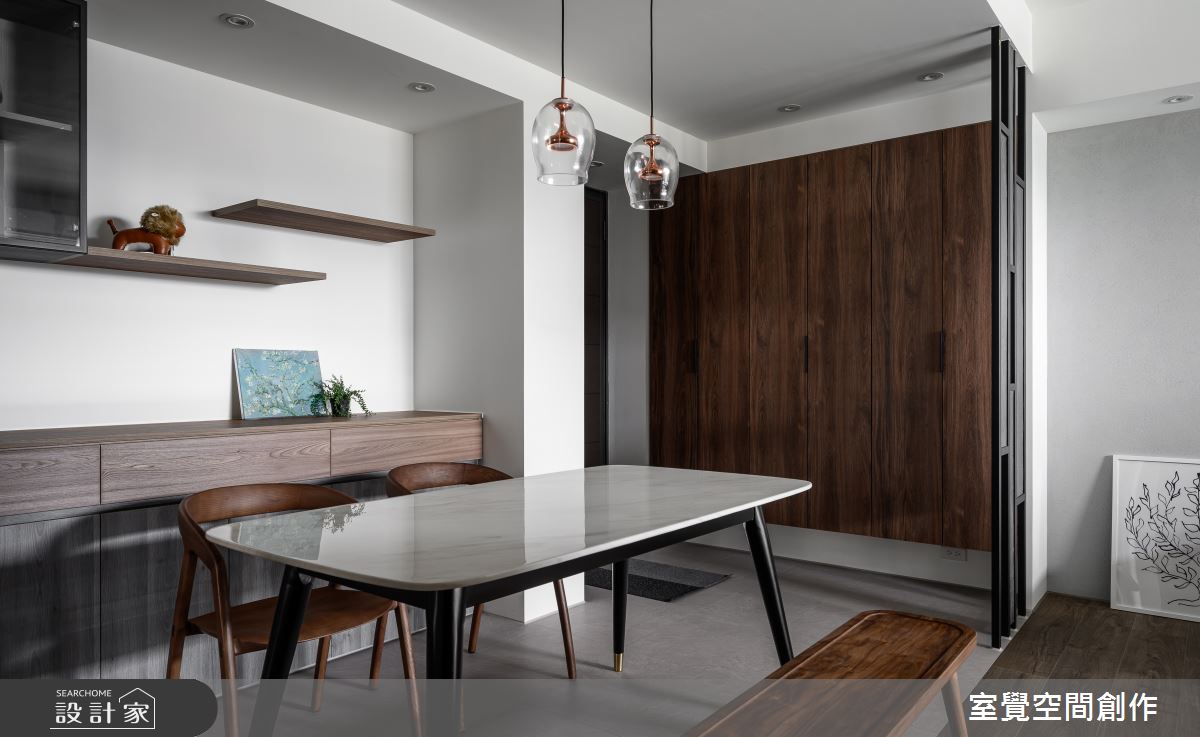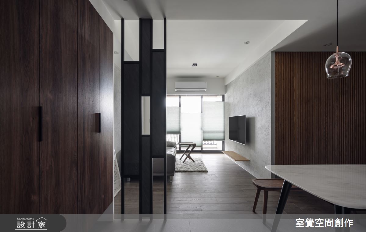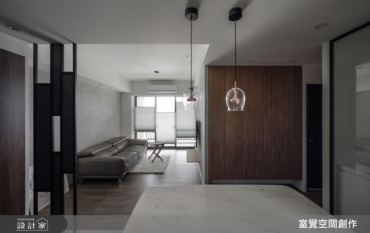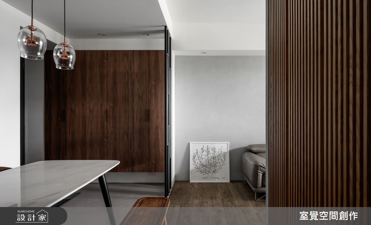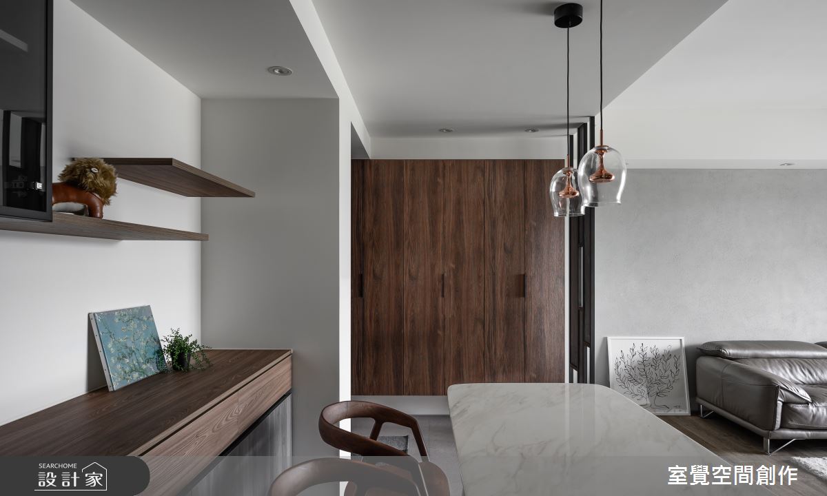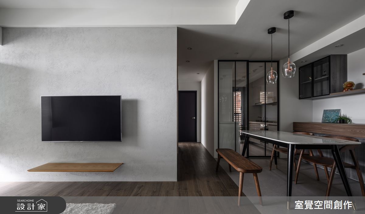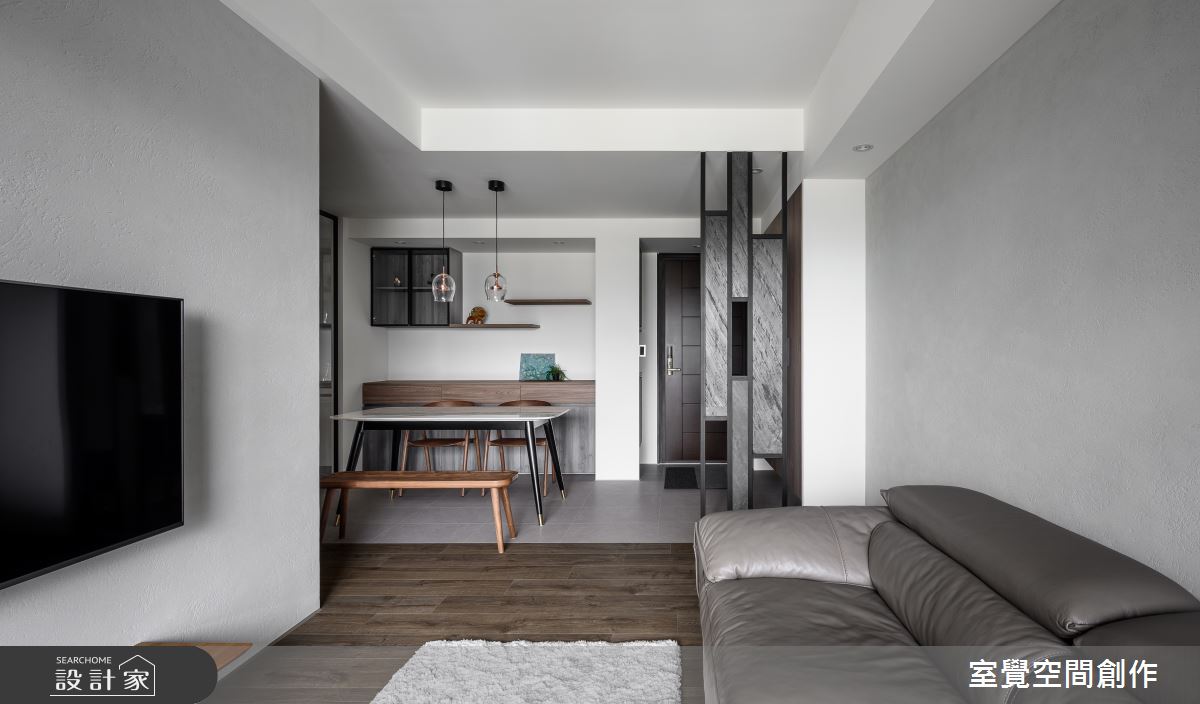 玄關區域,透過隱藏式設計,將系統鞋櫃切齊樑下,簡約俐落的風格中添加收納機能,並以縷空的鐵件屏風為界,化解開門見窗的風水疑慮,又保持視線的流通性。公領域,透過客、餐廳相互串連,讓小坪數也能呈現寬敞視野,電視主牆和沙發背牆則鋪陳灰階仿飾漆,以手感紋路刻畫溫暖的居家氛圍。藉由地坪的材質轉換,走入餐廚區域,透明感燈飾和大理石桌面,營造寧靜悠閒的用餐時刻,旁側的玻璃拉門,屏除廚房的熱氣和油煙,更讓視線能向外延伸,維繫輕盈通透的視覺感受。