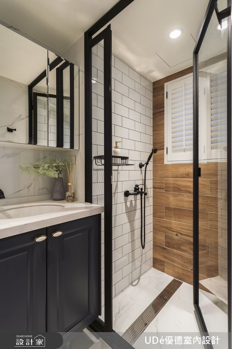 從大門進入玄關空間,這裡是迎接每一位成員回家的第一個空間,也是歐美住宅最重視的部分,L型的設計讓視野感到開闊不窘迫,並運用復古地磚從入口就營造歐洲鄉村氣息。推開玻璃格子門扇即是客廳場域,二進式設計讓空間饒富層次,同時也保有豐富採光與穿透視覺。公共空間中以白色為基底,襯托窗戶的大量自然採光,再添加線板、百葉窗等經典美式元素,呈現簡約卻優雅的古典線條,輔以溫潤的木地板,顯得相當溫馨。轉入主臥,藉由牆面變動打造女主人夢想的專屬更衣室,而床頭封板使用黑色巧克力磚塊造型與衛浴黑色蓮蓬頭相互呼應,營造與公共空間迥異的鮮明個性。