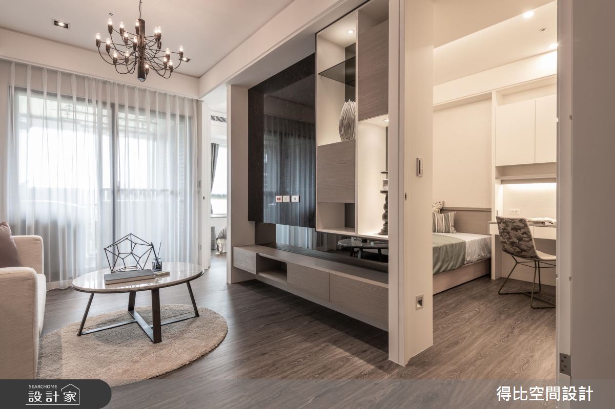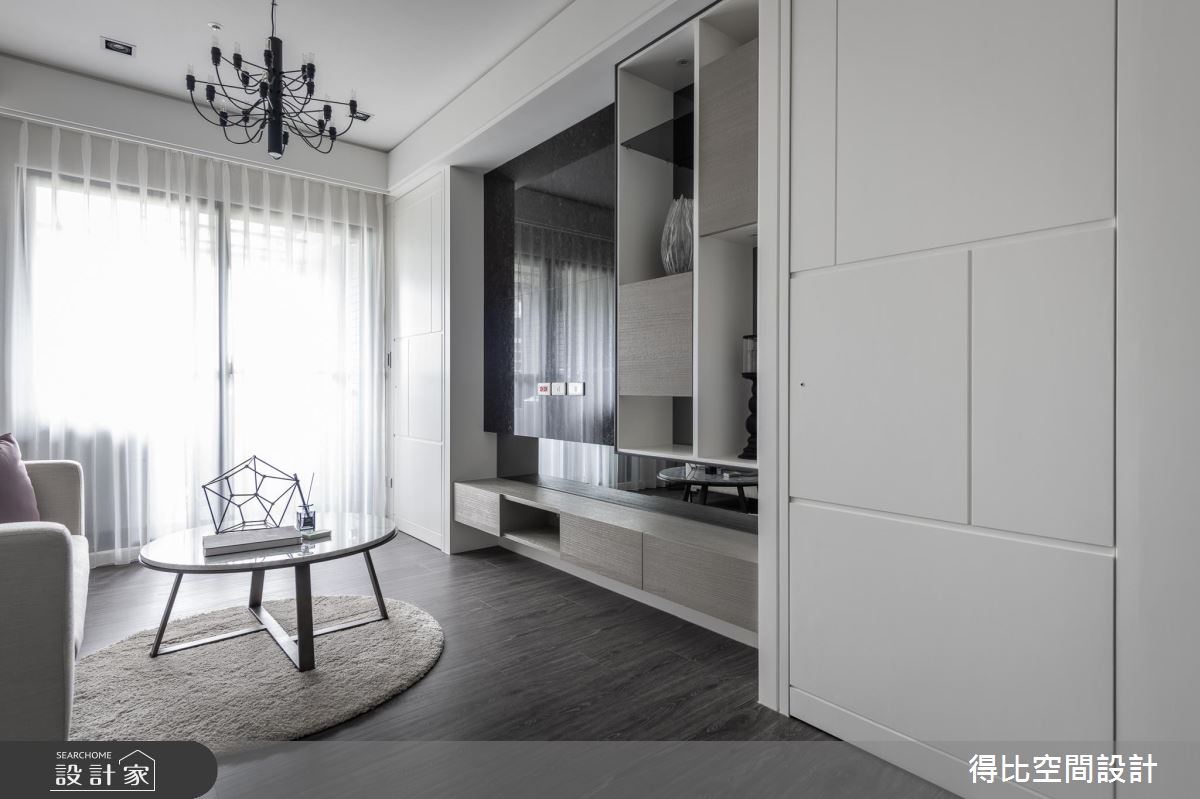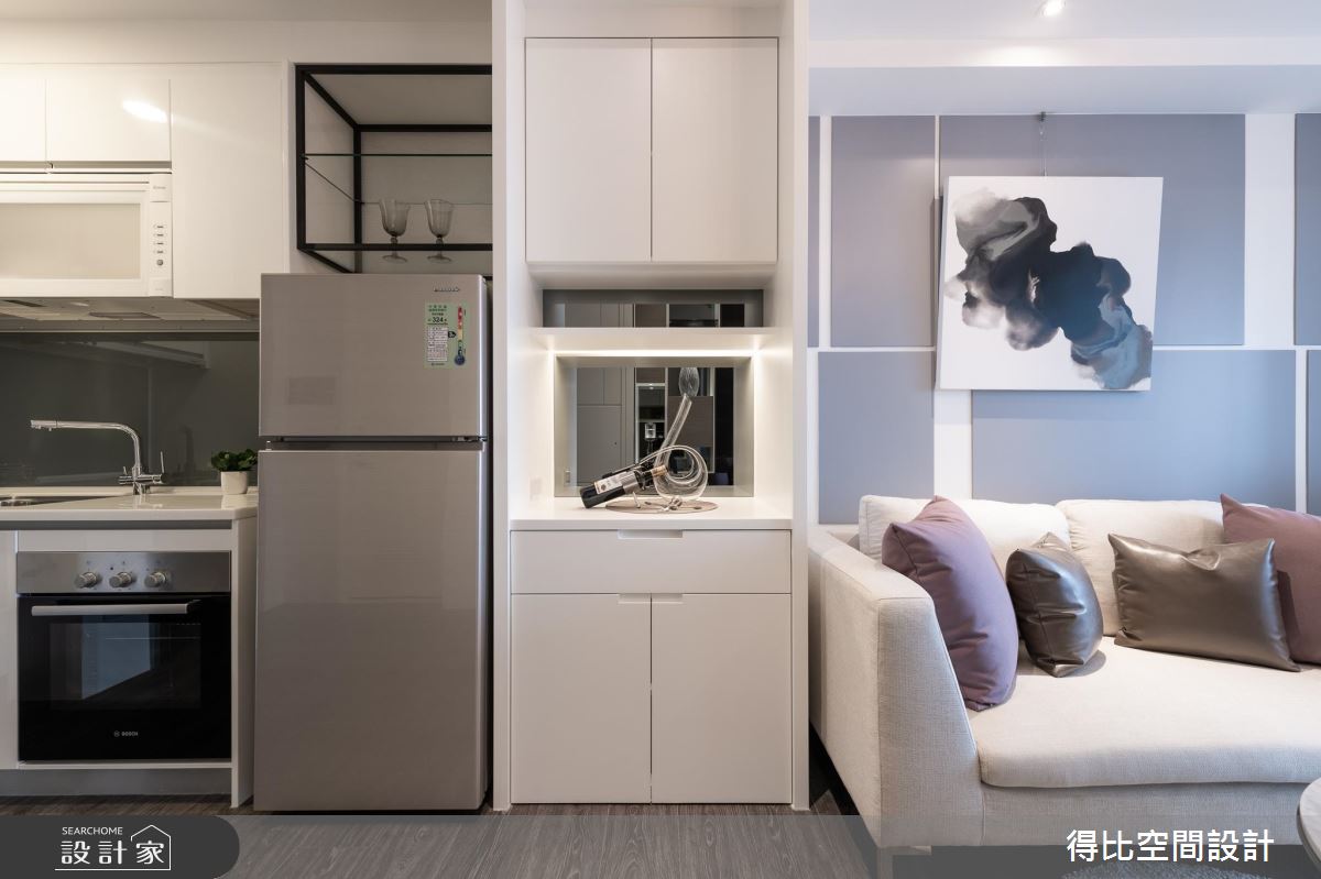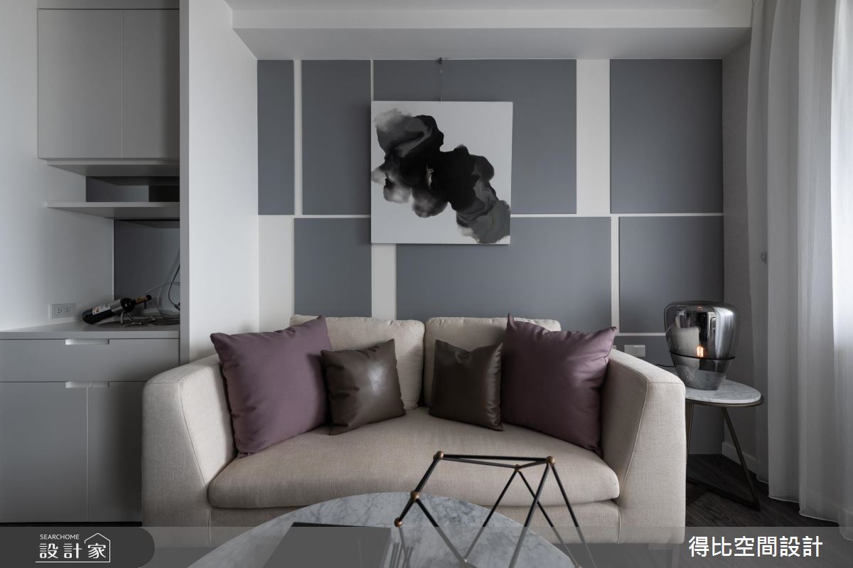 小坪數裡,為了滿足日常的收納機能,又希望營造出開闊、明亮的空間感受,收納櫃體盡量擺設於兩側壁面,讓出更多領域空間,室內自然更顯寬敞、放大。客廳裡,沙發背牆以灰色調錯落拼接,懸掛一幅黑白色調渲染的濃淡畫作,搭配米色沙發與跳色抱枕,演繹簡約的時尚美感,轉化為空間的視覺重點;電視牆則以深色大理石鋪陳,加深領域的重點,側邊則結合陳列展示櫃,伴隨櫃內風格物件的擺設,形塑人文美學氣息;電視牆的旁邊以一道白色拉門,界定一處臥室空間,門扇關上後,透過線調感的立面設計,與空間裡的現代感線條相互呼應;沙發旁邊以一長形收納櫃巧妙界定客廳與廚房領域,滿足機能的同時更兼具視覺美感。