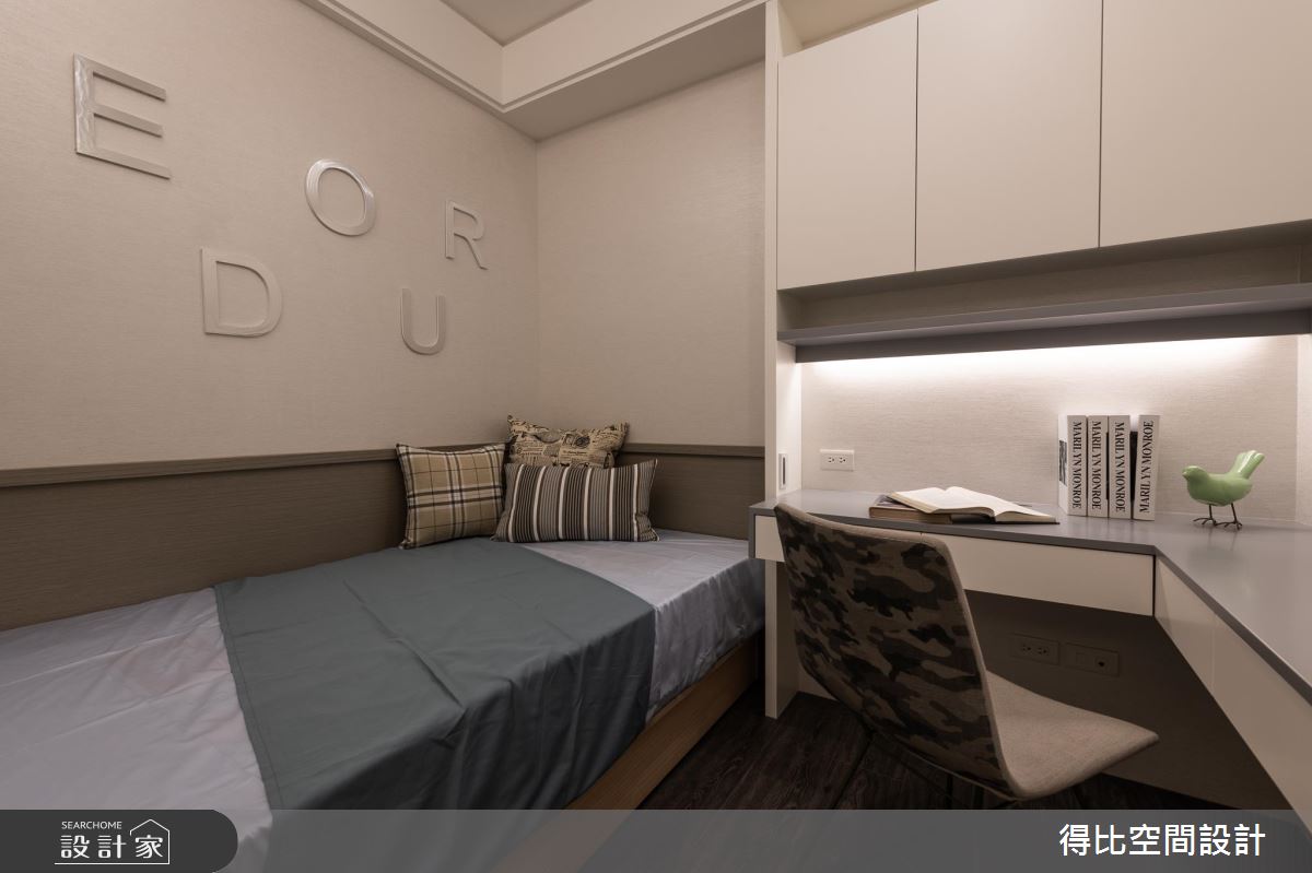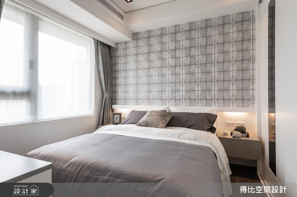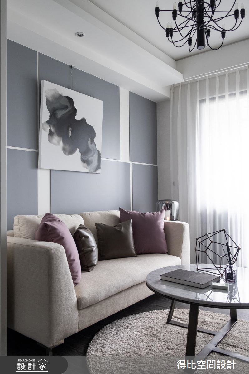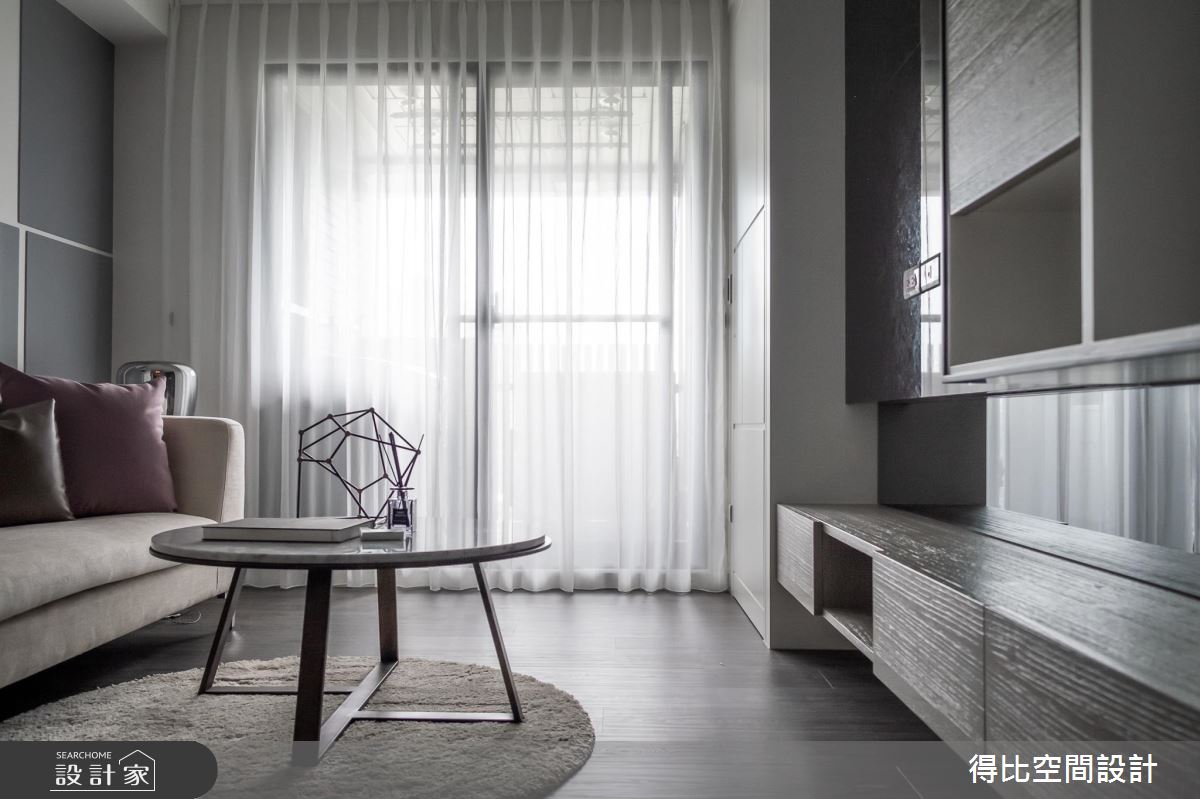 小坪數裡,為了滿足日常的收納機能,又希望營造出開闊、明亮的空間感受,收納櫃體盡量擺設於兩側壁面,讓出更多領域空間,室內自然更顯寬敞、放大。客廳裡,沙發背牆以灰色調錯落拼接,懸掛一幅黑白色調渲染的濃淡畫作,搭配米色沙發與跳色抱枕,演繹簡約的時尚美感,轉化為空間的視覺重點;電視牆則以深色大理石鋪陳,加深領域的重點,側邊則結合陳列展示櫃,伴隨櫃內風格物件的擺設,形塑人文美學氣息;電視牆的旁邊以一道白色拉門,界定一處臥室空間,門扇關上後,透過線調感的立面設計,與空間裡的現代感線條相互呼應;沙發旁邊以一長形收納櫃巧妙界定客廳與廚房領域,滿足機能的同時更兼具視覺美感。