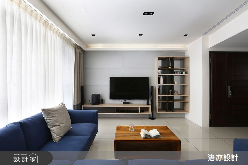 玄關刻意在系統櫃下方留空,方便掃地機器人清潔地板,同時在視覺上也較為輕盈。而考量到坪數的限制,設計師從玄關至餐廳牆面,透過灰鏡修飾櫃體,藉此放大空間坪效,室內也更加明亮。另外,客廳電視牆則以低彩度色彩妝點,襯托藍色沙發與原木感茶几的色澤,使室內散發清爽氣息。