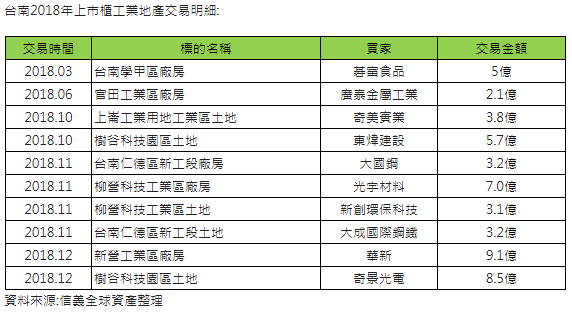 觀察今年(1-10月)工業地產上市櫃交易量,台中與新北並列全台第二,僅次於桃園,大立光積極布局台中,從2016-2019年購入台中1處素地,未來將開發為商辦,以及4處台中工業區廠房,可供產能擴充使用,總交易金額高達65億元。另外,值得關注的是,台南工業地產交易量也逐漸升溫,2018年交易量也來到全台第二,大型企業包括華新、奇景光電、光宇材料、奇美實業等,今年更吸引Google宣布加碼投資台灣,將在台南科技工業區購地,興建第2座資料中心,顯現出工業地產需求持續擴大。
