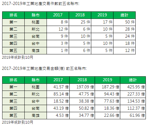國際貿易衝突轉單效應持續擴大,除了中美貿易戰發酵外,近來日本與韓國貿易僵局也持續緊張,為台灣帶來許多大廠回流現象。工業地產交易從2017年受到大陸政策影響逐年攀升,根據信義全球資產統計,今年工業地產交易金額(1-10月)已達去年整年交易金額的9成,來到467億元,桃園依舊是上市櫃首選之地外,其中,還觀察到台中的交易量迅速攀升,來到全台第二交易熱區,受中美貿易戰回台大廠包括大立光以及台灣櫻花等,另外,值得一提的是台南工業地也不惶多讓,吸引國際大廠google宣布投資南科。