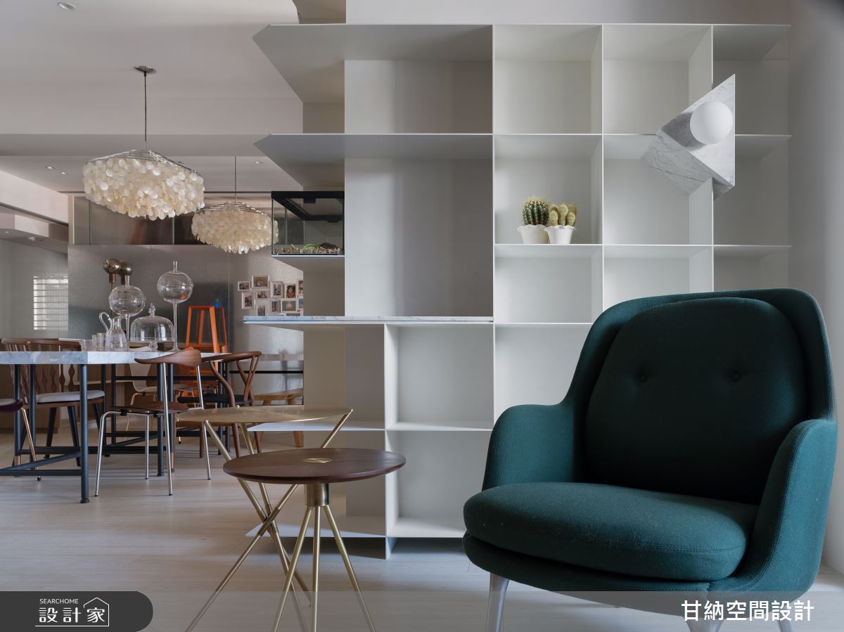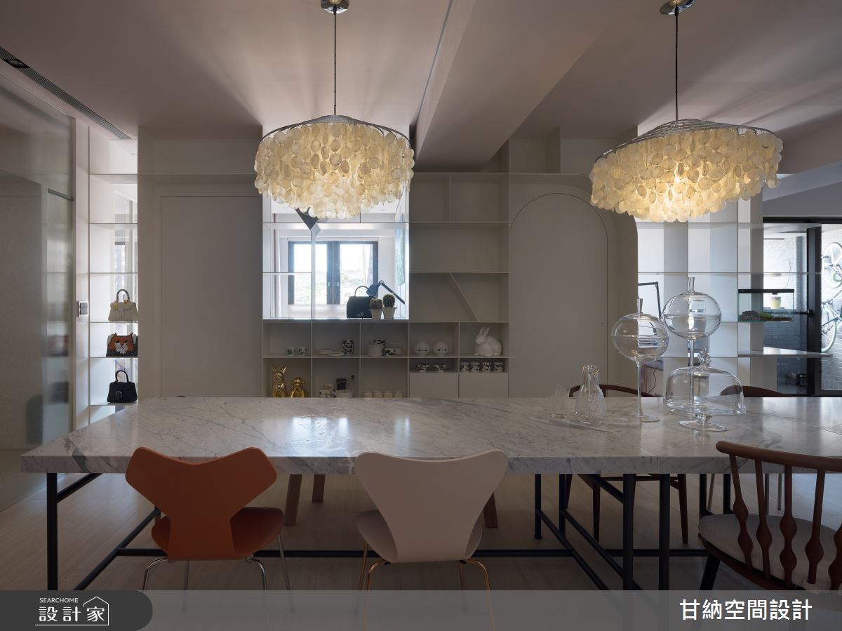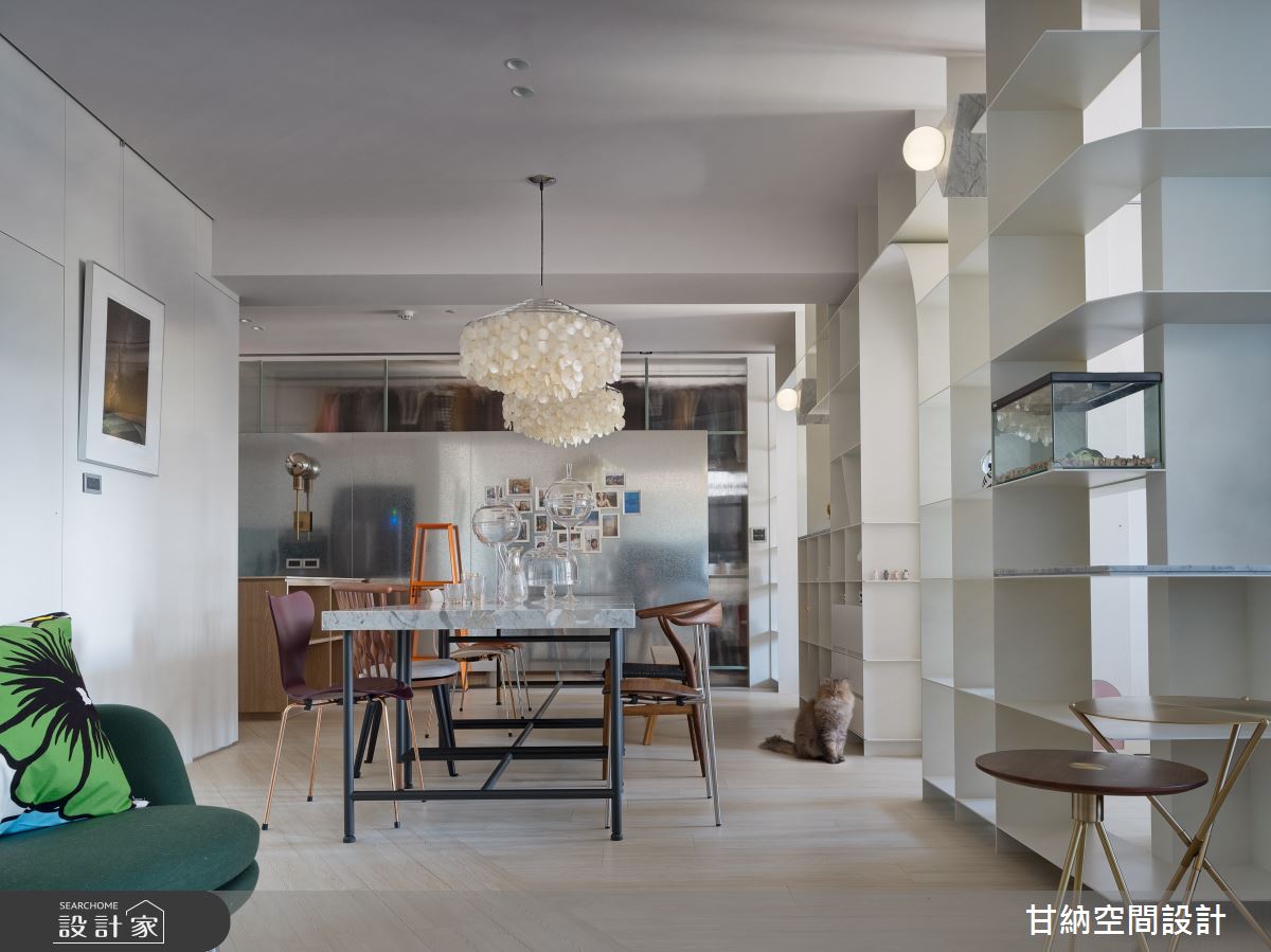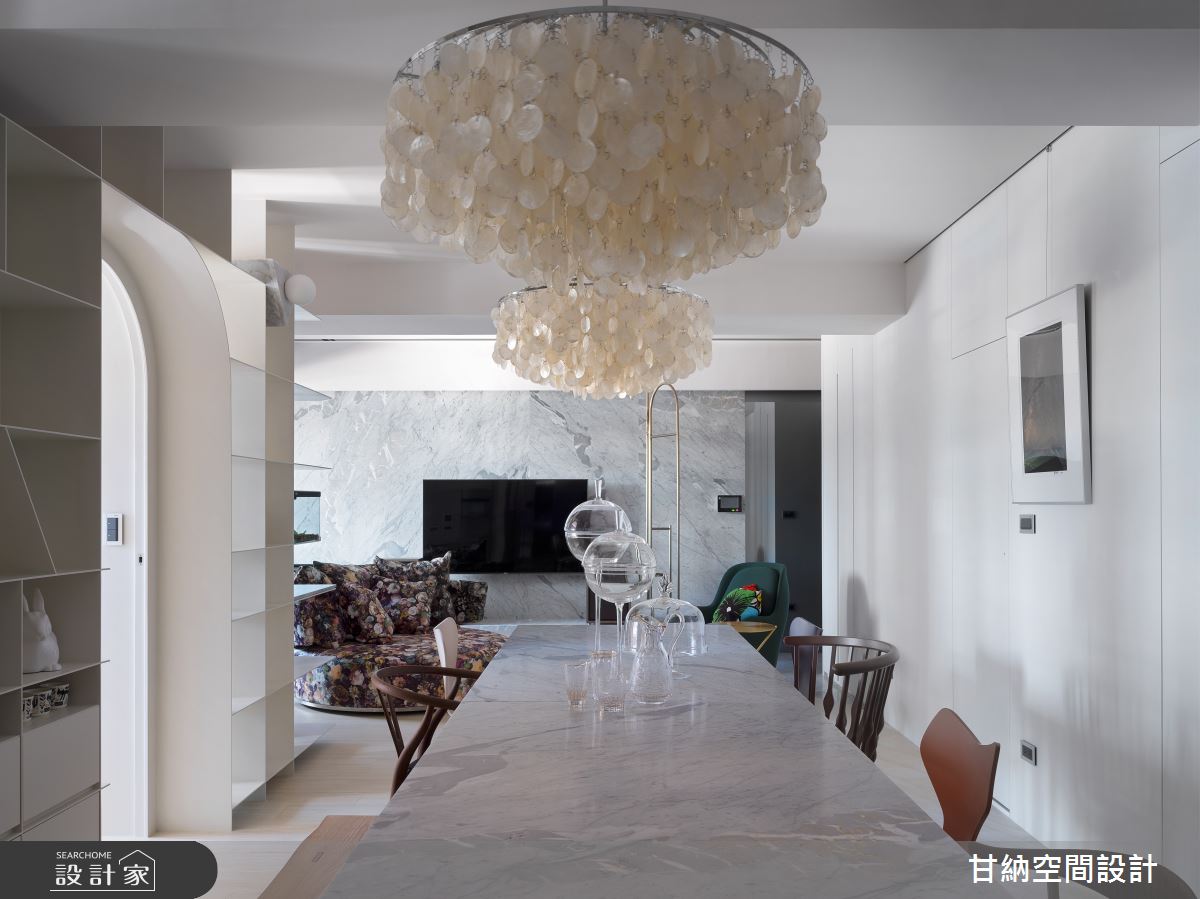 Home Data人們常說「家」可以代表一個人的個性,而空間裡的設計就像是居住者的衣著,以藝術形態的方式反應你我的內在世界。24坪大的新成屋裡,寬敞的公領域規劃,襯著鍍鋅鋼板化成的磁鐵牆作為背景,大理石紋長桌與多張經典名椅齊聚,把聚會的熱鬧與歡愉凝結在住宅裡;丹麥設計師Verner panton的貝殼吊燈,為全室的純白點綴溫柔的光澤,創造獨處時的詩意與寧靜。