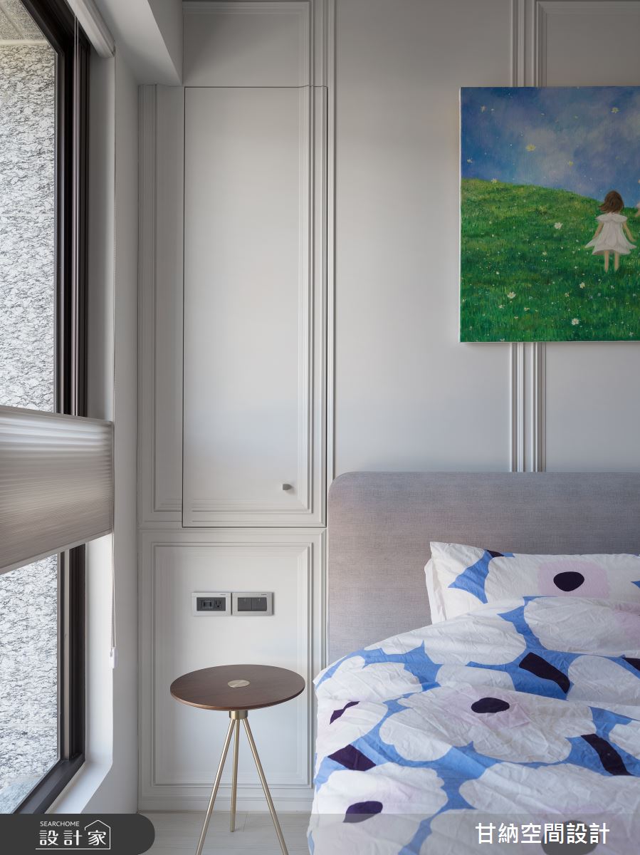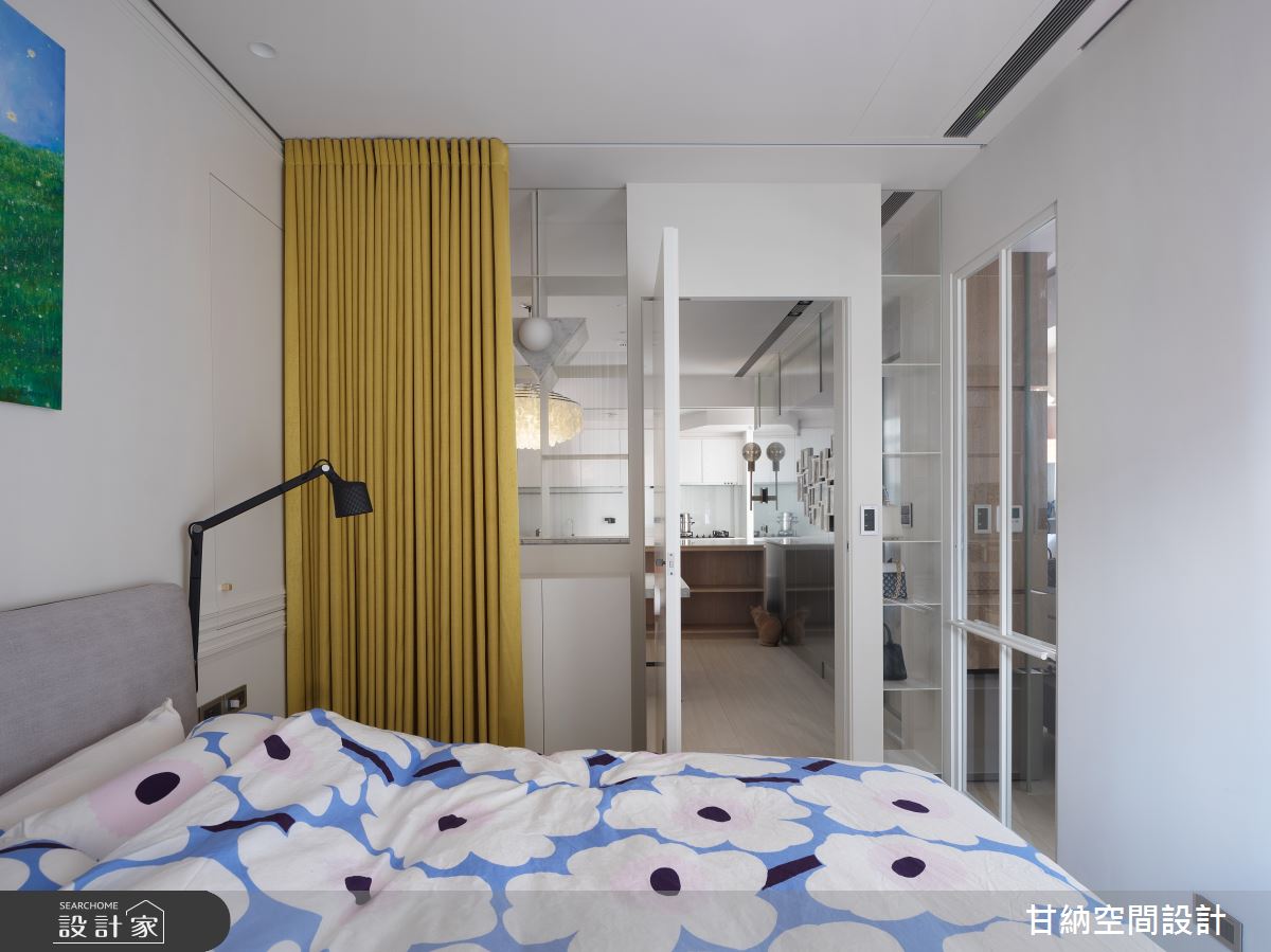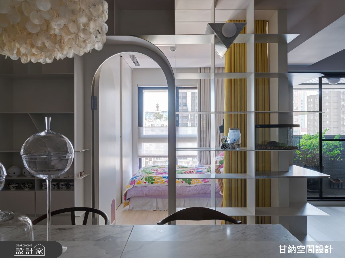 鐵件隔間形塑的白色拱門展示著Marimekko餐瓷與迪士尼收藏,上半層半穿透的鏤空手法引光入內,讓「光」經由臥室穿過鐵件格牆散射出溫暖光芒,漸層般地光束停留於天花板上,藉由室內純白色調的反射與渲染展演空間的變化,在人與人、人與自我相處的時刻,都因光的流瀉而感到安穩適切。在延伸水平向度視覺,衍生輕薄通透的空間感,需要時只要拉起窗簾,就能圍塑寢眠安全感。