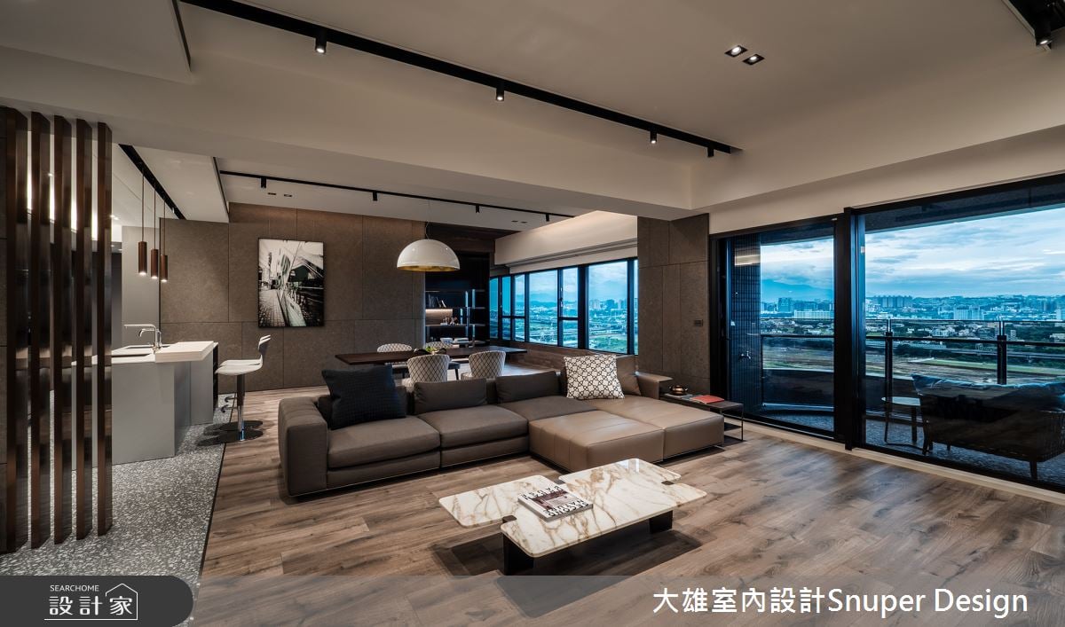 Home Data依循地理位置的河岸景緻,70 坪的現代風大宅拉低水平窗帶,將明亮採光與自然視野引進低調內斂的室內,襯托出大地色空間的質樸韻味,且透過木皮、石材、金屬和磨石子等異建材混搭,提煉家的舒適純粹。