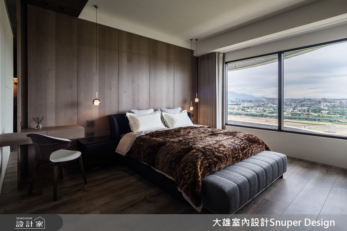 灰白大理石電視牆烘托居家高雅氣質,並適時加入下方的壁爐,替空間增添溫暖的大氣質感;長桌上方的大型吊燈及東京表參道的街景攝影作品,則在沉穩基調中跳脫出鮮明的空間性格。綠帶地平線延伸至主臥,臥房藉由沉穩溫暖的木質調,為居住者帶來無比的平靜,且搭配梳妝檯和更衣室,以完整的機能配置滿足所需。