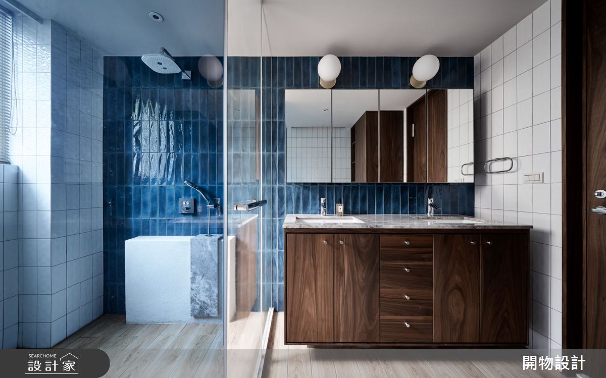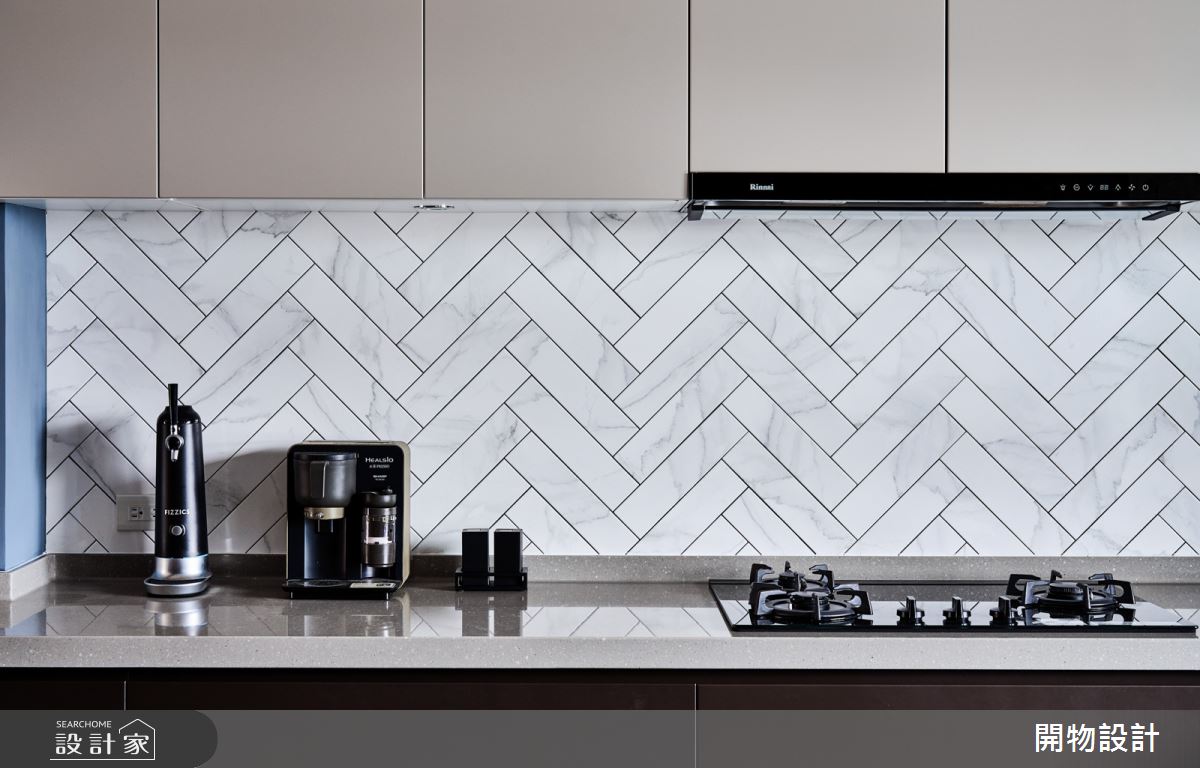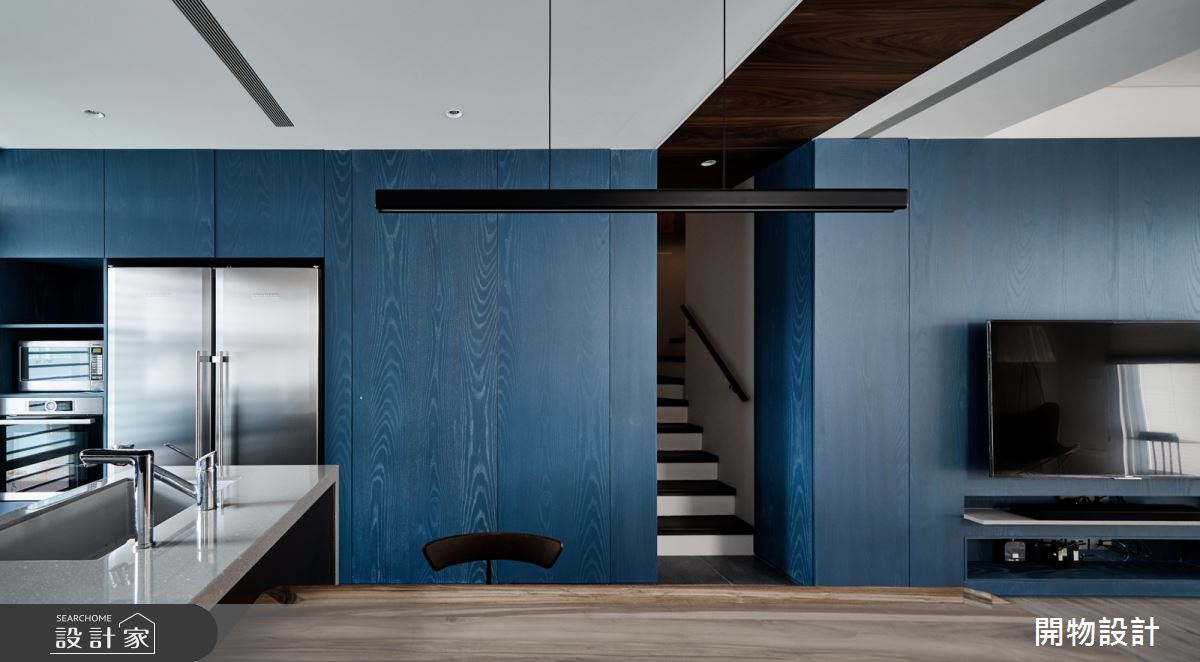 格局規劃上,透過樓中樓的架構,使重疊空間能發揮最大坪效,不但一家五口都能享有獨立空間,就連毛小孩都能快樂跑跳。採開放式格局,營造寬敞而通透的空間感,並注入莫蘭迪色系,透過暖灰和靛藍調和,援引自然流洩而下的光影,描繪出清新迷人的質感家居。餐廚區域,巧用人字拼妝點牆面,並透過中島吧台串連餐桌,賦予彈性而充沛的生活機能,成為和三五好友一同料理、聚會的舒適角落。