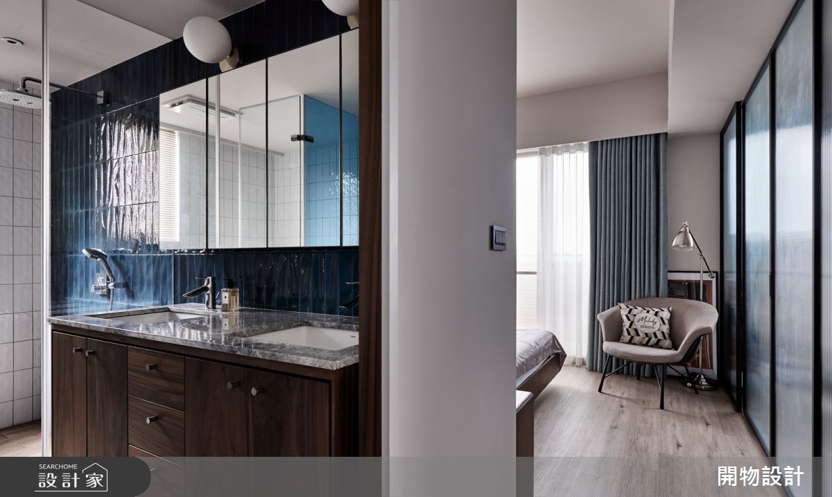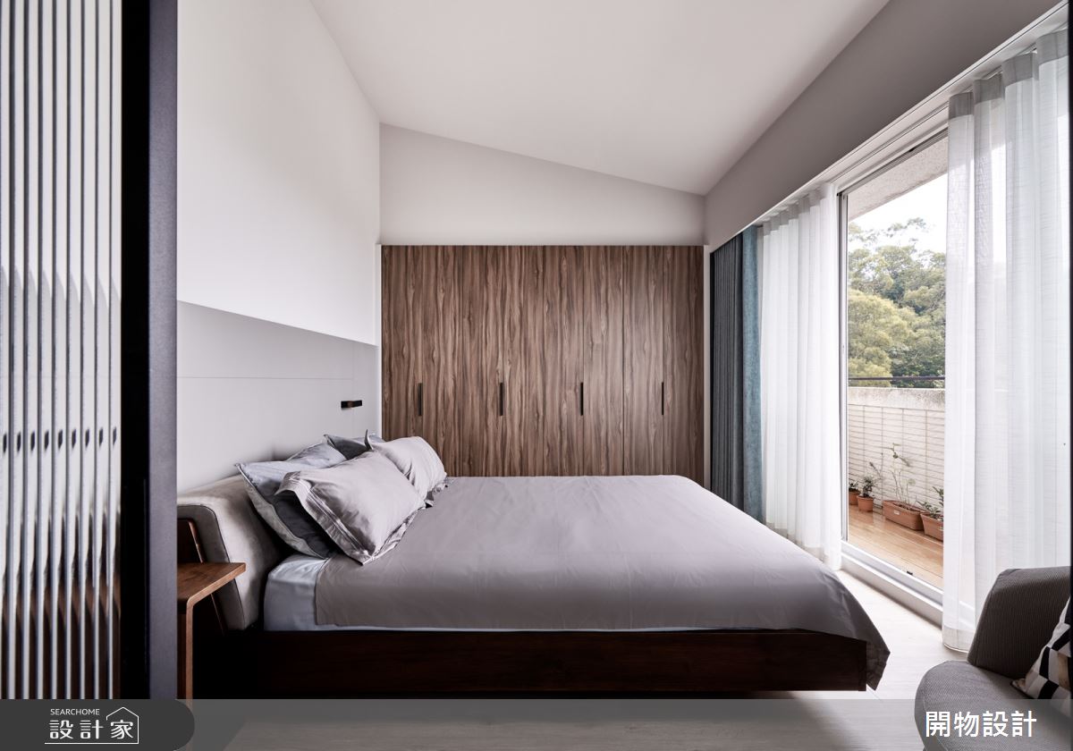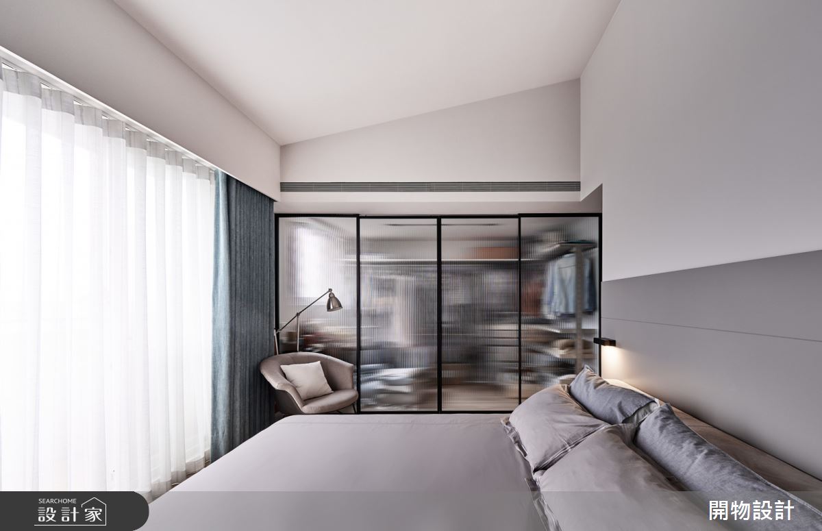 主臥內,拉開窗簾便拾獲山林美景,透過斜天花設計,去除低矮樓高的壓迫感,更衣室則以玻璃門片為屏,保有光線的穿透感,營造療癒又放鬆的休憩環境。