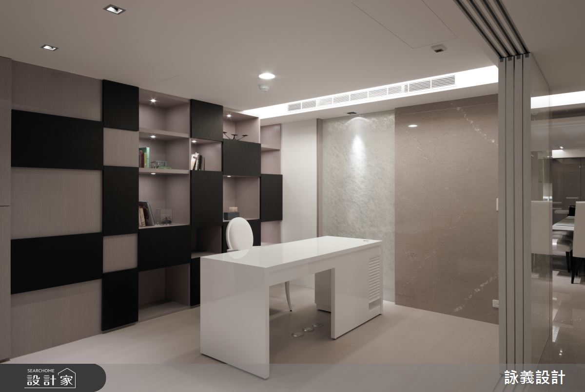 客廳取代制式電視牆,透過鑲嵌鏡面的牆體,達成空間的連貫延伸感,模糊了明顯境界,搭配光線投射的豐富變化,反射出趣味鏡面影像,而加入間接燈光的天花板,則變化出美好的空間層次,讓視覺上更具延續感及方向感,客廳的大面積玻璃窗景,更讓人可隨時收進美景,欣賞四季的不同變化;書房規劃彈性拉門,可隨心開放或獨立,保有個人空間感,並規劃簡潔有力的書桌量體,後方設計感十足的書櫃也豐富視覺焦點,提供居住者一個時尚、寬敞且絕對寧靜的閱讀辦公場域!