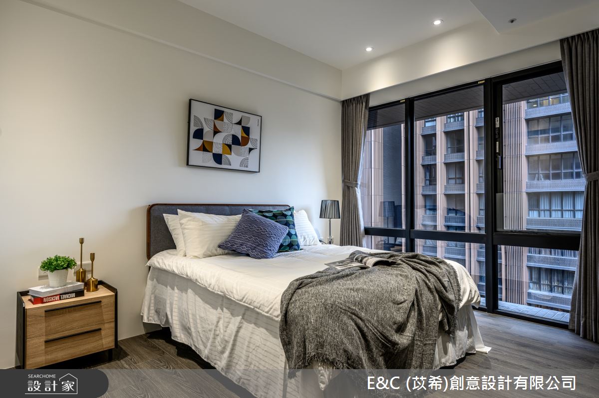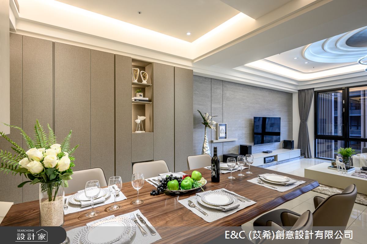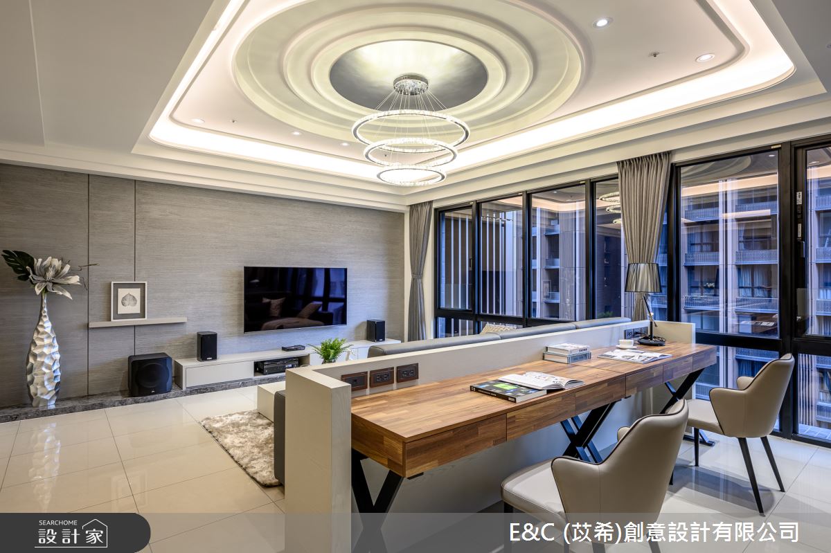 大門一入內,鞋櫃結合穿鞋椅讓穿脫更為方便,而延著柱子的雙面櫃,除了可放置鑰匙、信件等物品,轉到餐桌面則能收納常用餐具。開放式客餐廳與書房空間放大視覺尺度,由玄關延伸至電視牆的收納櫃體,展示與門片並存,既能擺放旅遊紀念品,雜物也能妥善收整。客廳天花依照屋主對於風水:天要圓、地要方的需求,現代的水晶燈,再搭配天花板的層次,讓原本的大樑融入在整體造型裡,破解風水上對於大樑的忌諱。轉入臥房,則以低調簡約設計,以及柔和的燈光打造舒眠氛圍。
