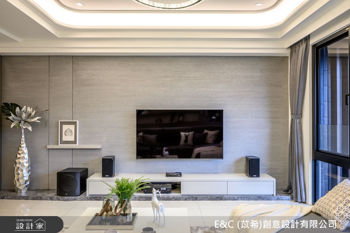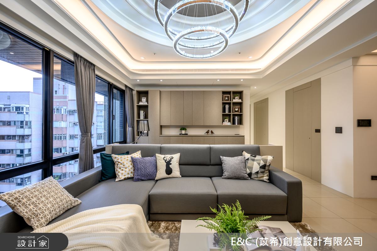 客廳圓形現代水晶燈,讓人一進入室內就有氣宇軒昂的感受,除了化解風水忌諱,更是空間焦點。