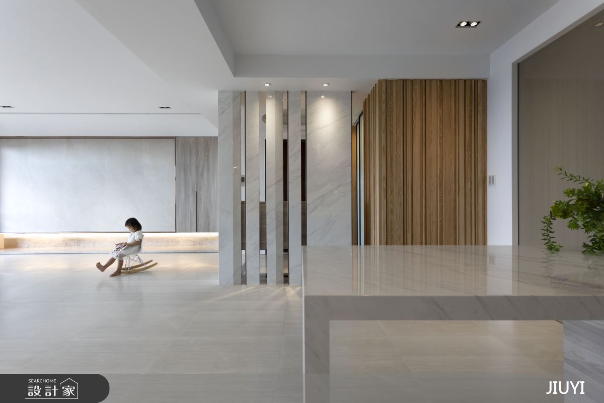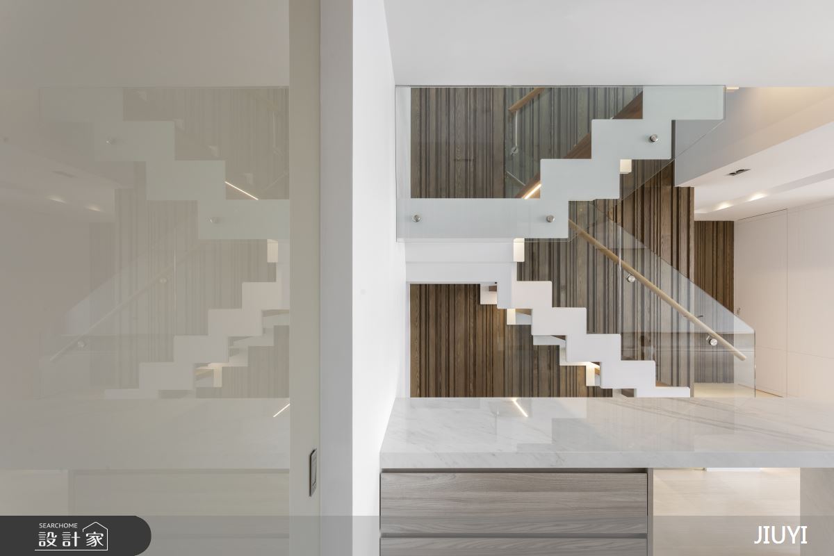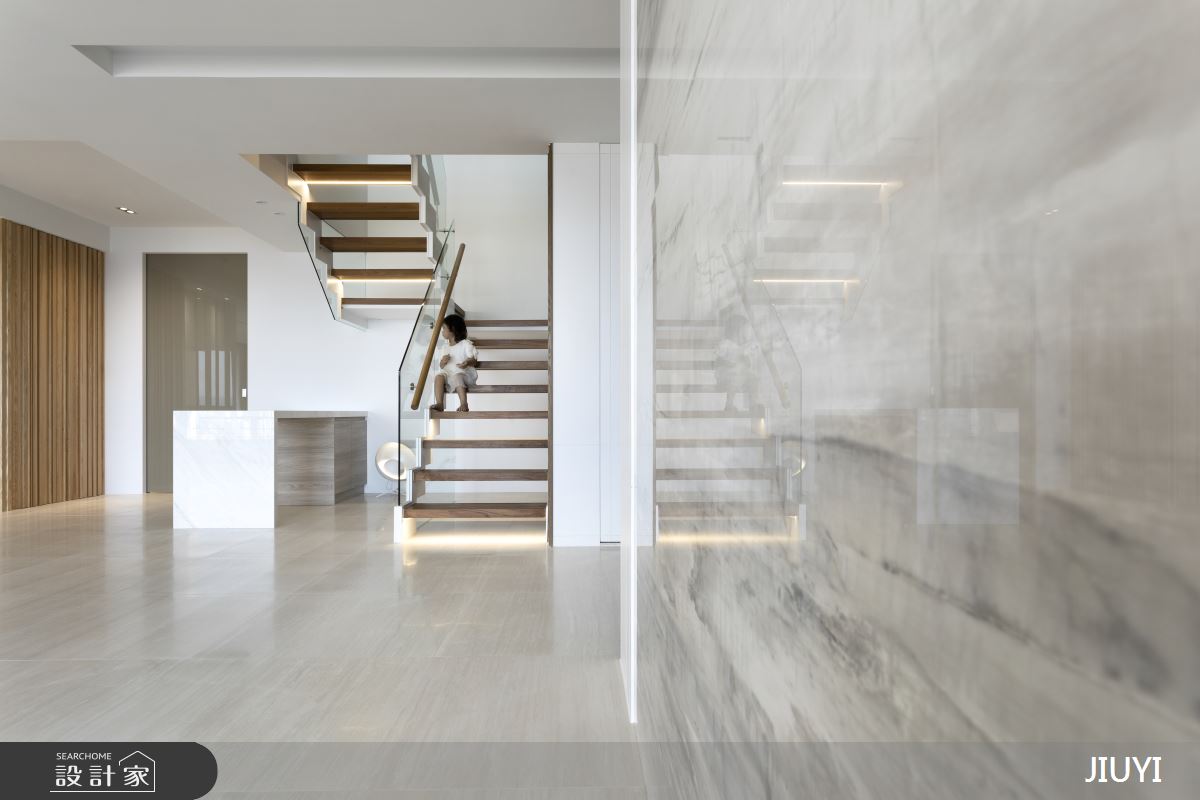 寬敞的公共場域以純白色為主調,搭配大面落地開窗引自然光入室內,營造開闊透明的視覺感受。光線照耀在不同材質紋理上所產生的陰影增添空氣律動,而白底灰紋的大理石款式則增添純白家居的表情,展現同色系卻不同建材的多元肌理,豐富空間意向。天花原本突兀的大樑透過壁面與地坪的線條美化,形成立體有型的量體,化為空間設計感。樓梯扶手護欄特意挑選玻璃,詮釋輕盈透亮調性,也呼應窗外明亮採光,其梯面下方隱藏光帶,暖色光漾襯托木質感的溫馨氛圍,最後側面大面積木牆設計替白冷空間點綴暖心底蘊,垂直浮凸的設計更呈現有如森林般的群木豎立意象。